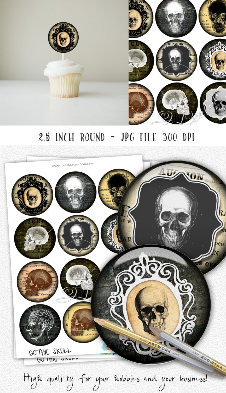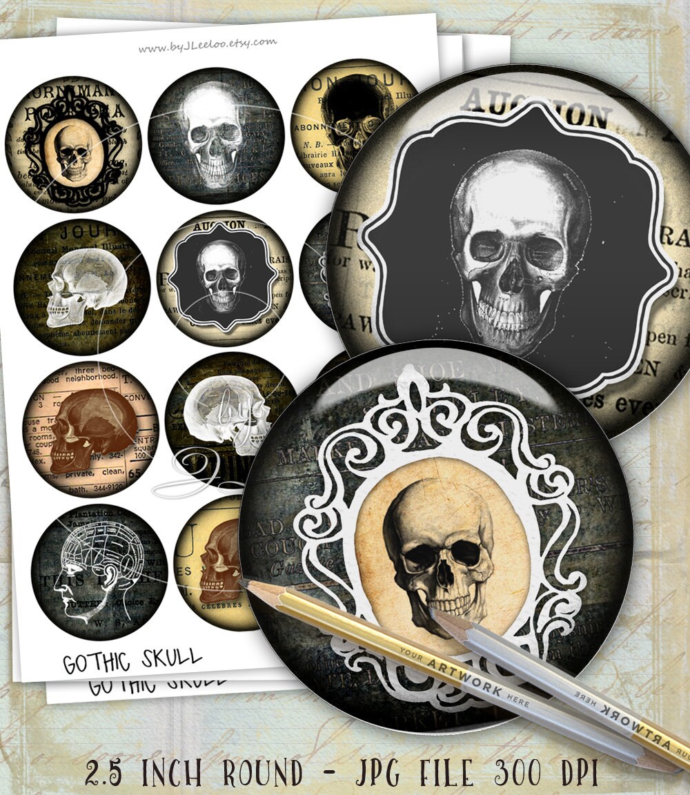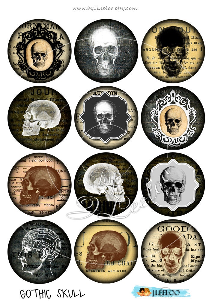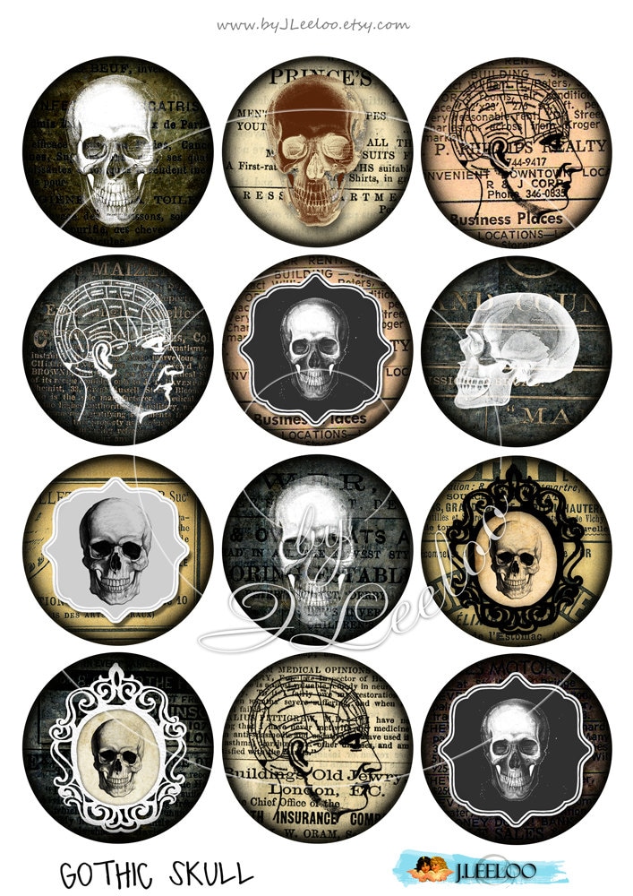 GOTHIC SKULL - Instant Download - Digital paper printable - Digital collage sheet circle digital images for pendants, jewelry and your craft and artwork.