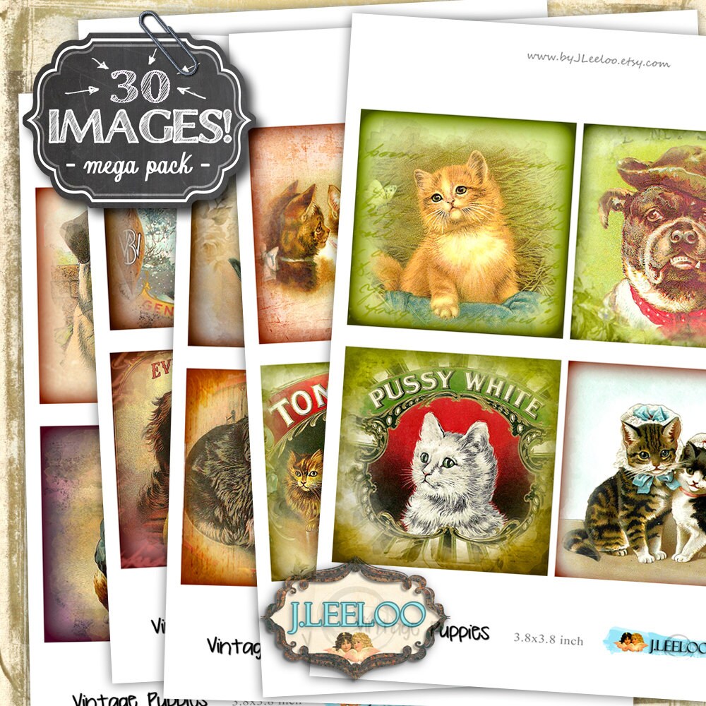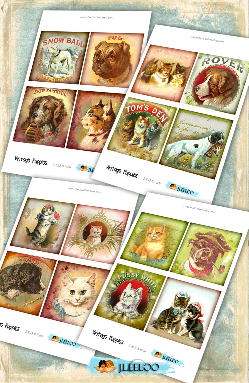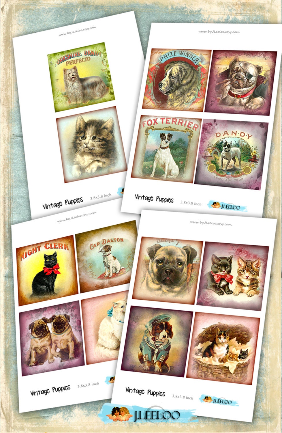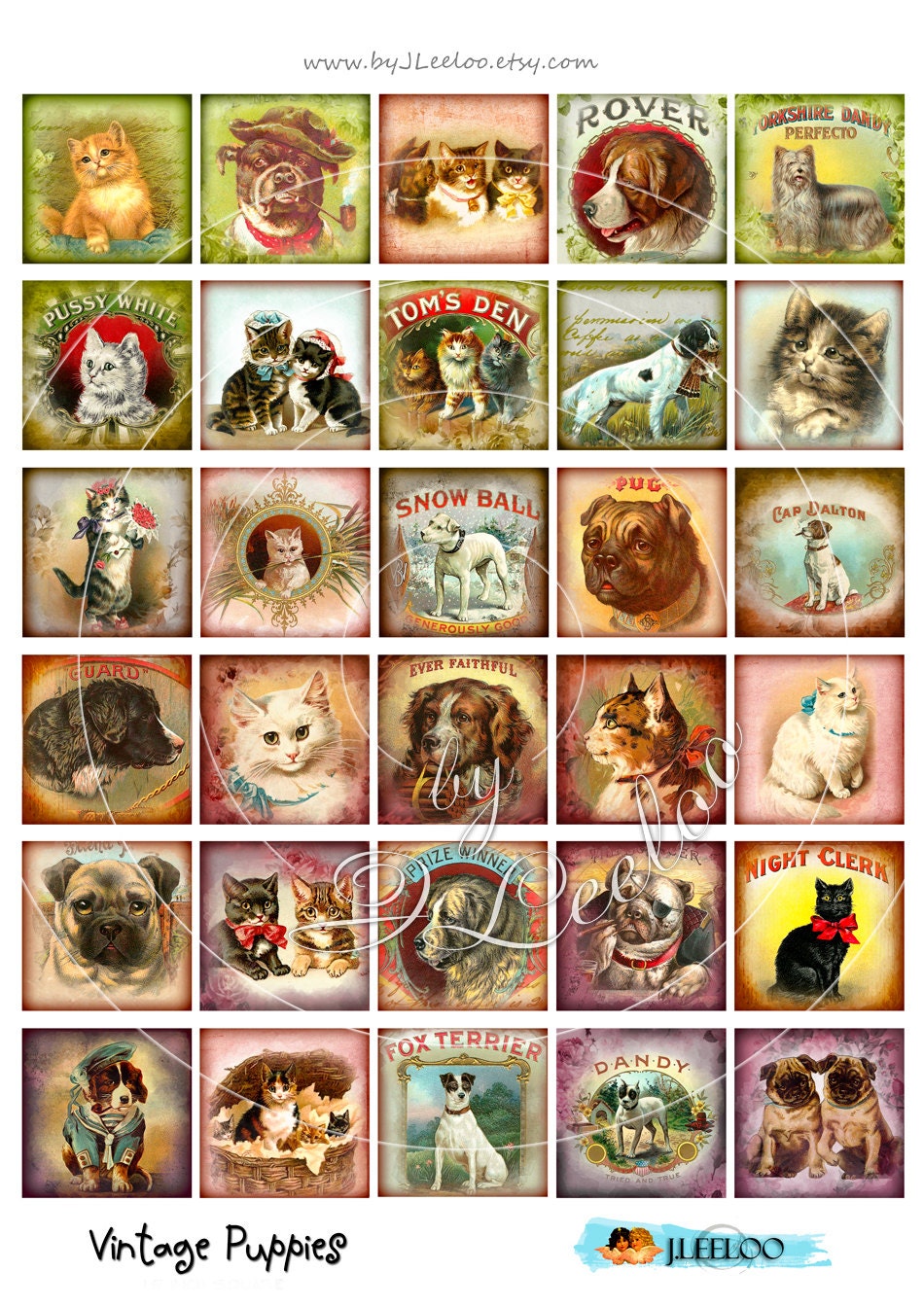 VINTAGE PUPPIES Instant Download - Digital collage sheets - Squares printable images for coaster, jewelry holder, hang tags, stickers and all your craft project.