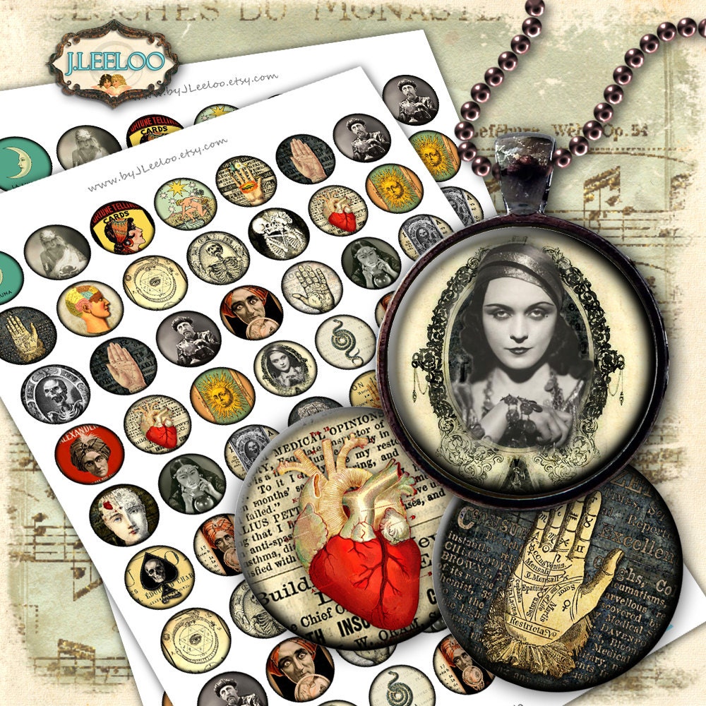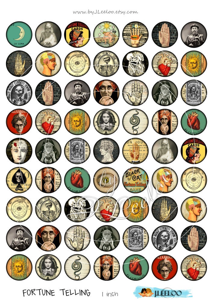 FORTUNE TELLER Digital collage sheets - Circle images download to print for jewelry, resin pendants, glass cabochon, charms, magnets, stickers, scrap book, hang tags, a great supply for your craft project.