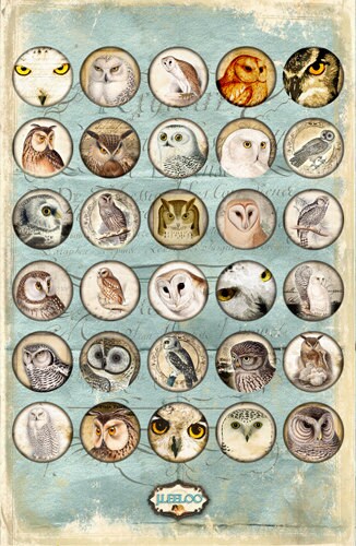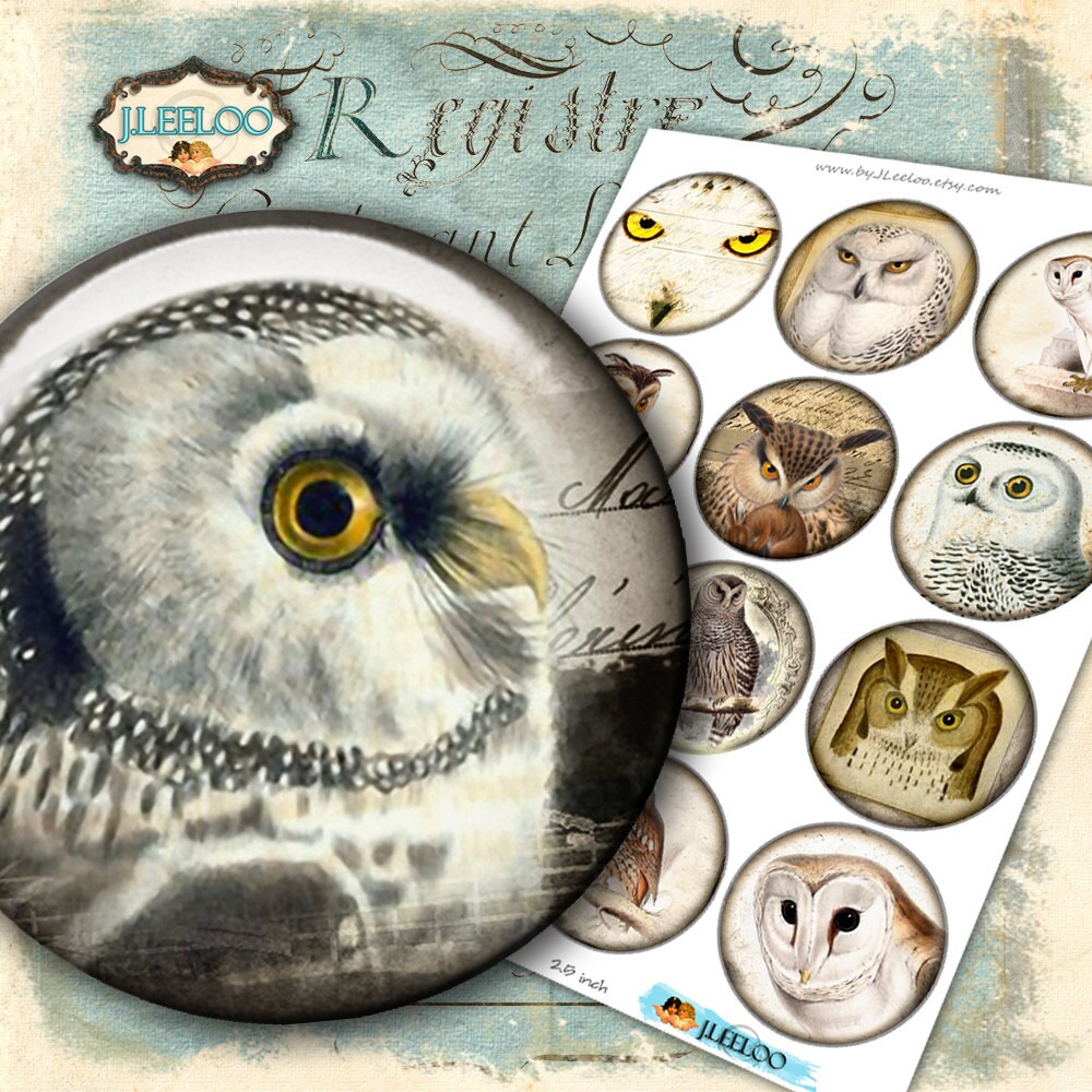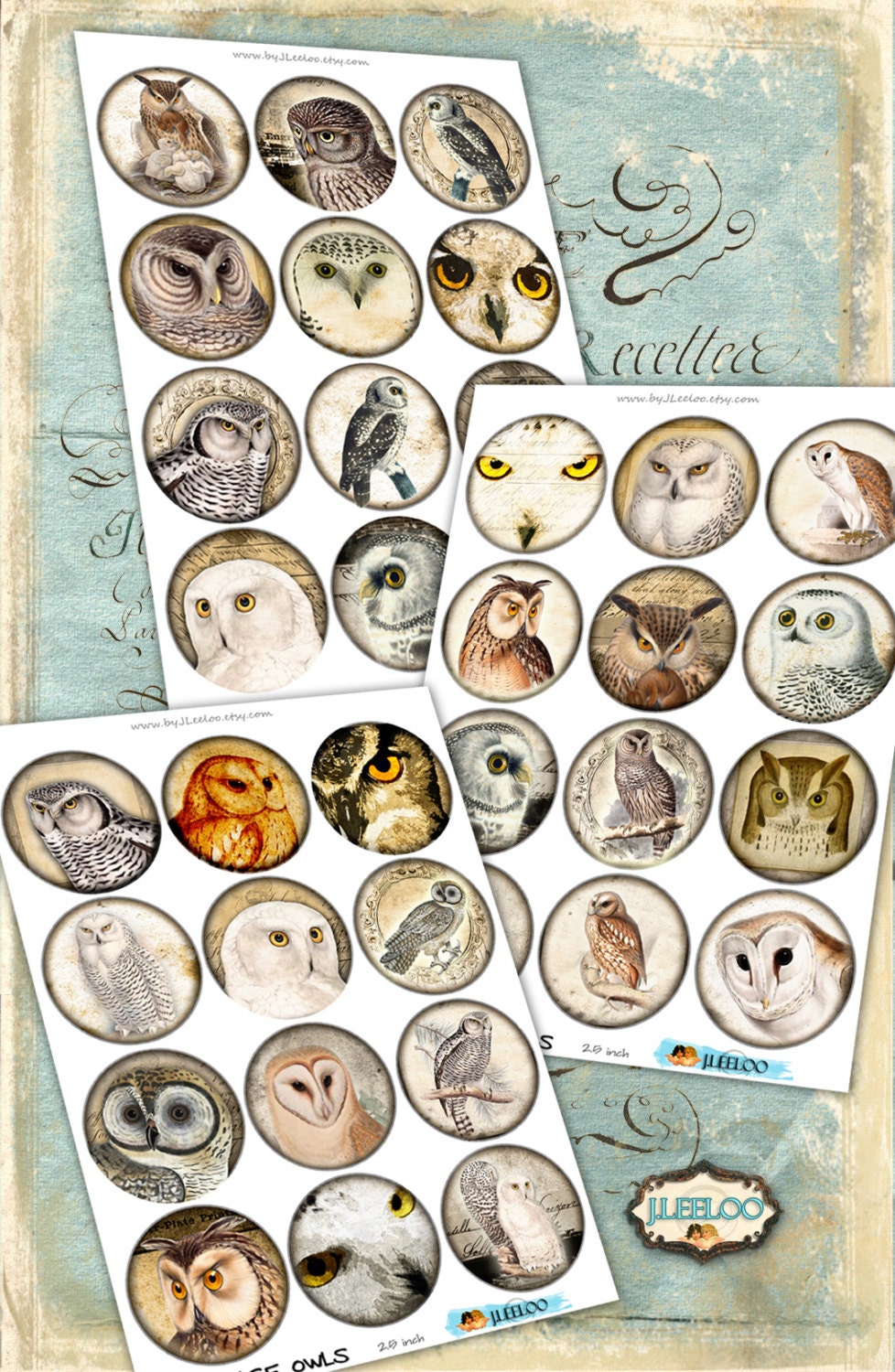 VINTAGE OWL Instant Download - Circle Hoot images digital collage sheets - Owl digital papers - Round images for pocket magnets stickers cupcake topper