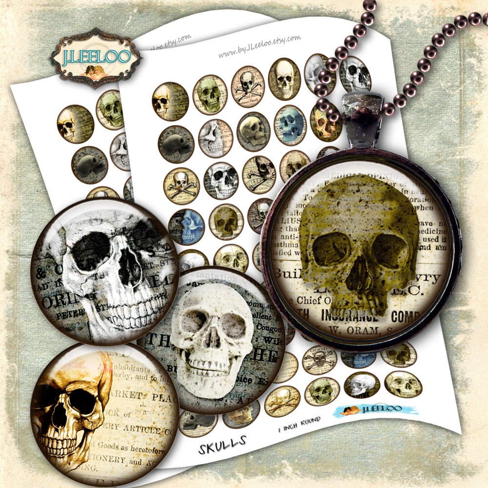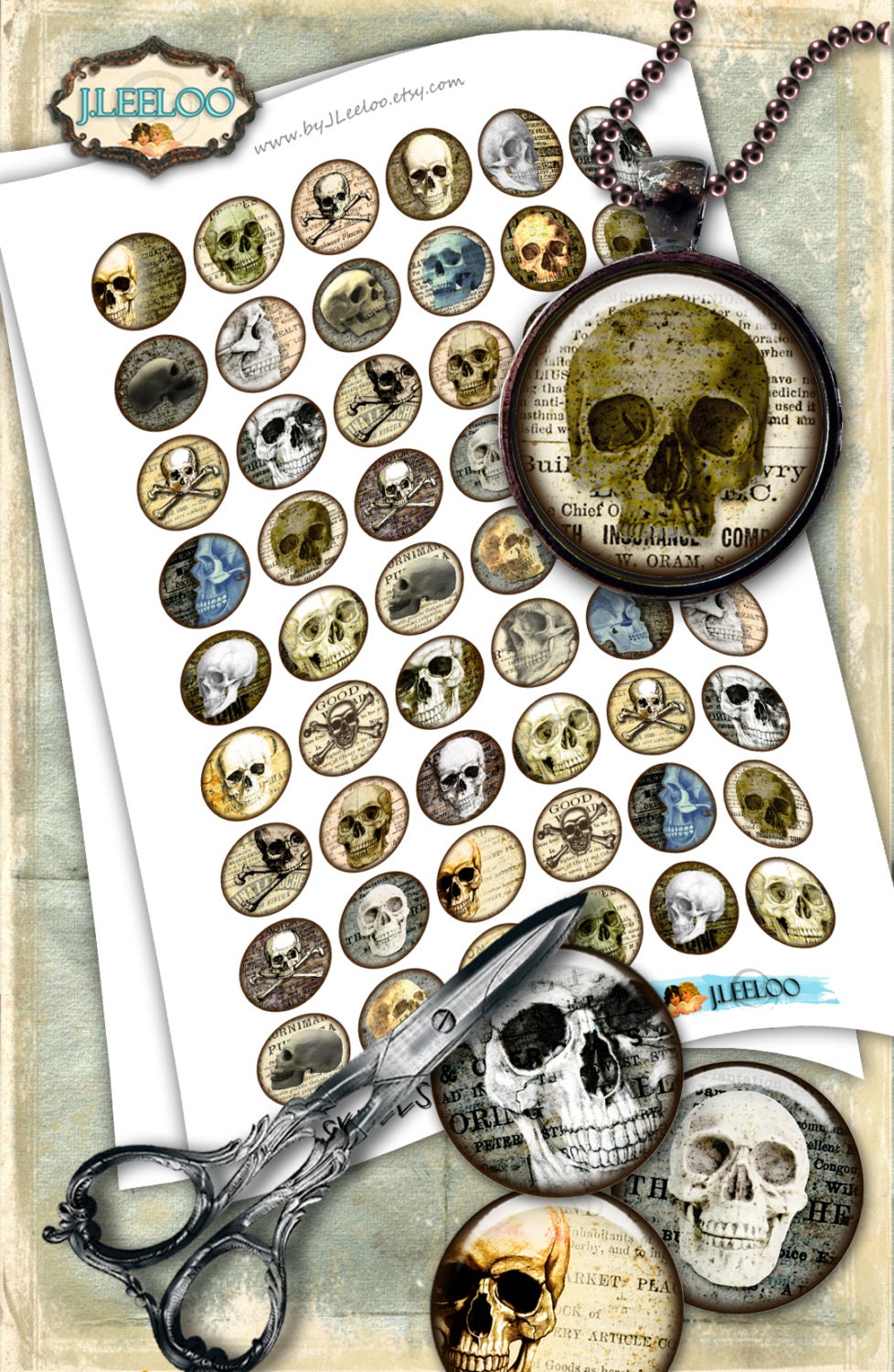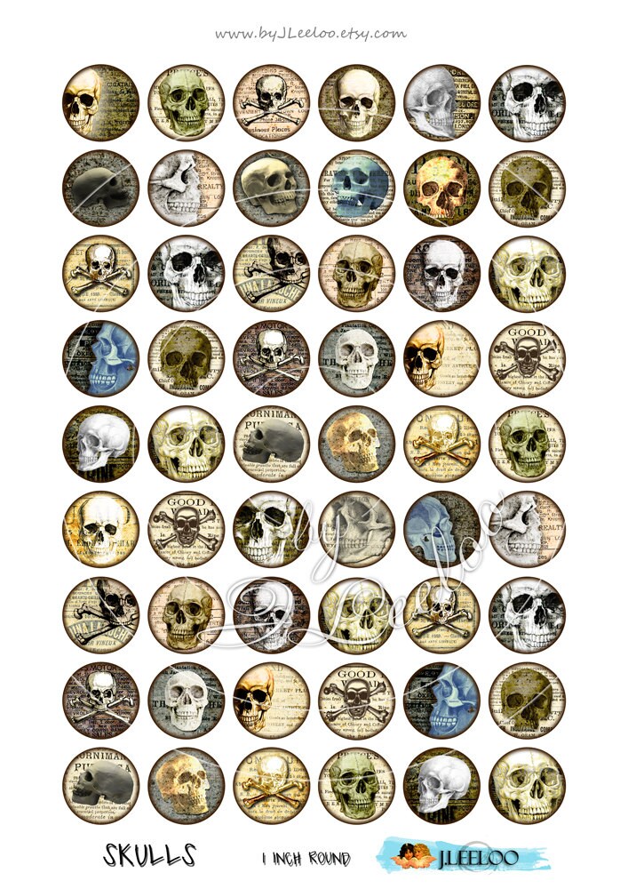 SKULLS - Instant Download - Digital paper printable - Digital collage sheet rouds digital images 1 inch for resin pendant, bezel trays, scrapbook, jewelry and your craft and artwork.