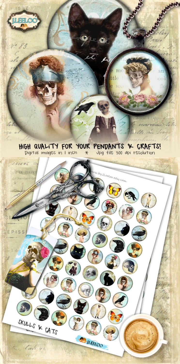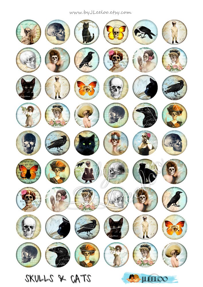 SKULLS AND CATS - Instant Download Digital collage sheets printable - Digital paper circle digital images 1 inch for pendants, pendant bottle caps bezel trays magnets and your craft