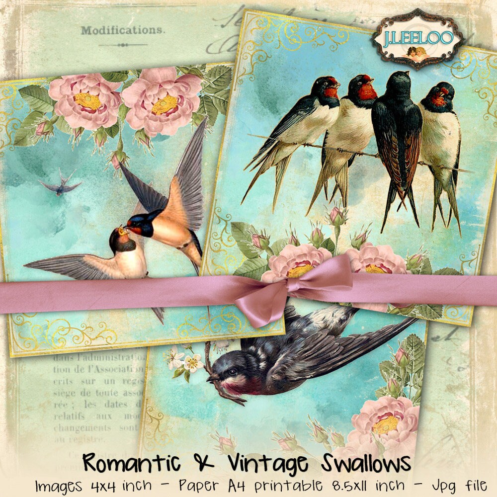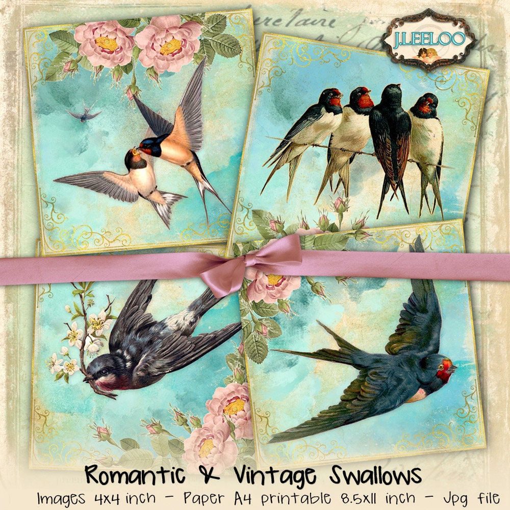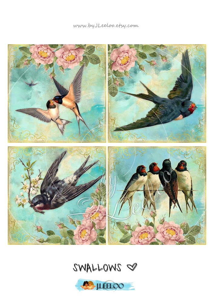 SWALLOWS Instant Download - Digital collage sheets - Square printable images for coaster, jewelry, glass cabochons, greeting cards, stickers, hang tags and all your artwork.