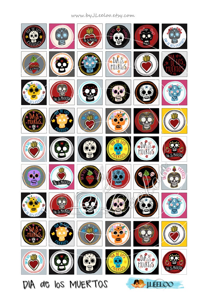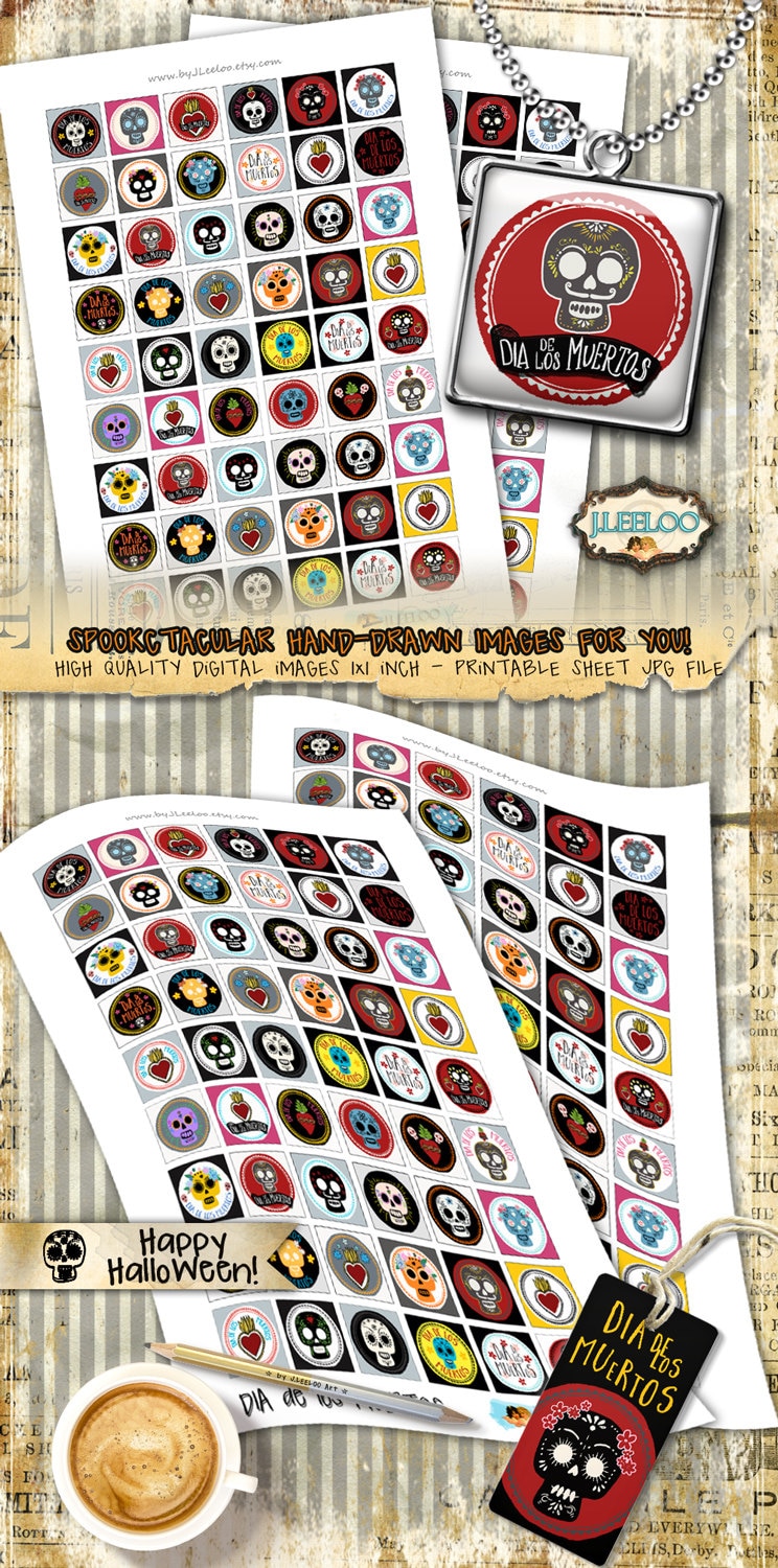 DIA DE LOS MUERTOS Digital collage sheets - Hand Drawn square images instant download ready to print for your jewelry making, resin pendants, magnets, bezel trays, bottle caps, cabochon, stickers, scrapbook and your others craft project.