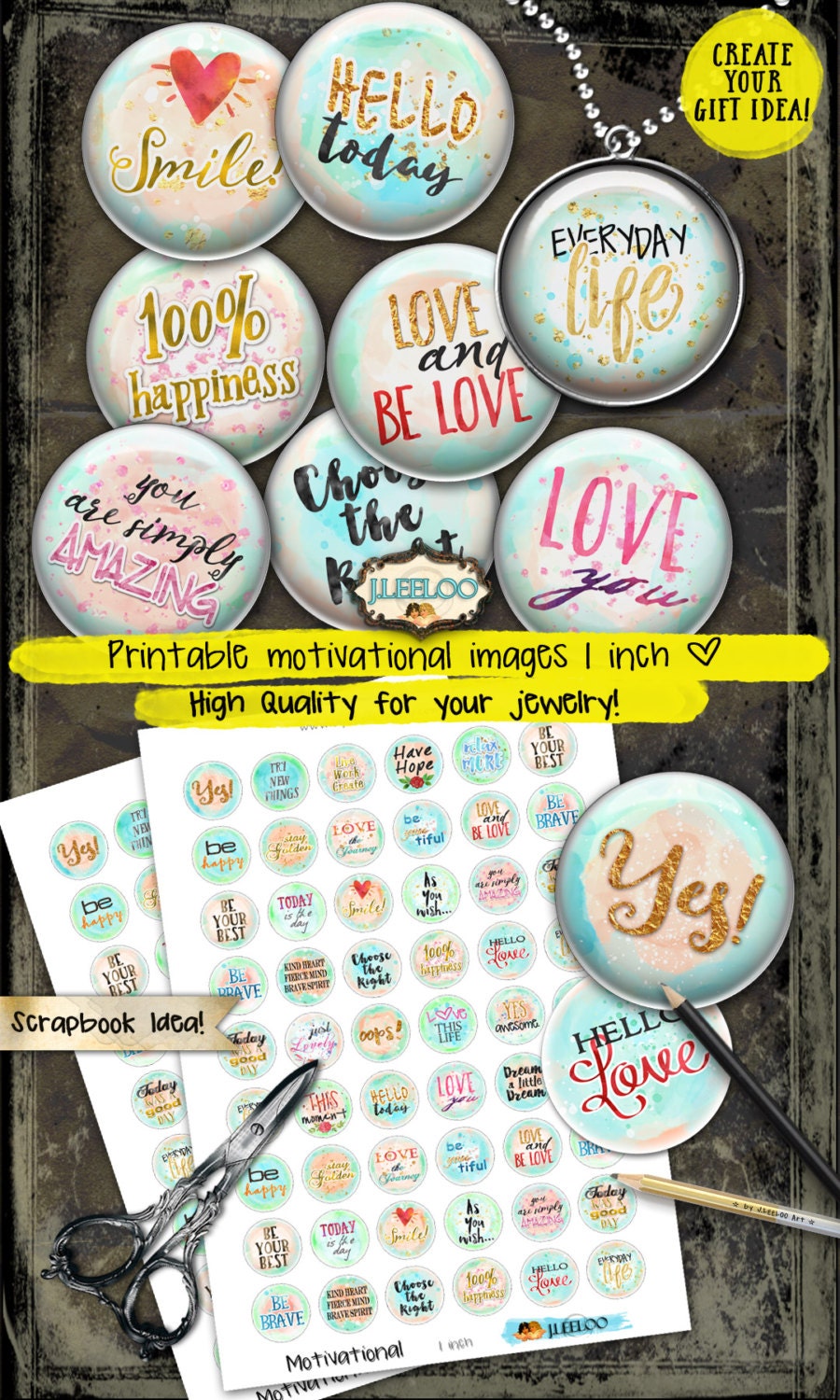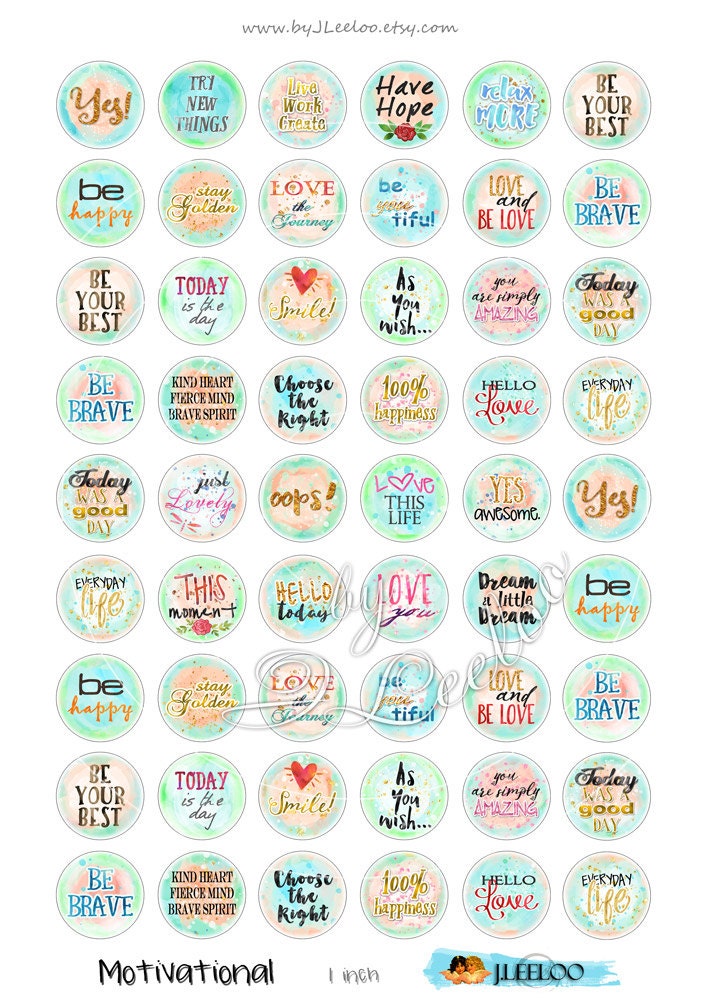 MOTIVATIONAL Instant Download - Digital collage sheets - Circles printable watercolors images for resin pendants, charms, card making, button, magnets, stickers and all your craft project.