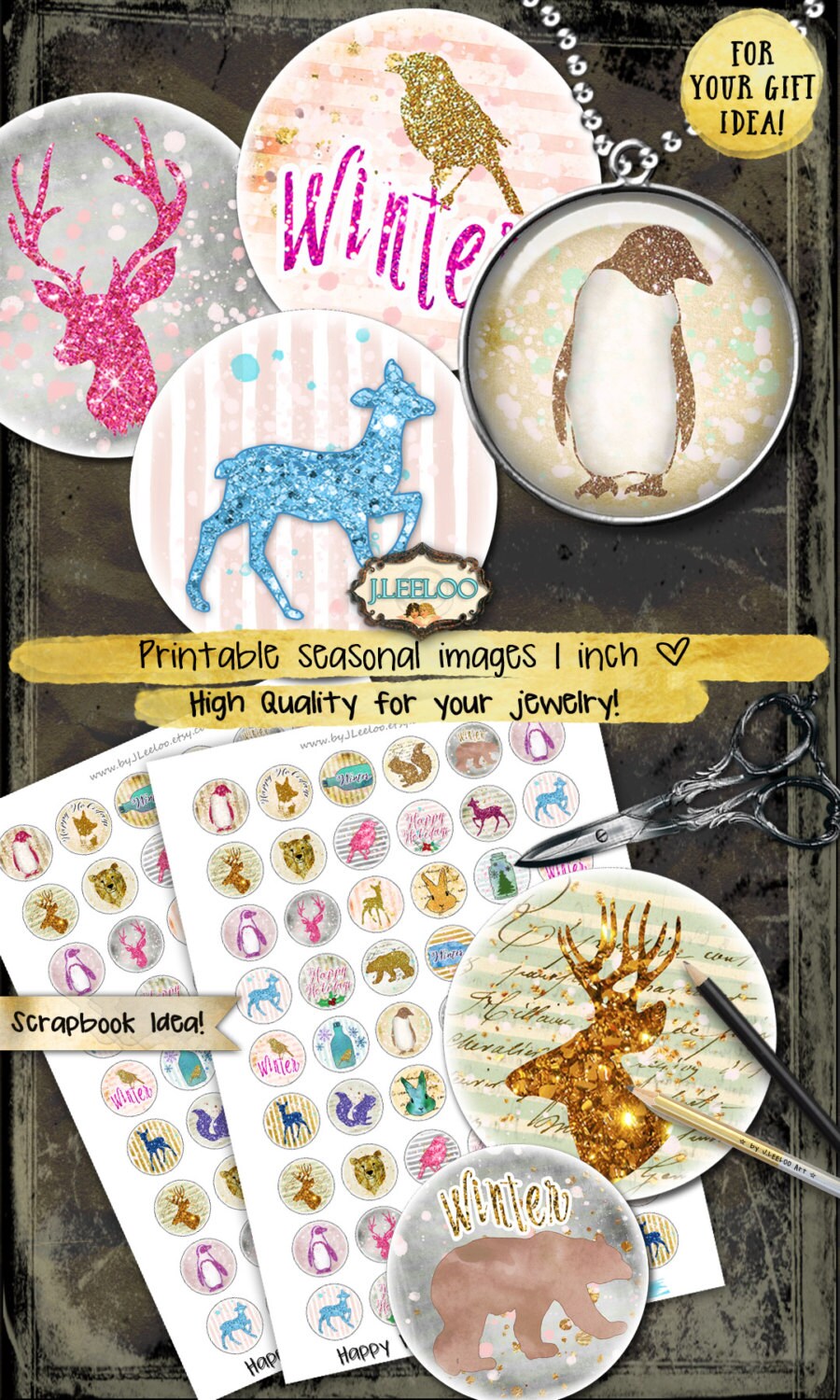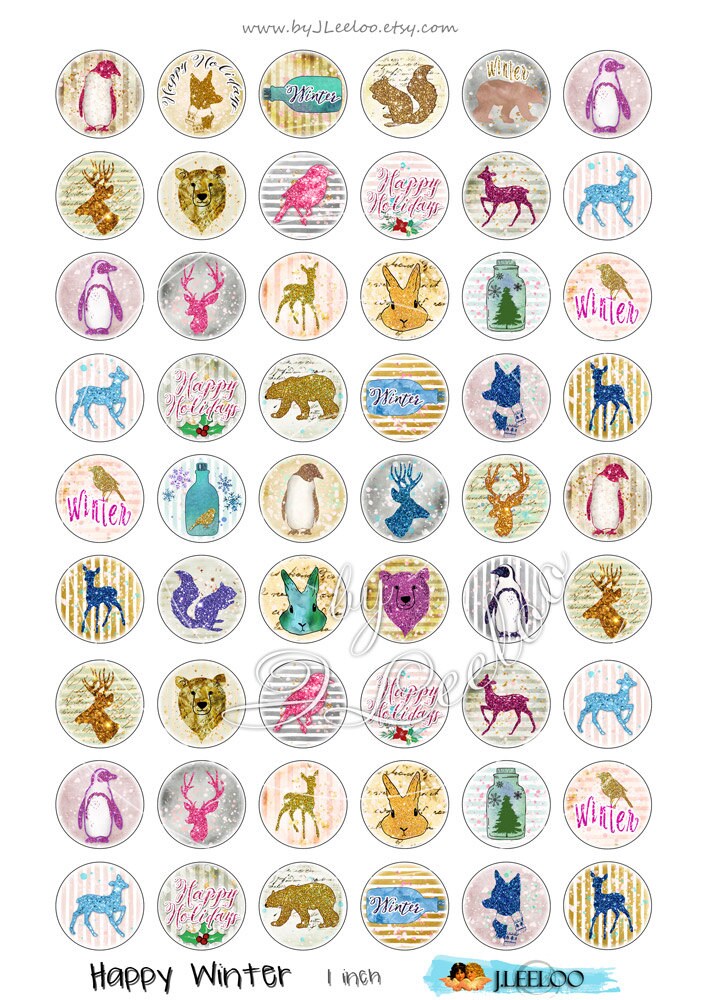 HAPPY WINTER Instant Download - Digital collage sheets - Circles printable glitter images for resin pendants, charms, card making, button, magnets, stickers and all your craft project.