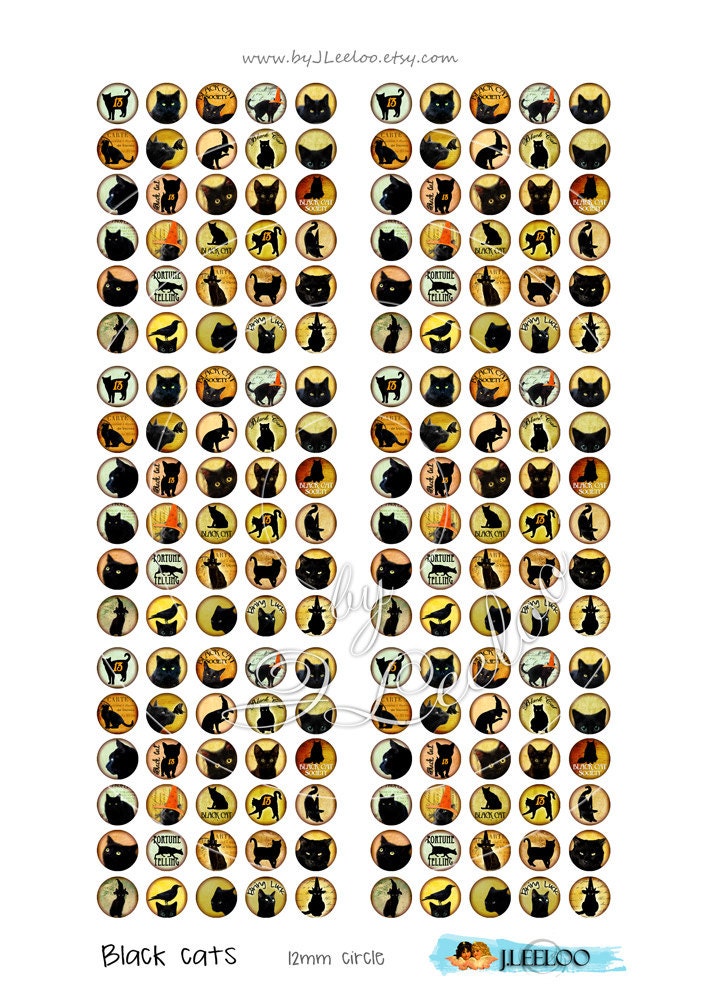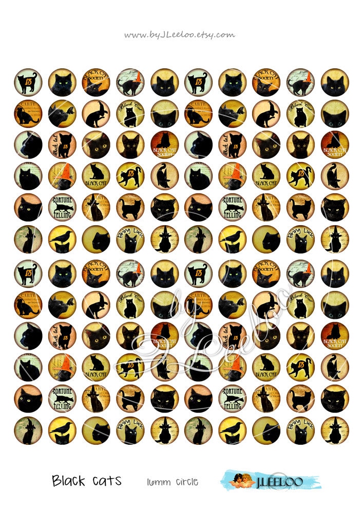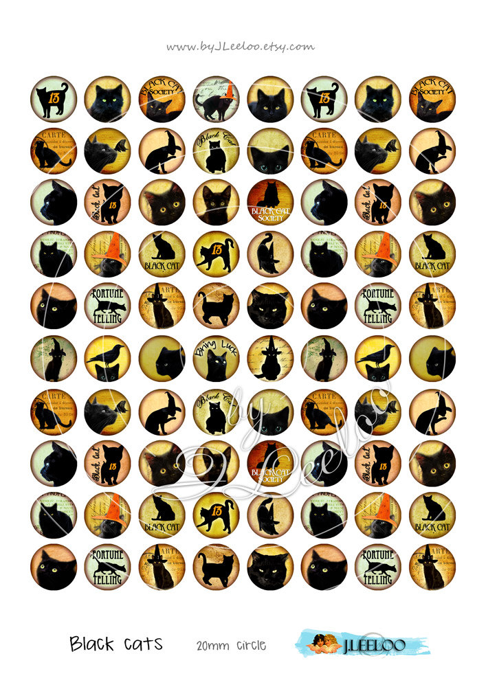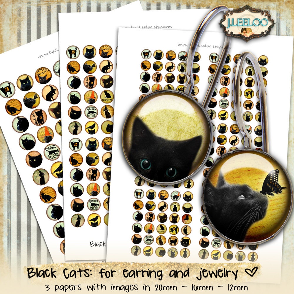 BLACK CATS - Digital collage sheets - Circles images instant download ready to print for your jewelry making, bracelets, resin pendants, rings, earrings and button, for magnets, stickers, scrapbook and your others craft project.