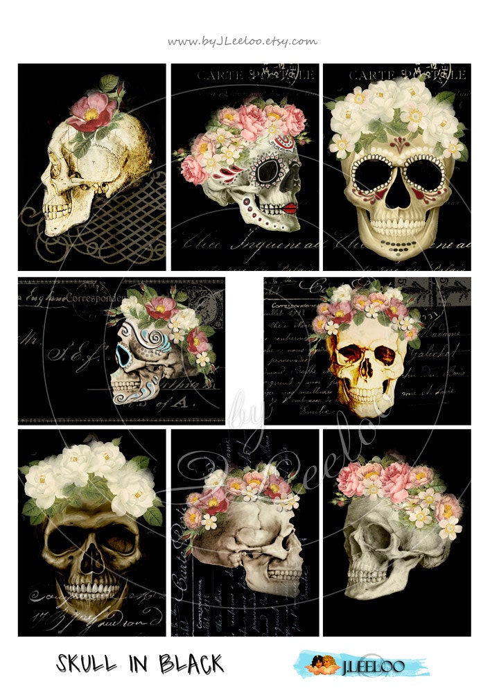 SKULL IN BLACK Digital Download - Printable digital collage sheet - Paper for your artwork: scrapbook, diary art, hang tags, jewelry holders, invitations or annuncements, greetings cards or backing cards.... for your creativity!