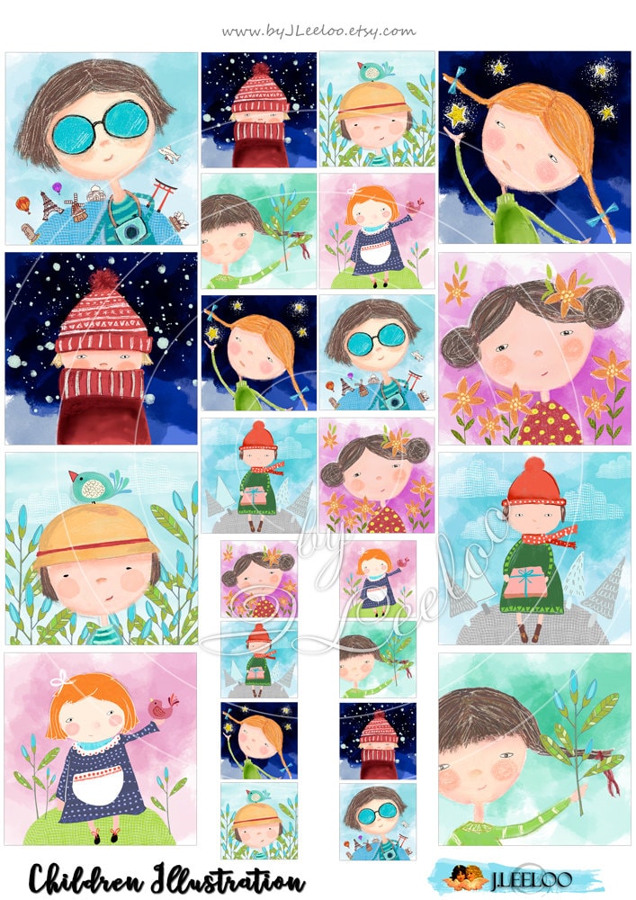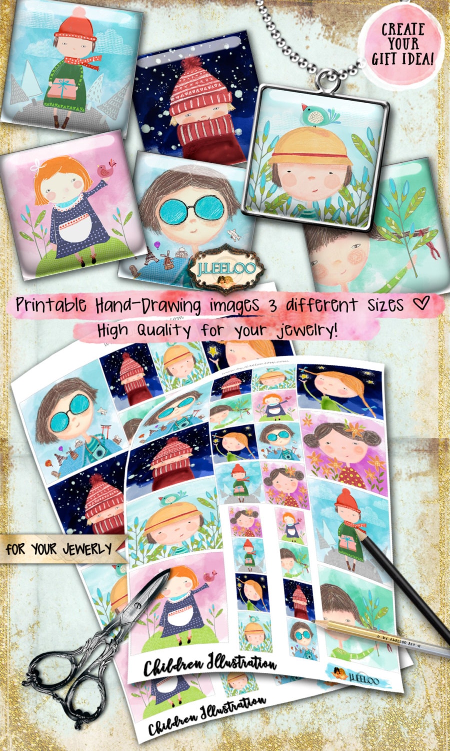 CHILDREN ILLUSTRATION hand-drawn Instant Download - Digital collage sheets - Square printable images for coaster, jewelry, glass cabochons, bottle caps, stickers, hang tags and all your artwork.