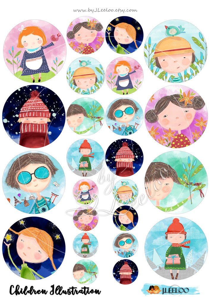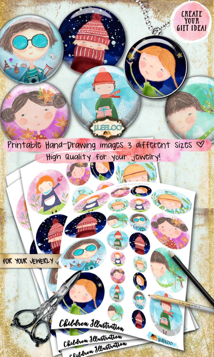 CHILDREN ILLUSTRATION hand-drawn Instant Download - Digital collage sheets - Circles printable images for coaster, jewelry, glass cabochons, bottle caps, stickers, hang tags and all your artwork.