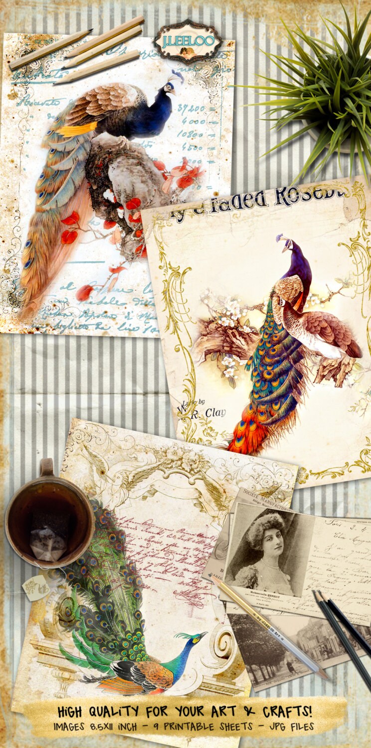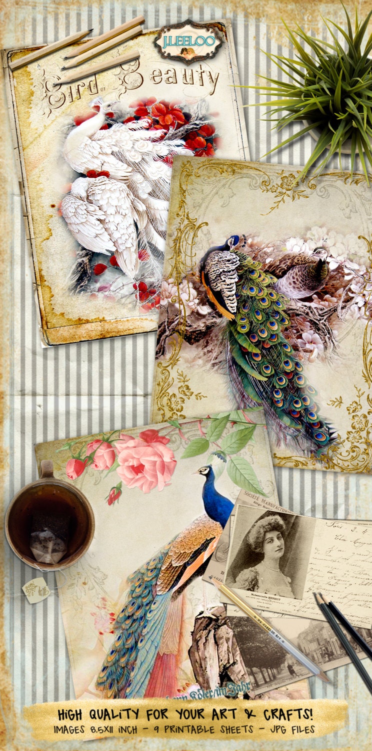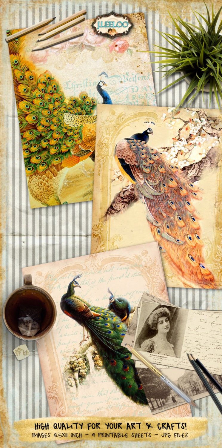 LOVELY PEACOCKS Digital collage sheets: download and print for card making, iron-on transfer, hang tags, labels, scrapbook, jewelry holders and your others craft projects.