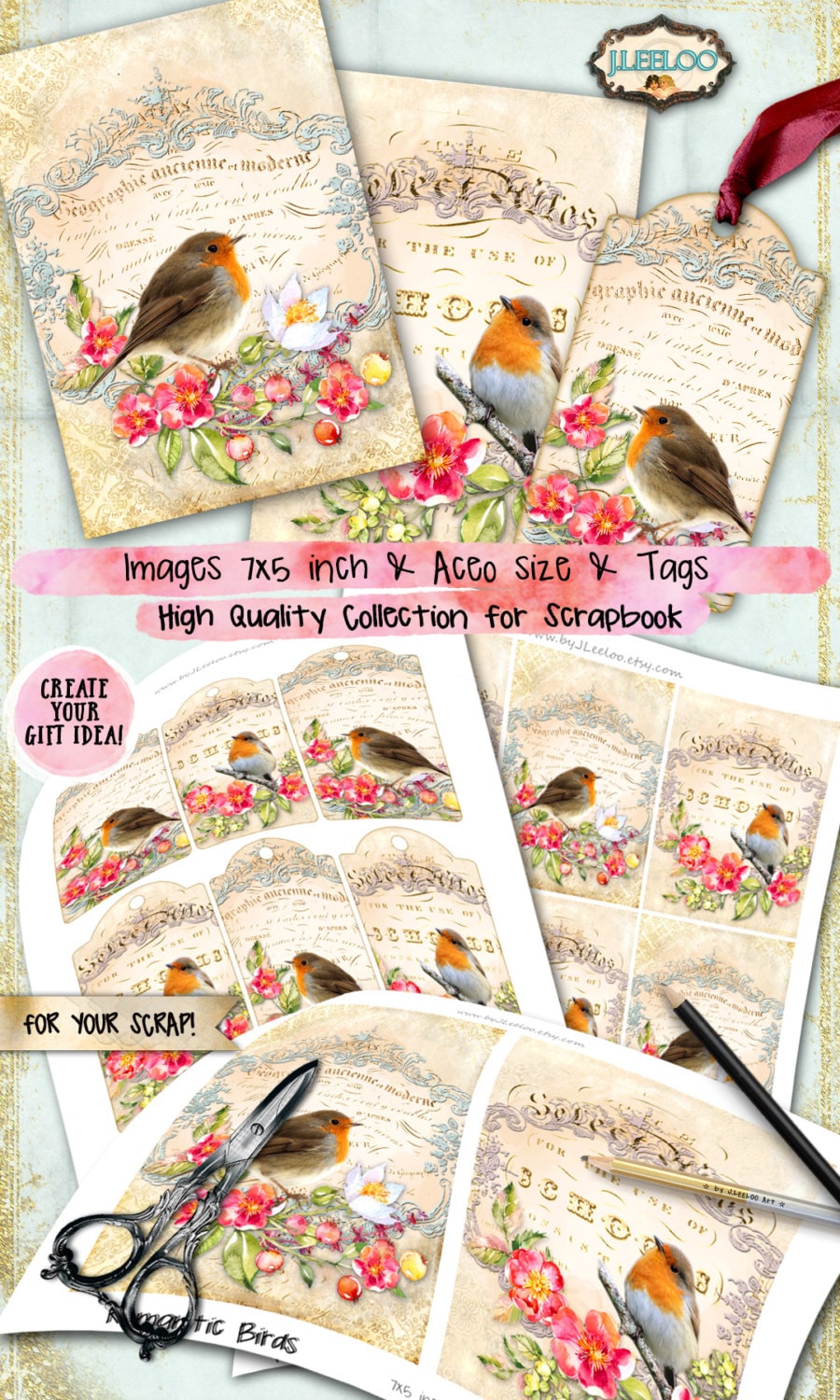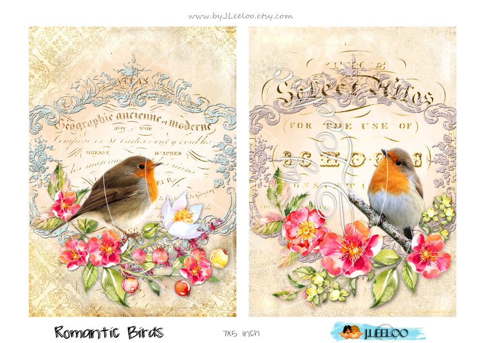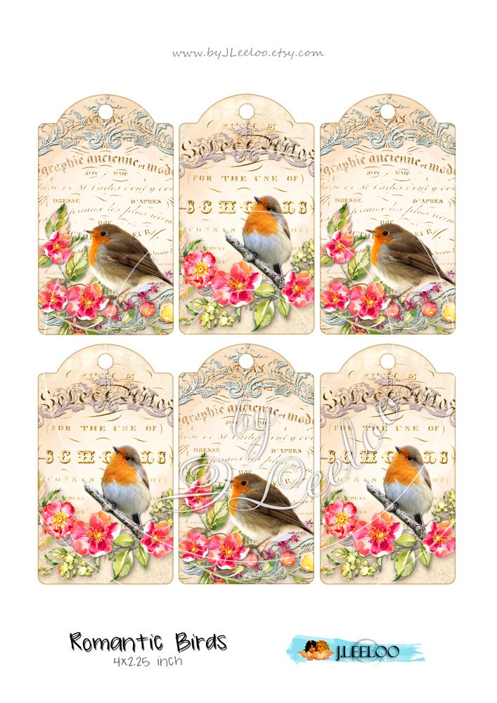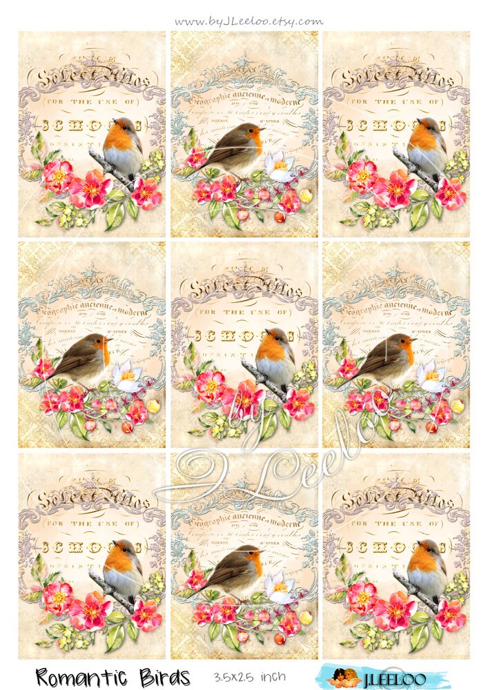 ROMANTIC BIRDS printable card tag digital papers scrapbook instant download printable Digital collage sheet