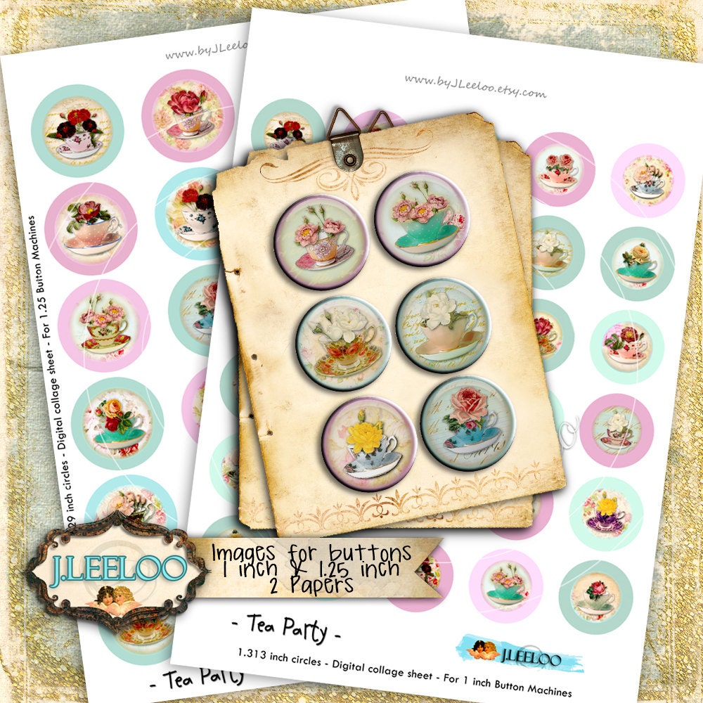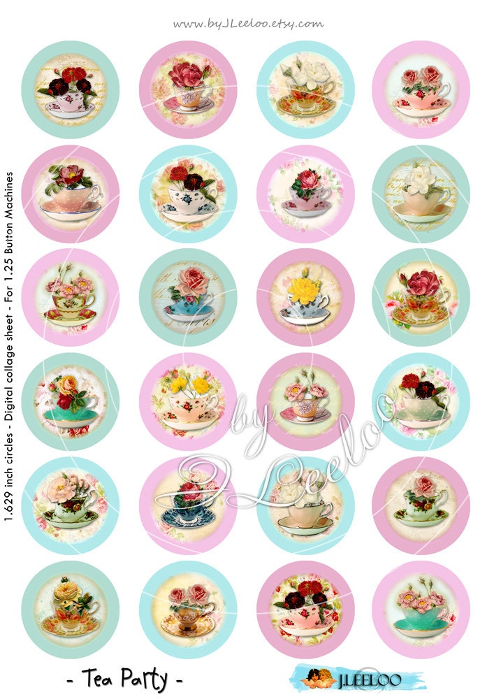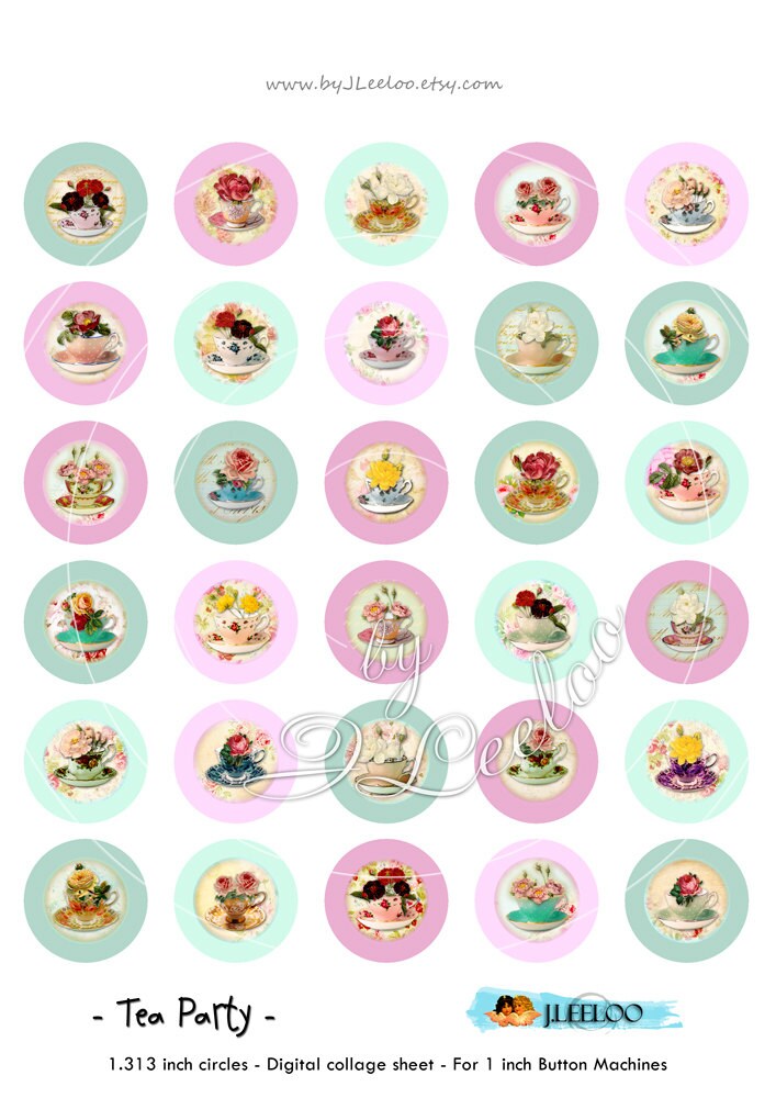 TEA PARTY Instant Download - Digital collage sheet - Digital papers - 1.313 and 1.629 inch circle images for button machine, round clipart for jewelry, craft and artwork.