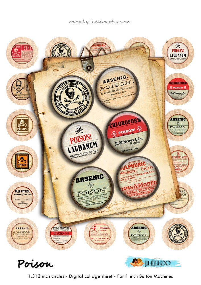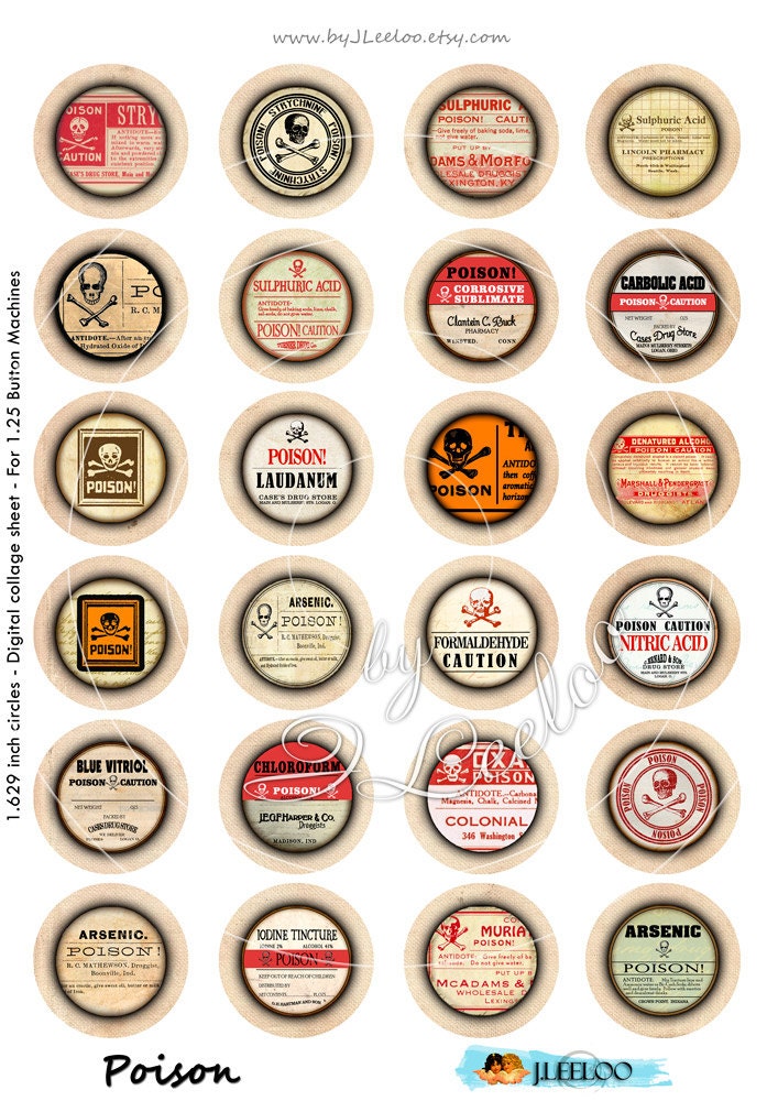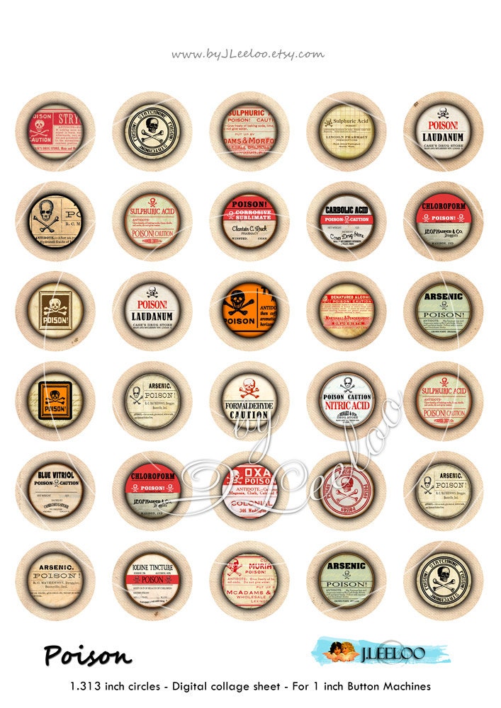 POISON Instant Download - Digital collage sheet for button machine,- Digital paper apothecary label scary halloween - Circle images round clipart for jewelry, craft and artwork.