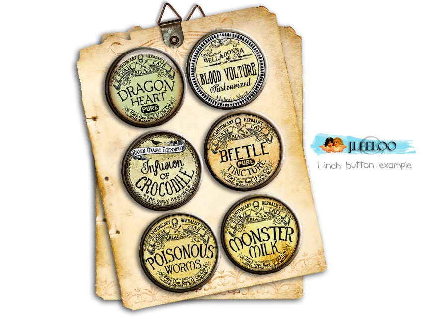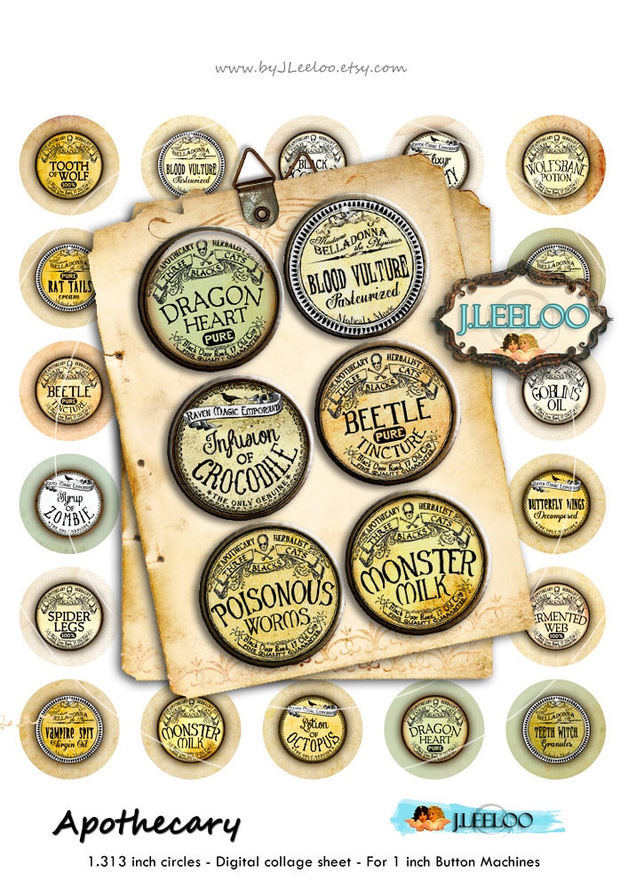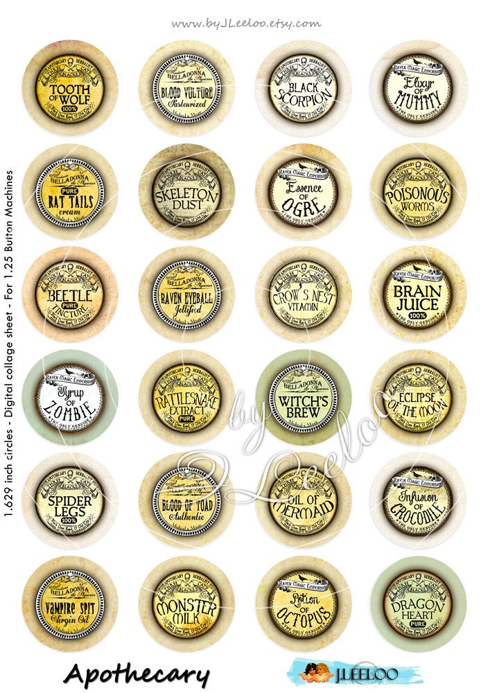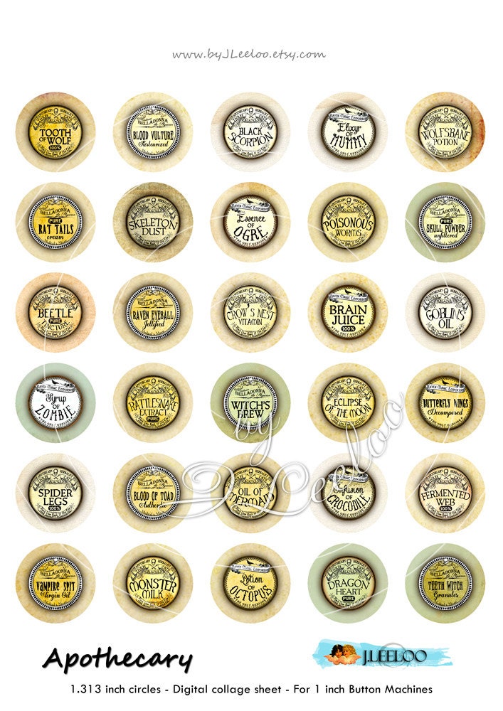APOTHECARY Instant Download - Digital collage sheet for button machine,- Digital paper apothecary label scary halloween - Circle images round clipart for jewelry, craft and artwork.