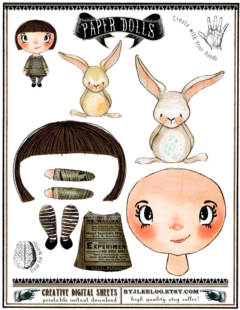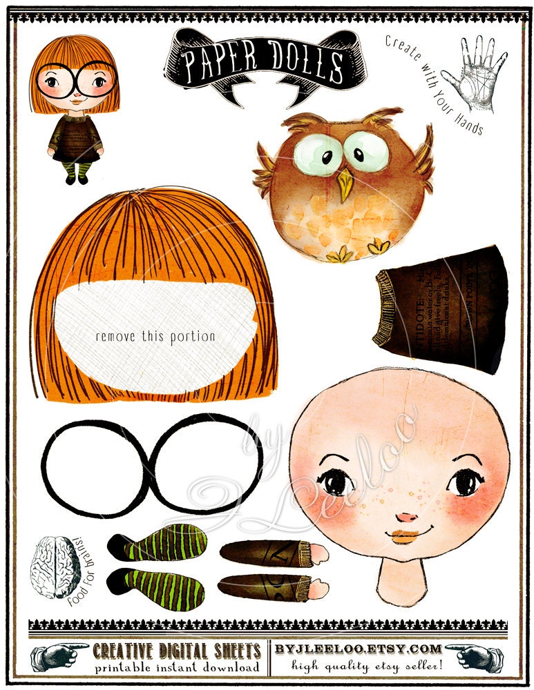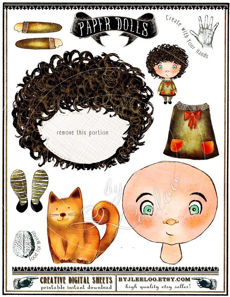 Digital collage sheet doll - Digital paper hand-drawn printable paper doll for your artwork and crafting project - Altered art, steampunk, scrpbook, vintage project etc... free your imagination!