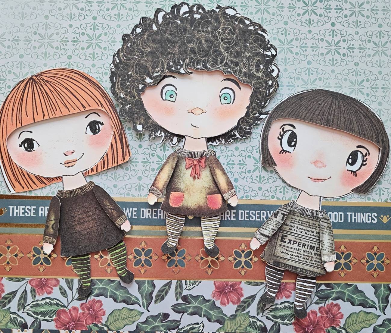 they are 3 different hand-drawn paper dolls, height of about 7", with 3 different friends :)
