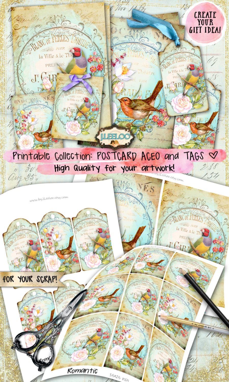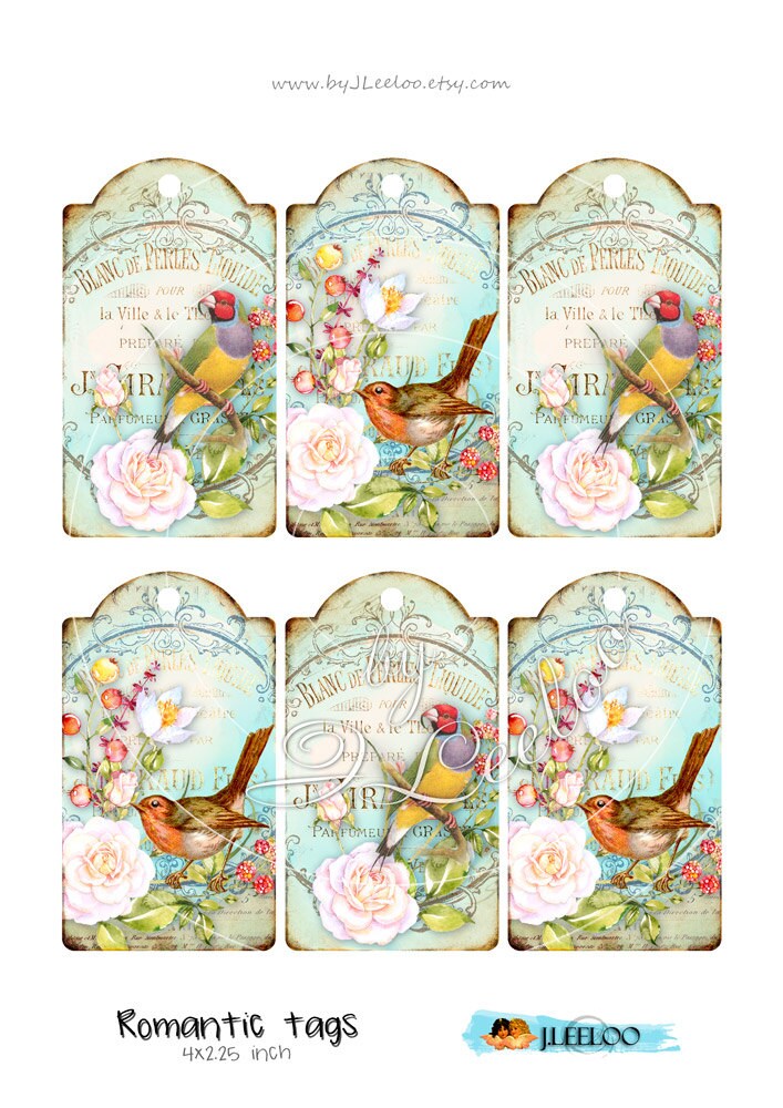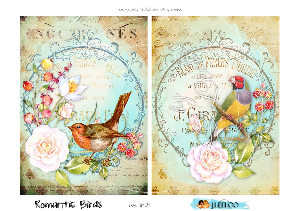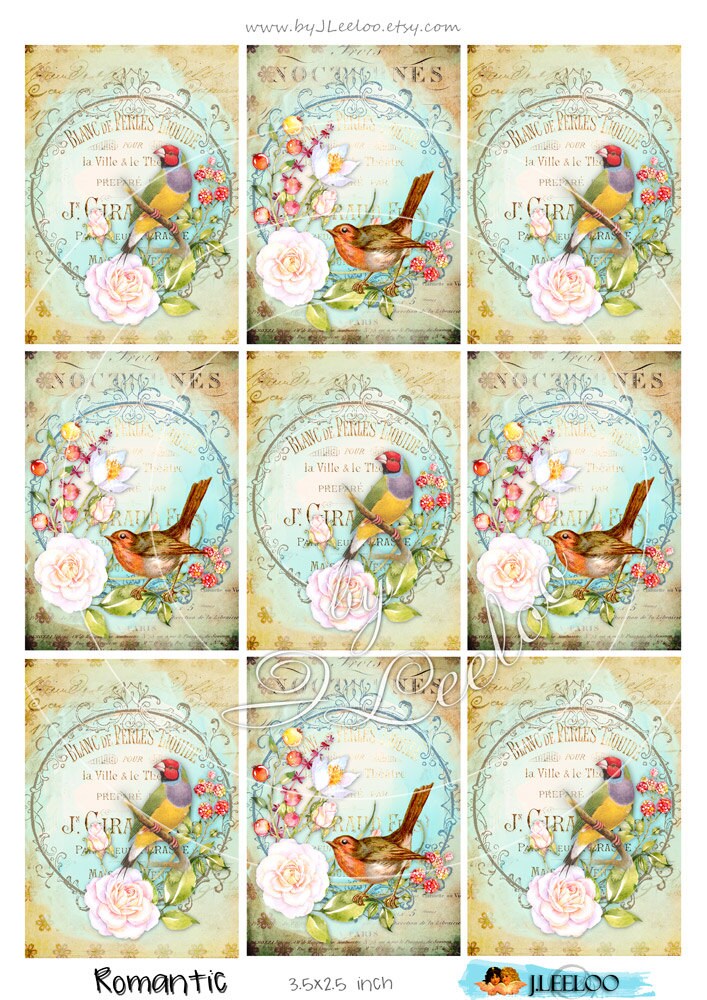 ROMANTIC BIRD printable card and tags scrapbook ephemera instant download Digital collage sheet