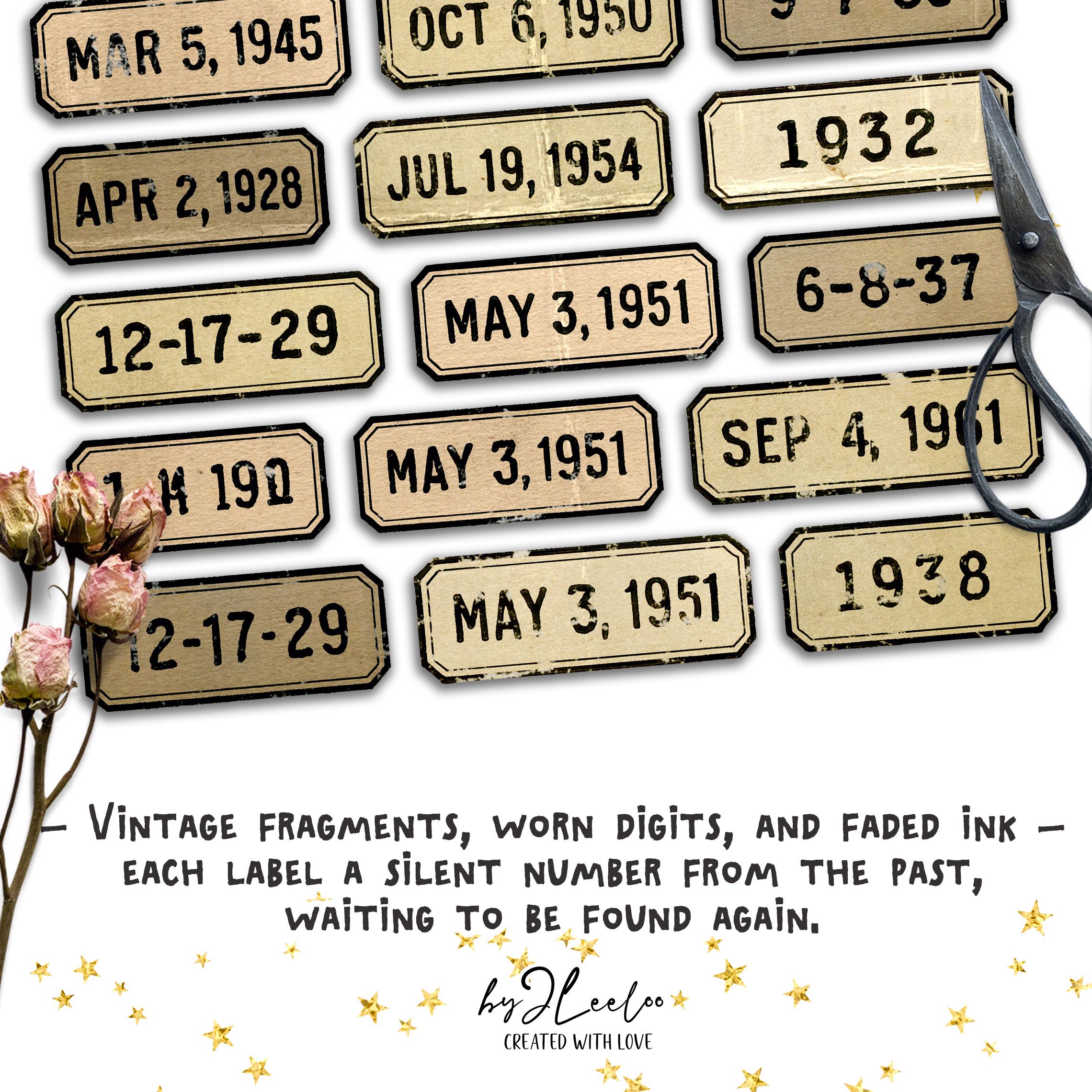 ๐ Aged digits, faded dates, and imperfect fractions โ this collection of vintage-style number labels brings together handwritten notes and typewritten codes on worn, time-kissed paper. From soft ivory to deep sepia tones, each label whispers a fragment of forgotten recordkeeping.