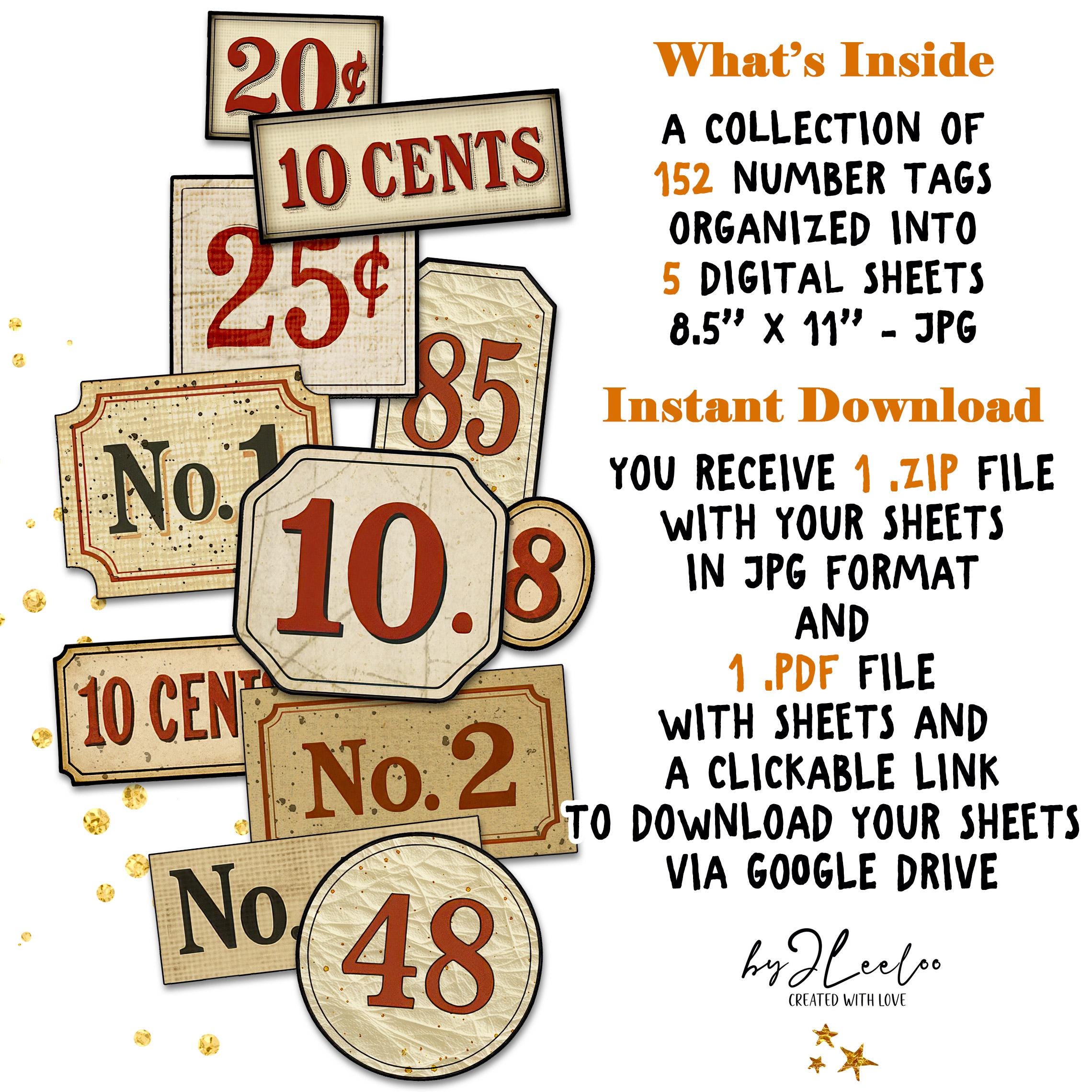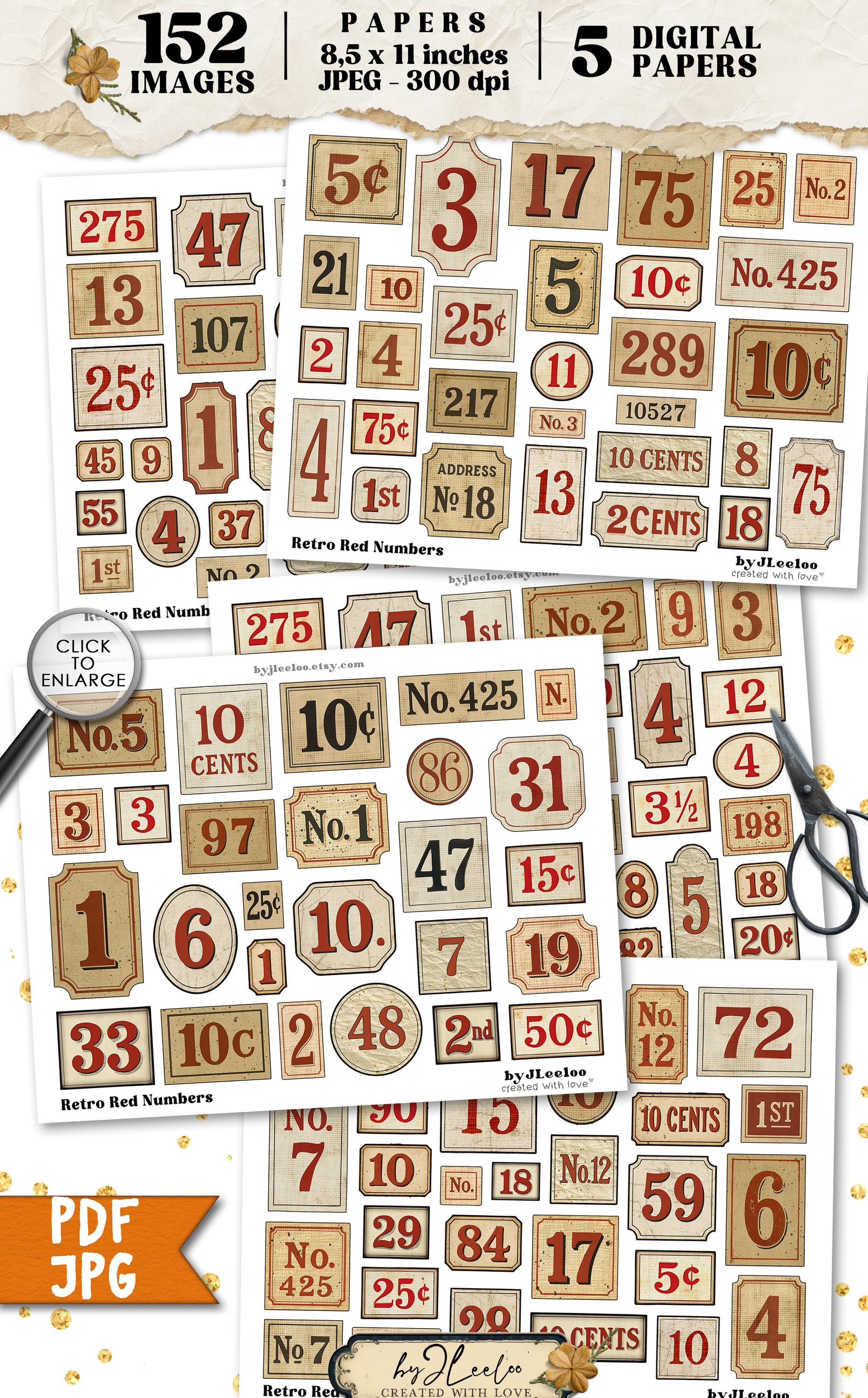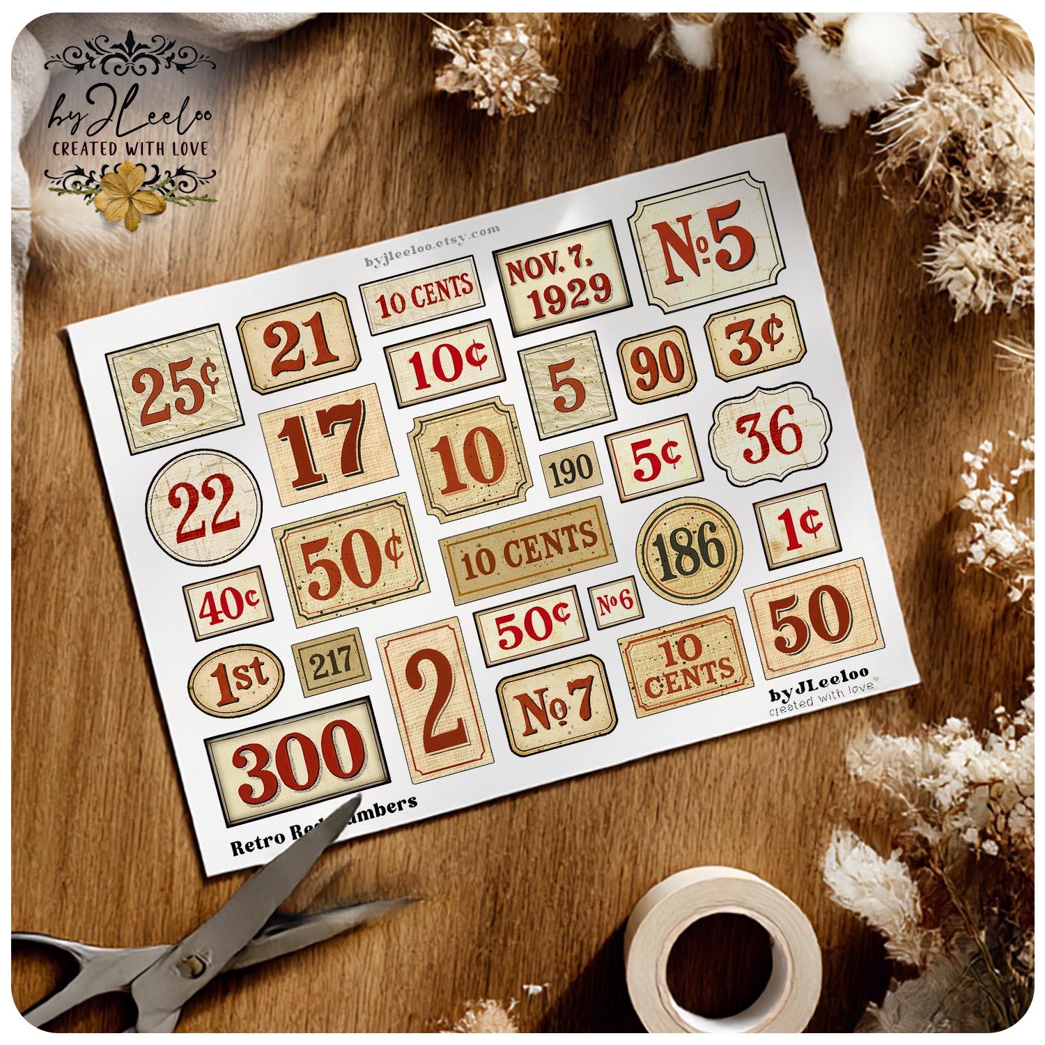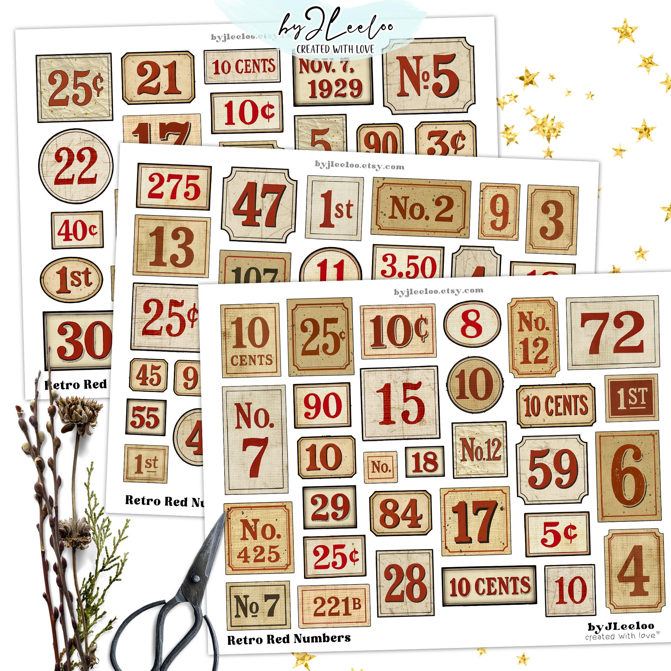 RETRO RED Numbers โ Vintage Industrial Tags, Printable Labels for Junk Journal, Scrapbooking, Crafts | Download for DIY Paper Crafts | tl333