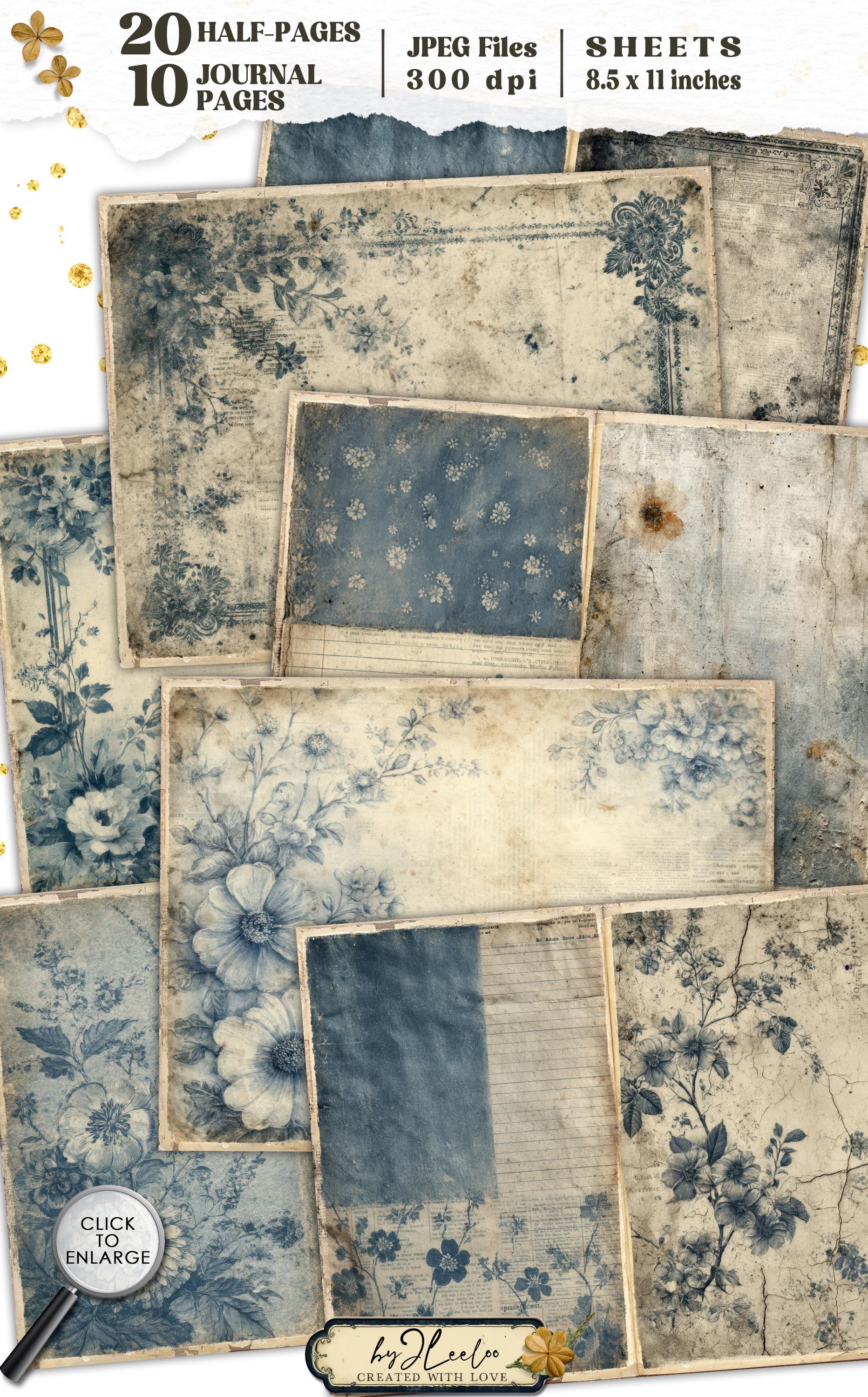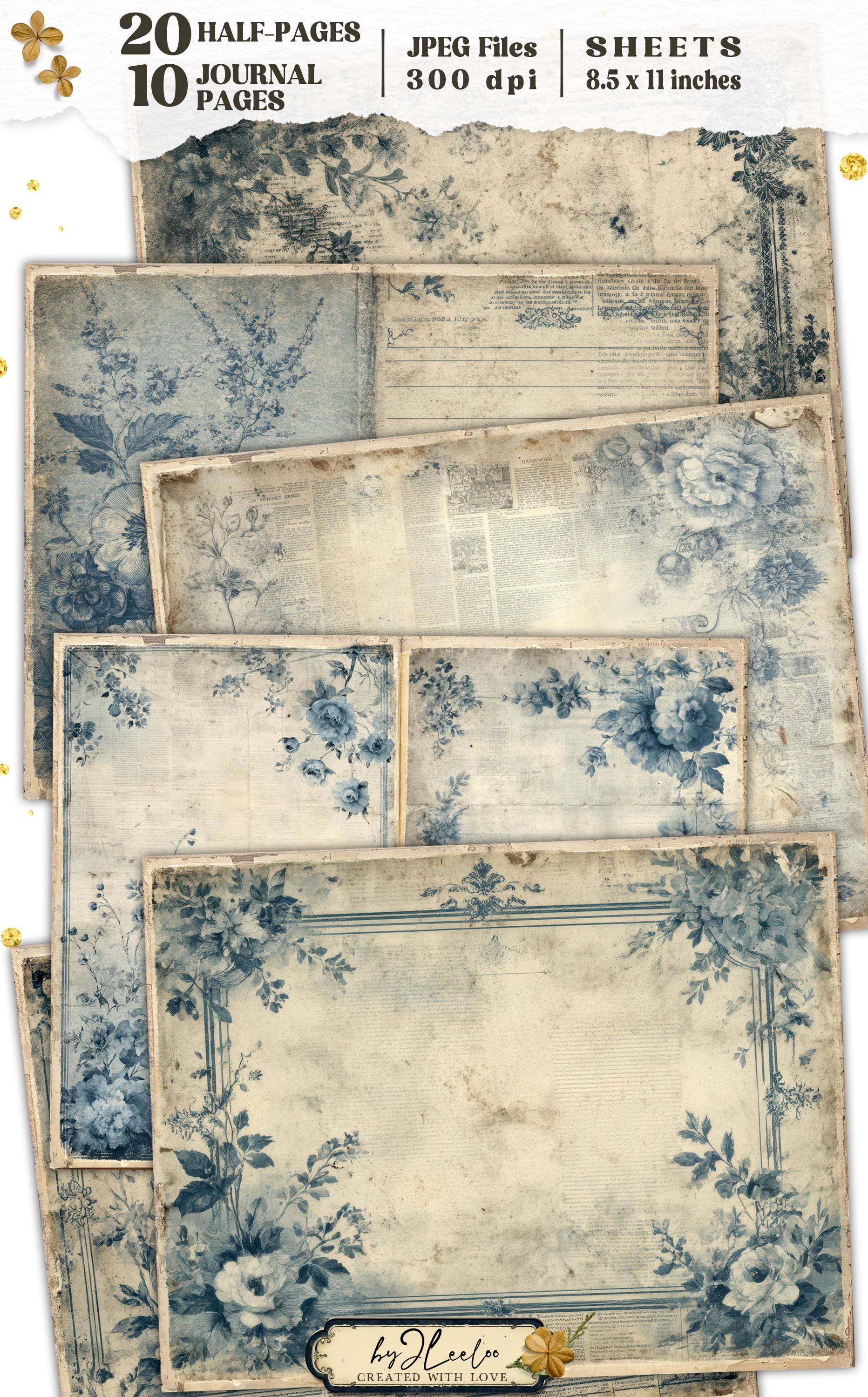 Dusty BLUE PAPERS Vintage Floral Grunge Pages & Half Pages, Printable Kit in Blue Tones | Scrapbook Shabby Journal Kit Antique Style | pp946