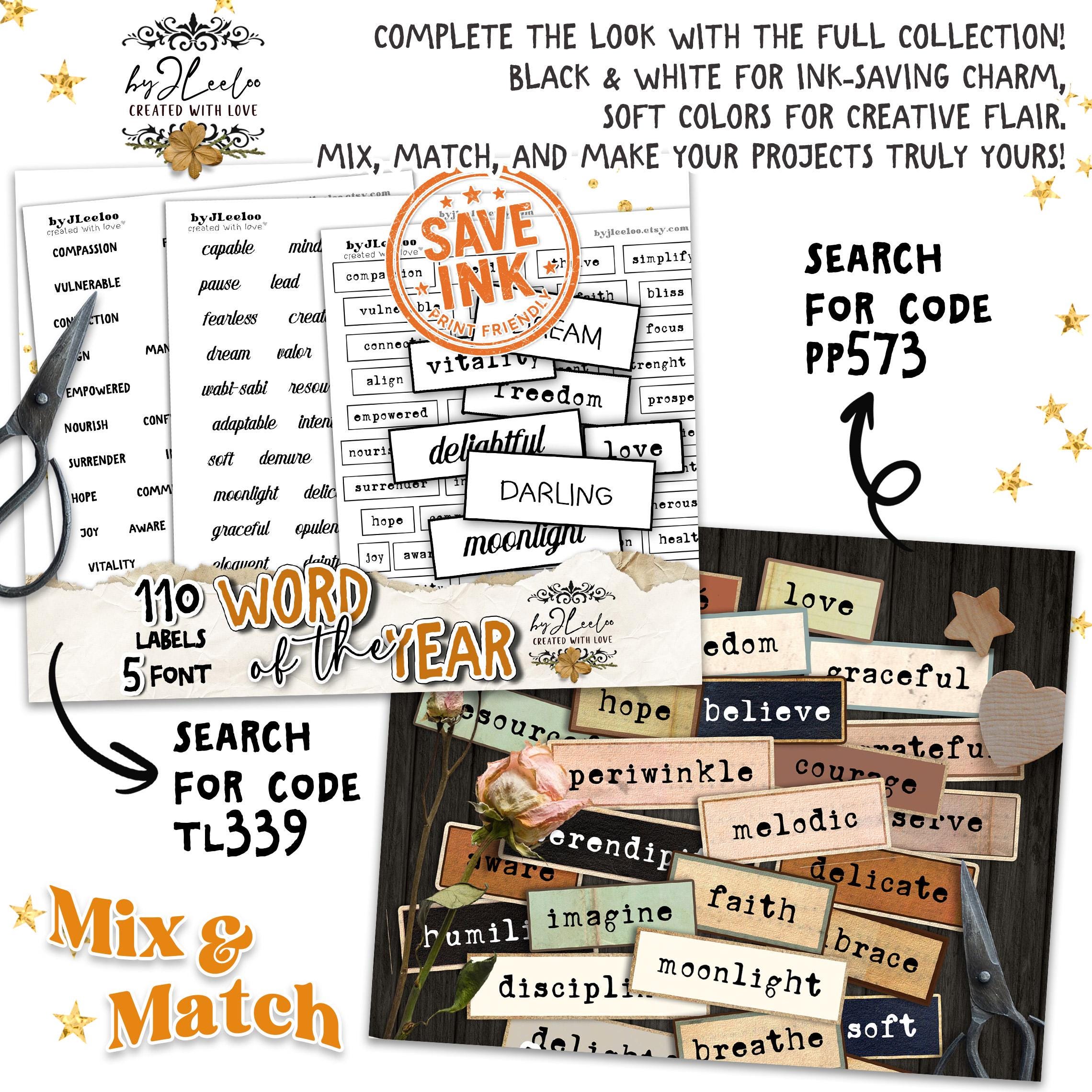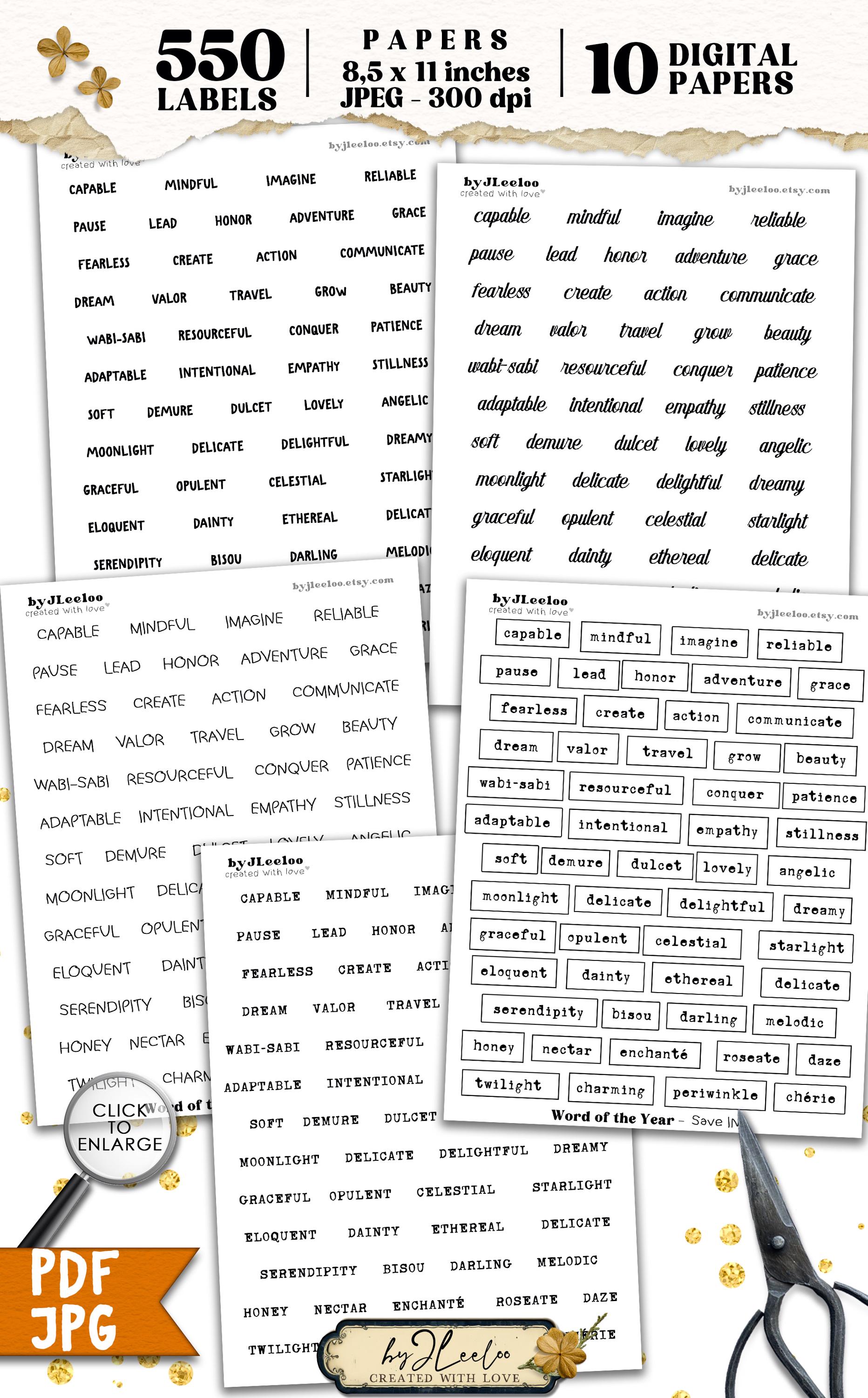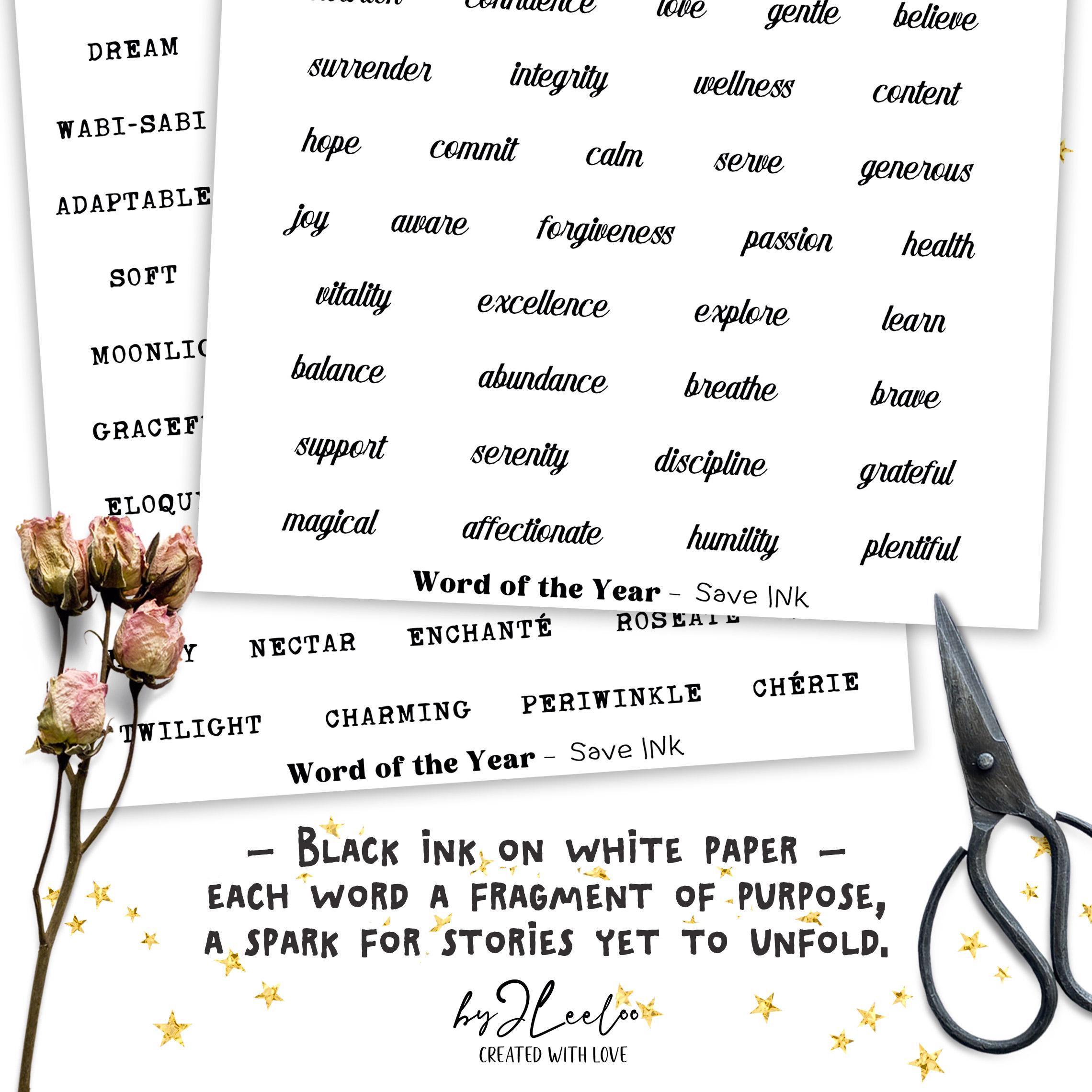 WORD of the YEAR – 550 Ink-Saving Labels • Black and White Printable Words tags for Junk Journals & Paper Crafts Collage Craft Art | tl339