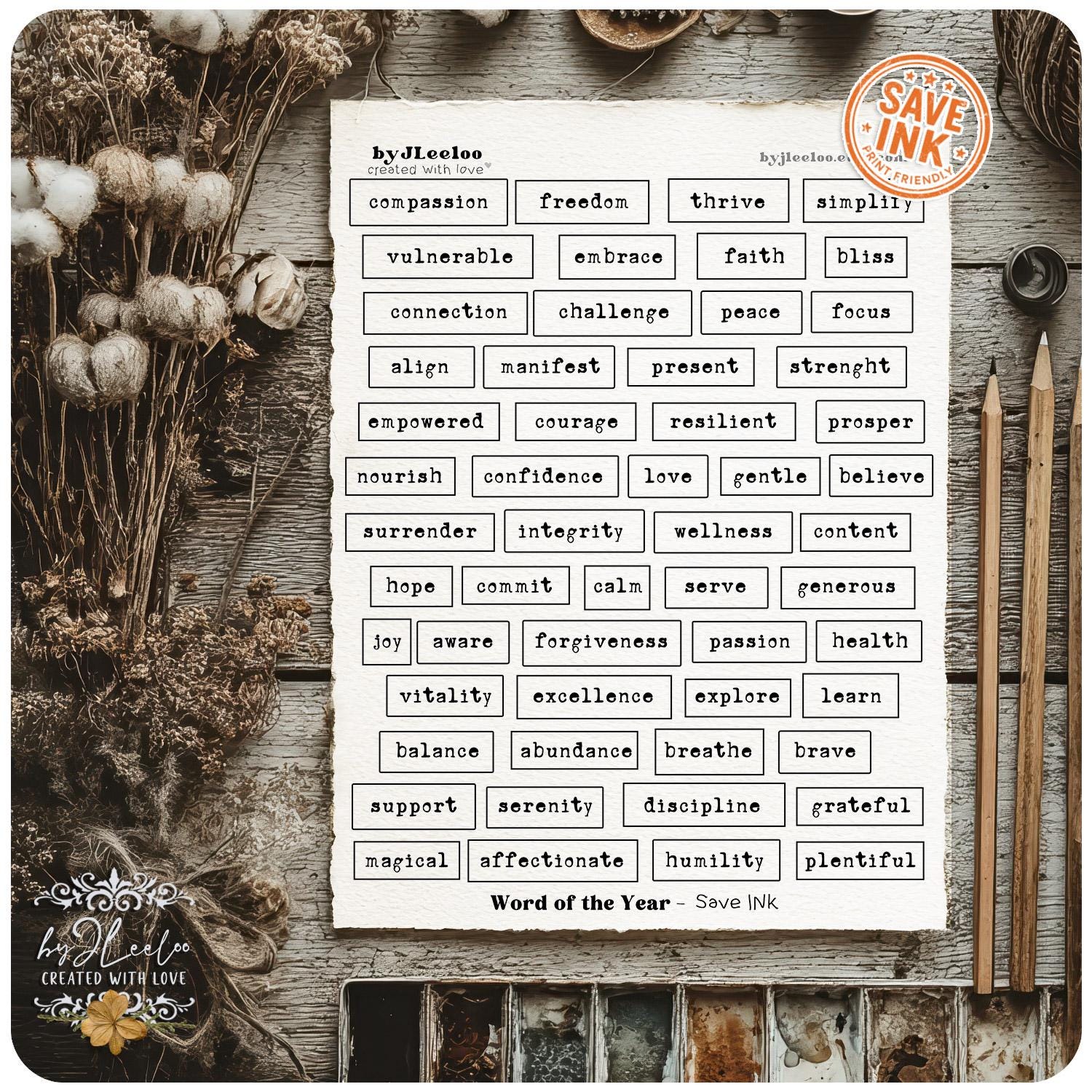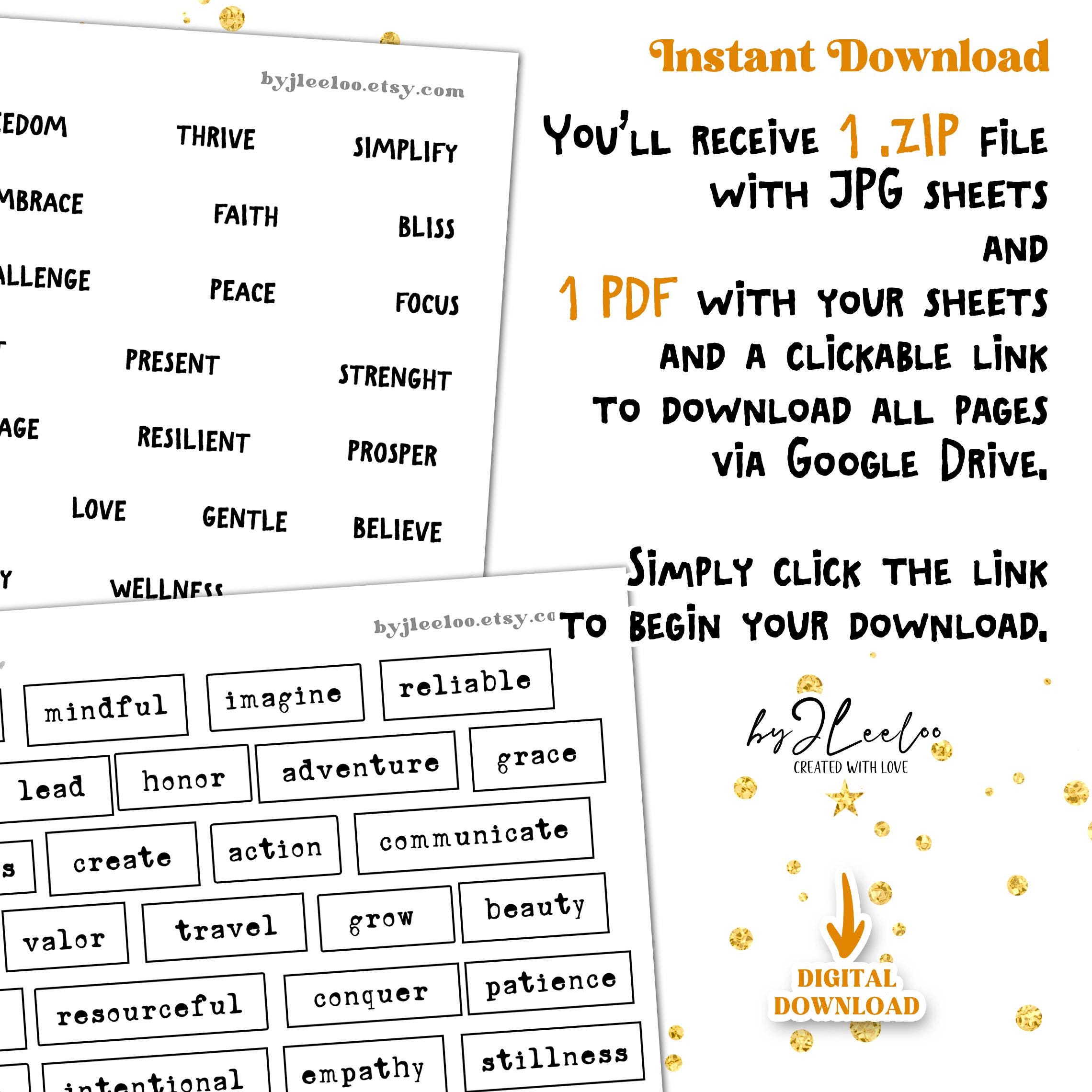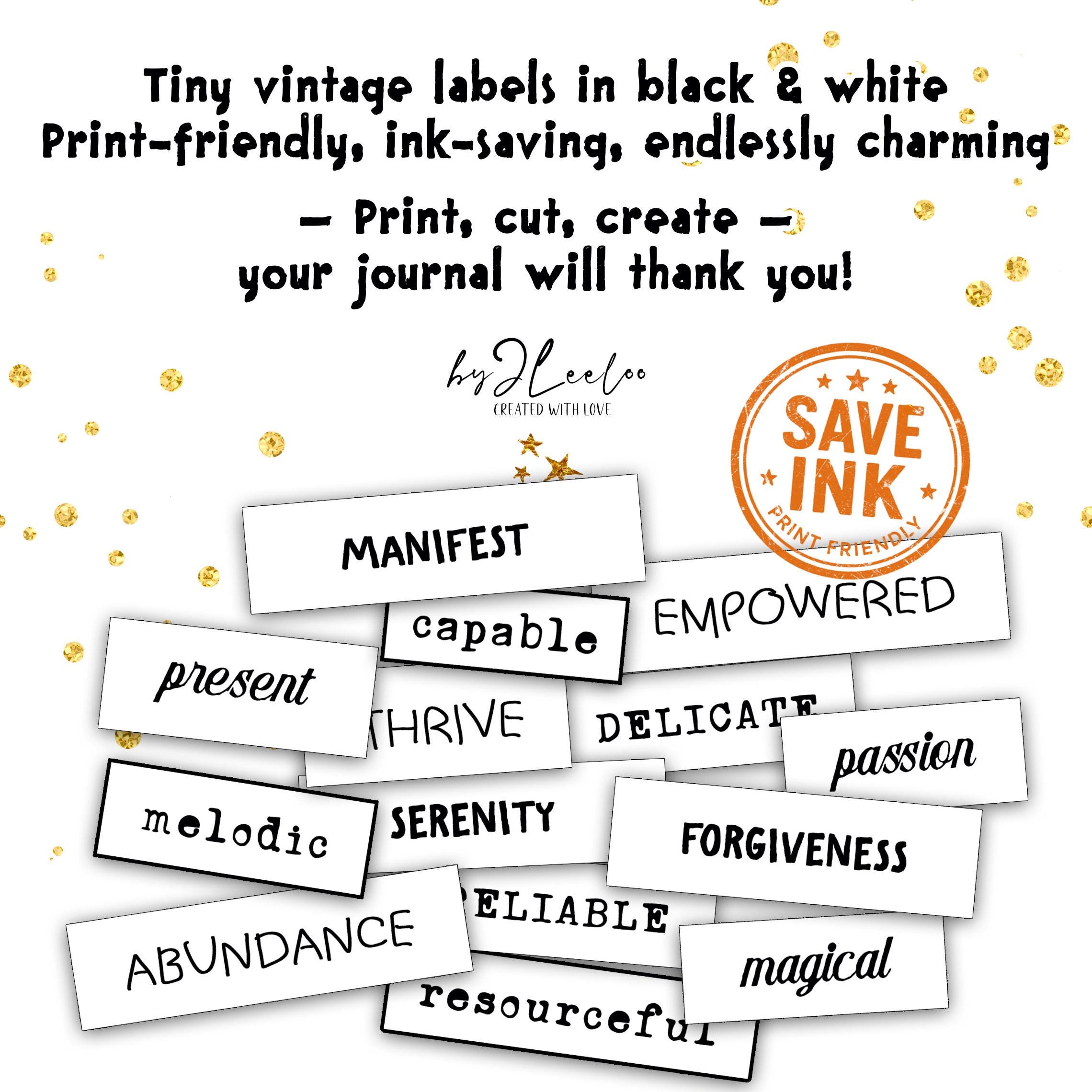 WORD of the YEAR – 550 Ink-Saving Labels • Black and White Printable Words tags for Junk Journals & Paper Crafts Collage Craft Art | tl339