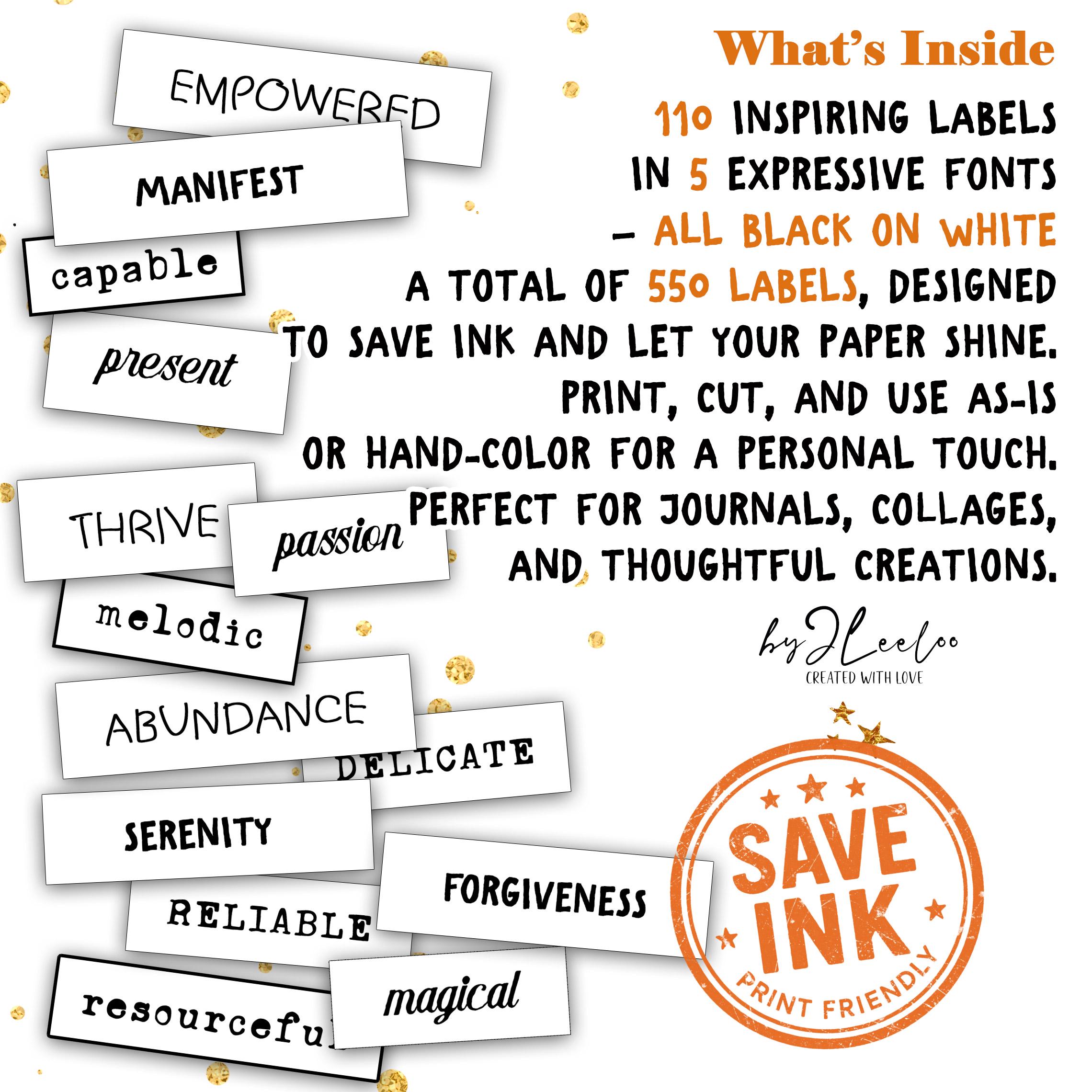 This collection includes 110 black & white labels in 5 expressive fonts, for a total of 550 print-friendly labels.