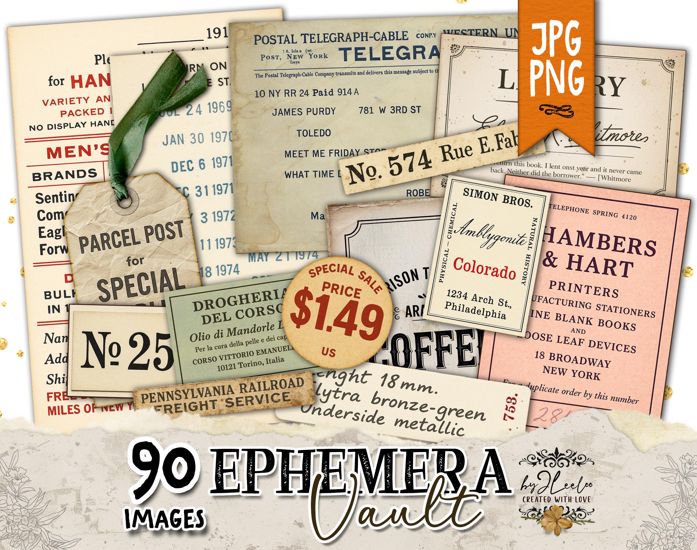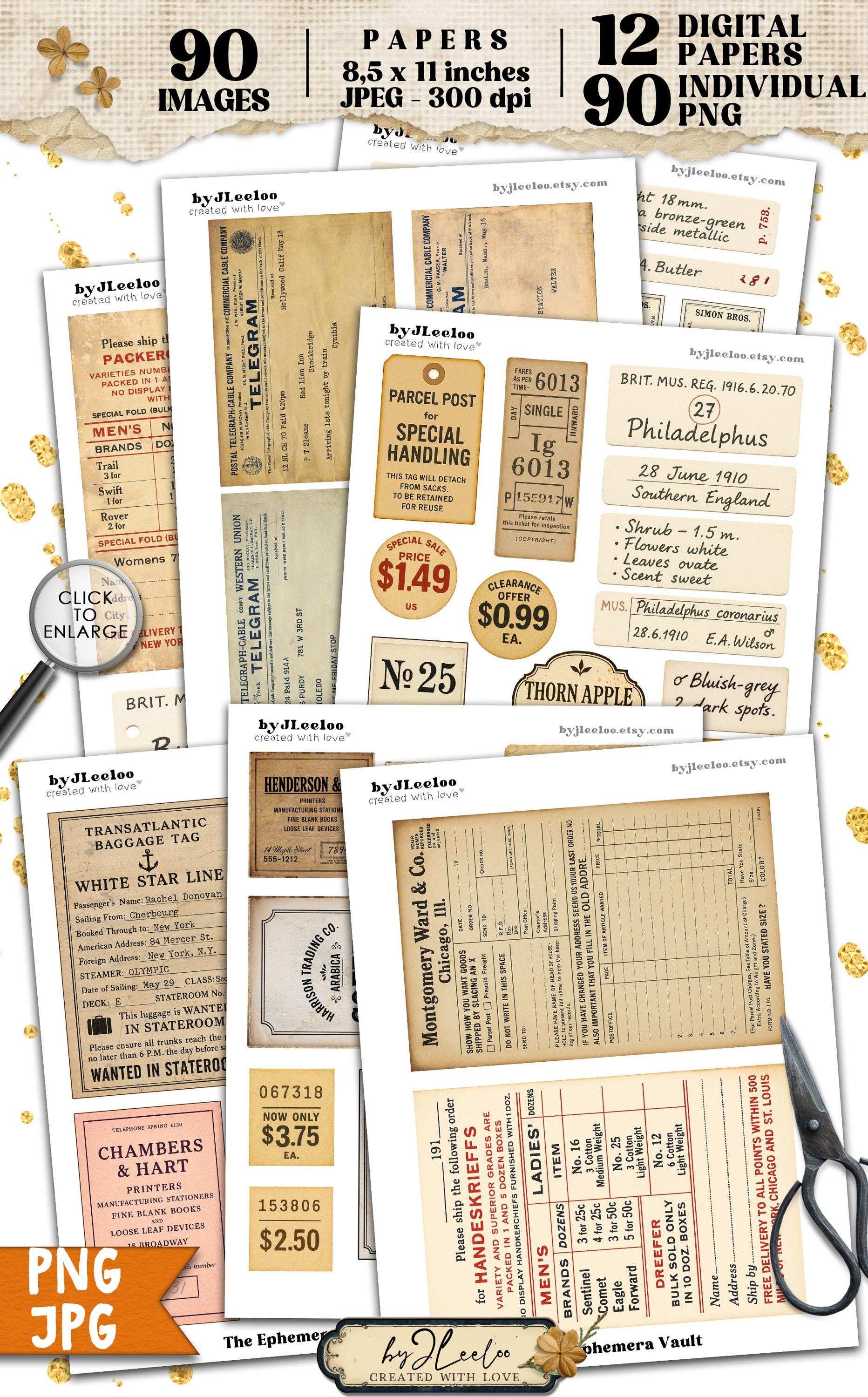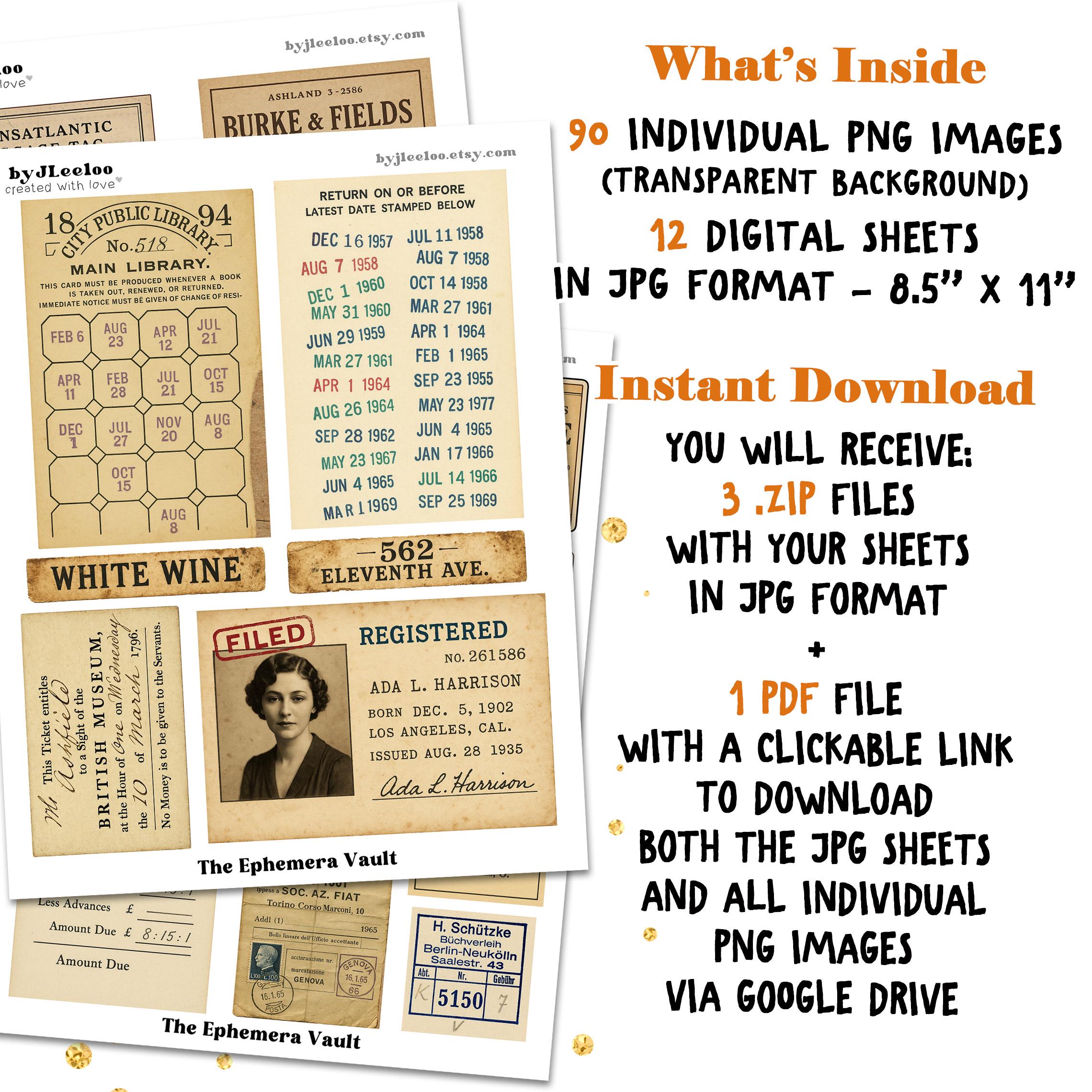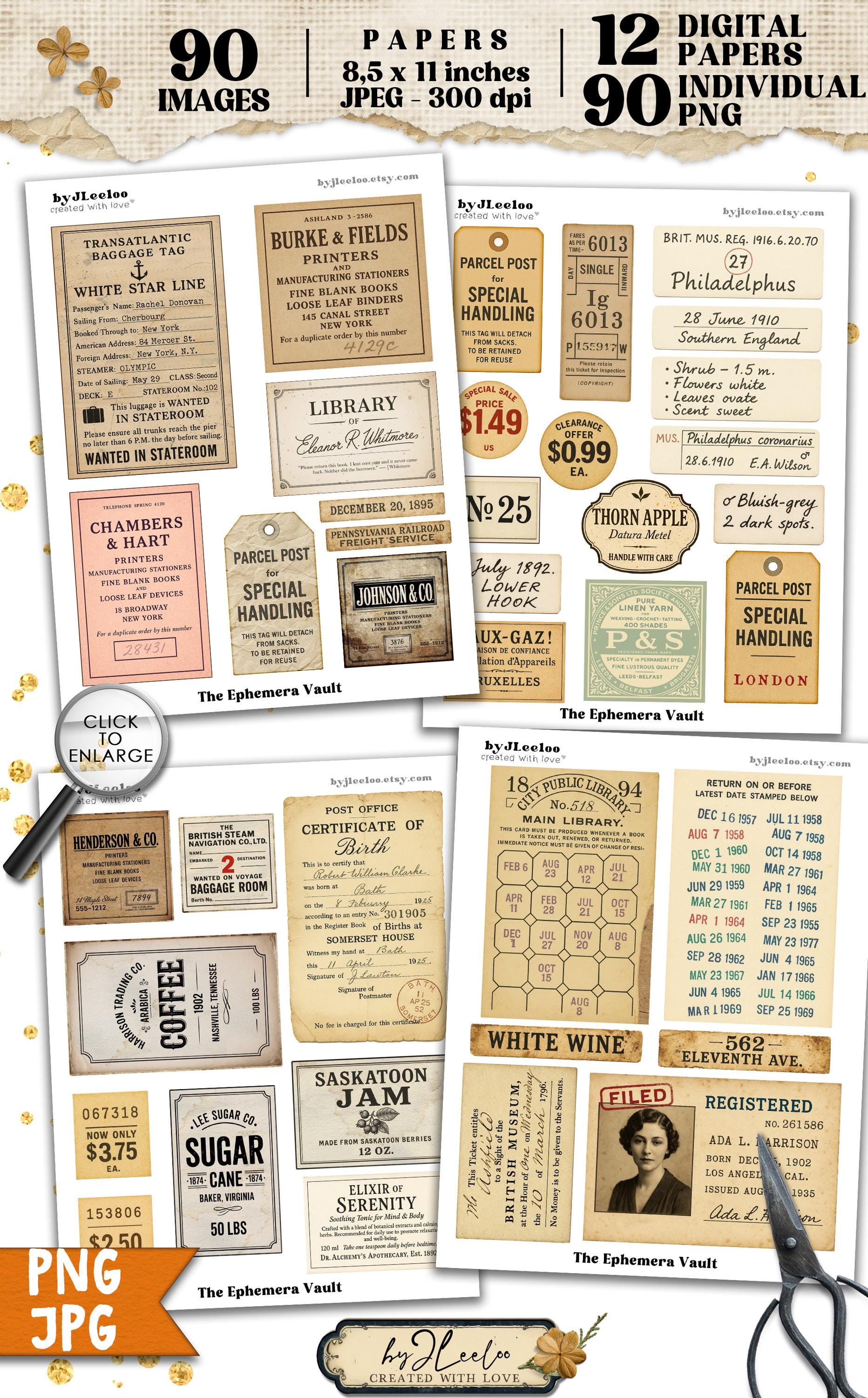 EPHEMERA VAULT 90 Vintage PNG Labels, Tags, Tickets + 12 Jpg Sheets β’ Printable Ephemera for Junk Journals Scrapbook Mixed Media | pp943