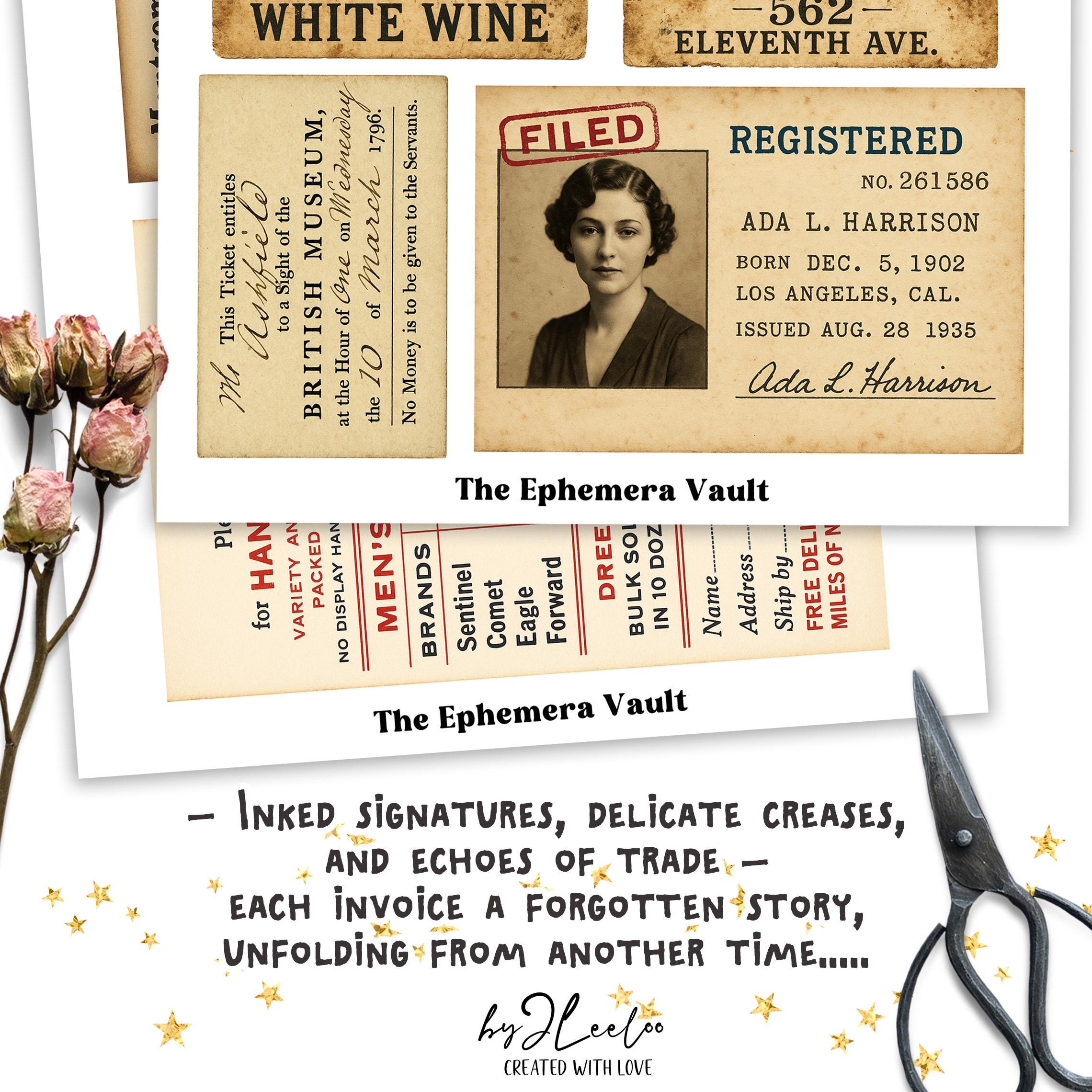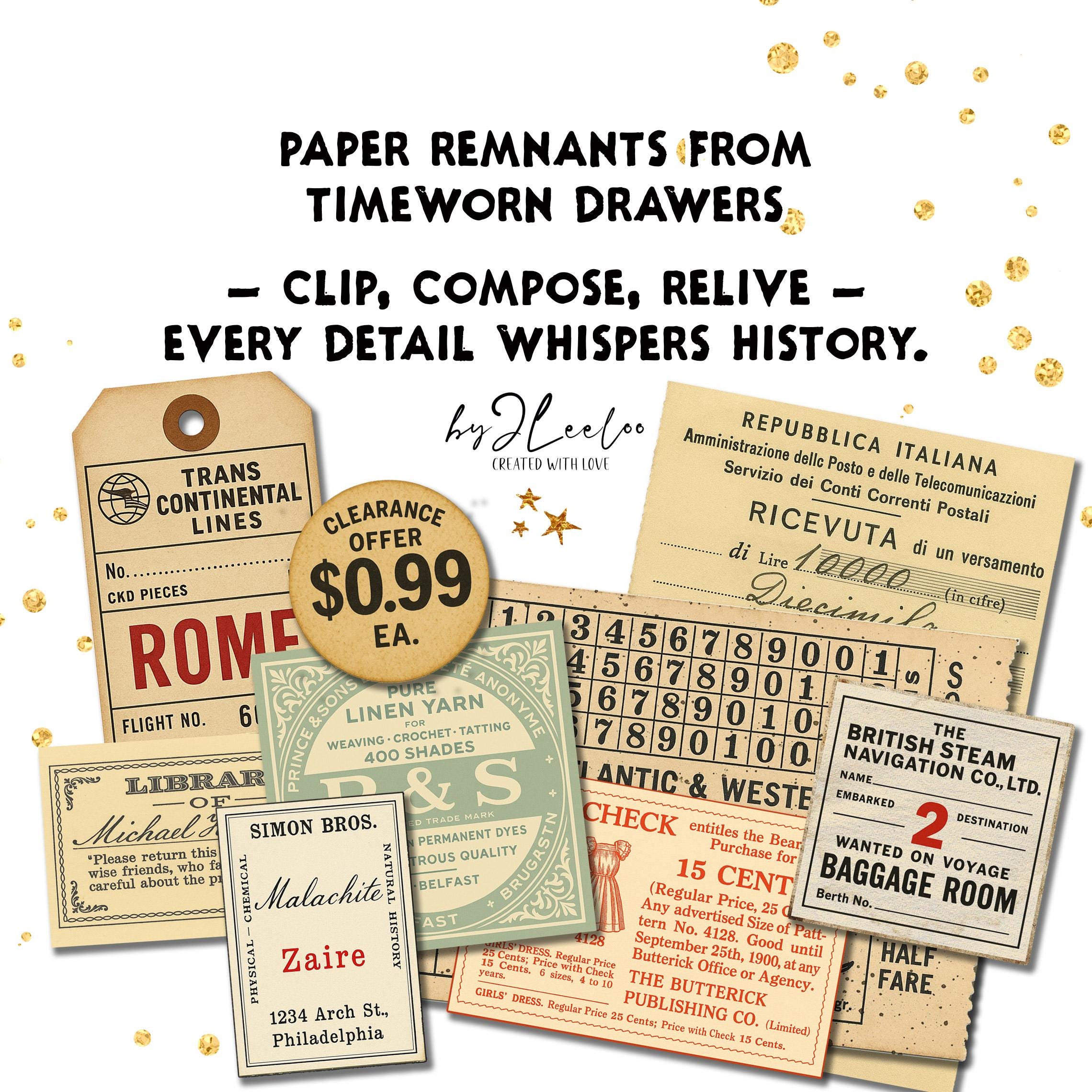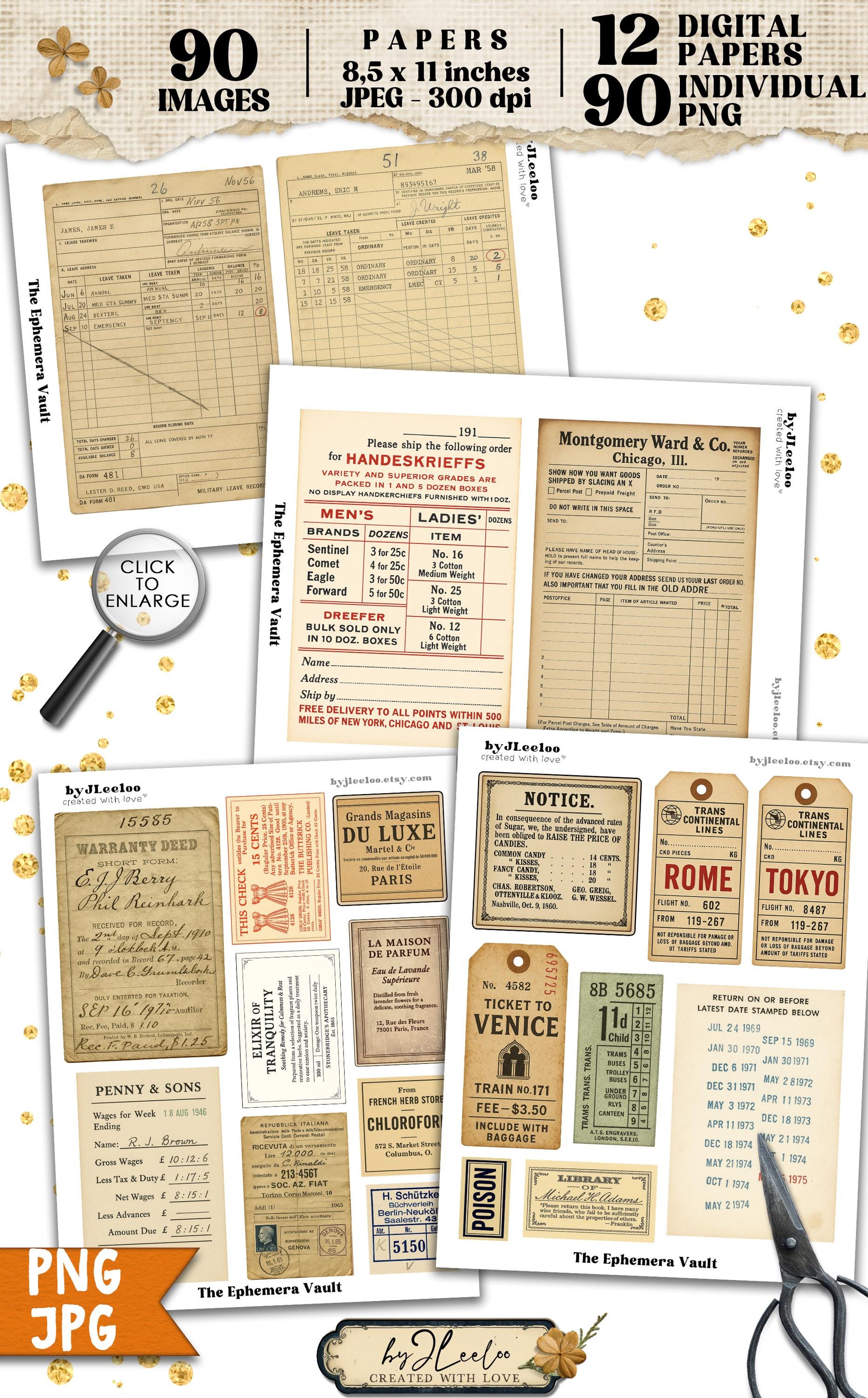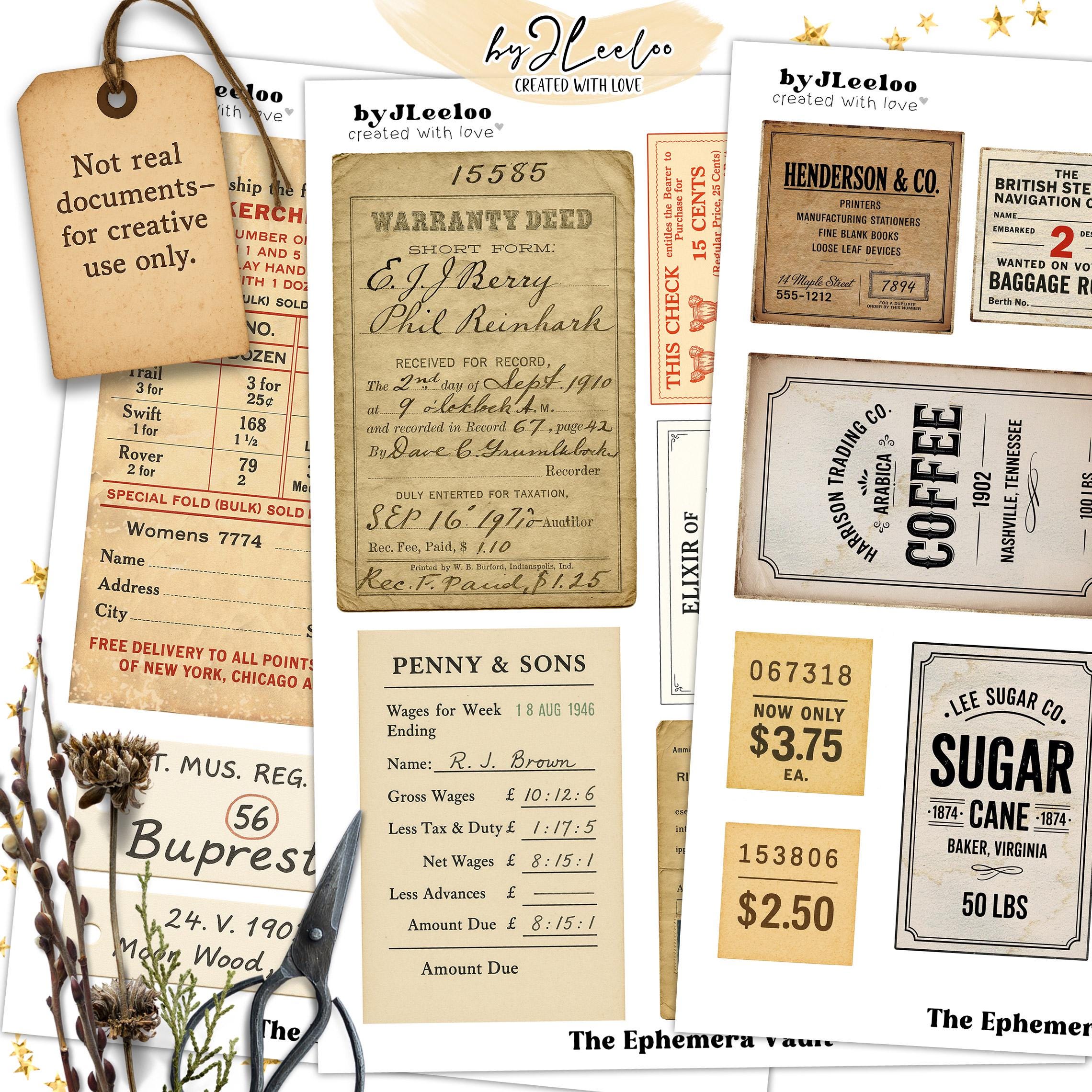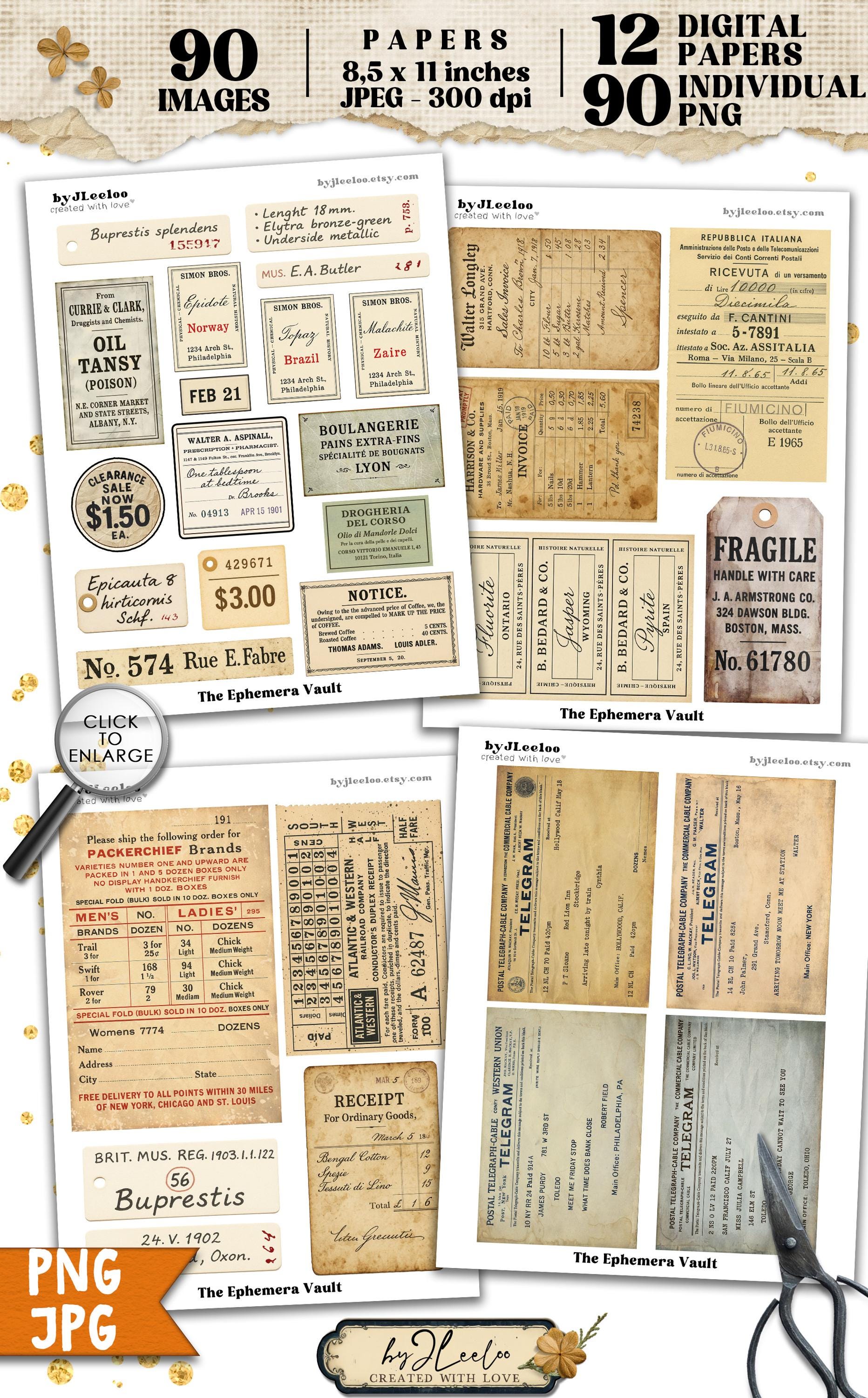 EPHEMERA VAULT 90 Vintage PNG Labels, Tags, Tickets + 12 Jpg Sheets β’ Printable Ephemera for Junk Journals Scrapbook Mixed Media | pp943