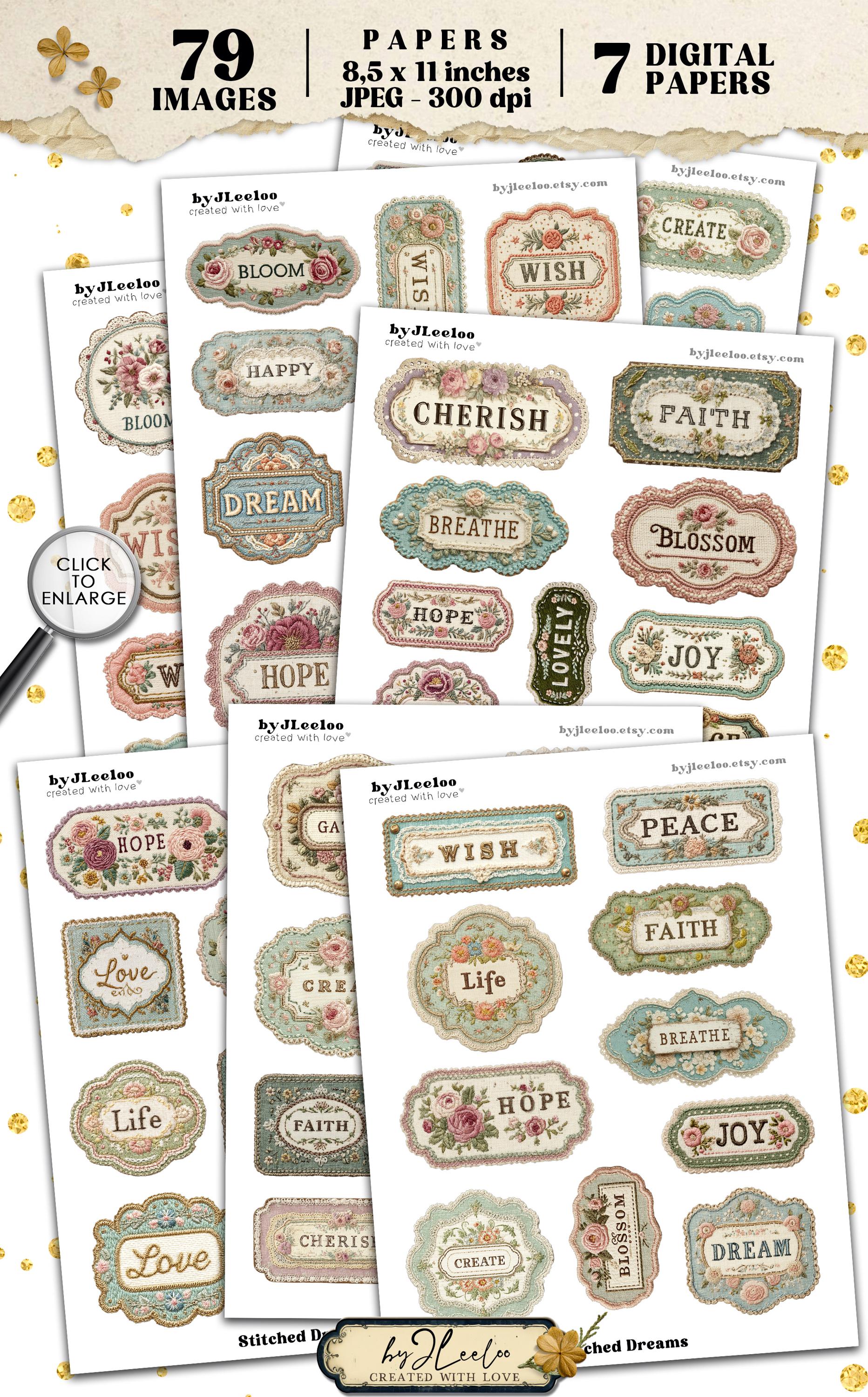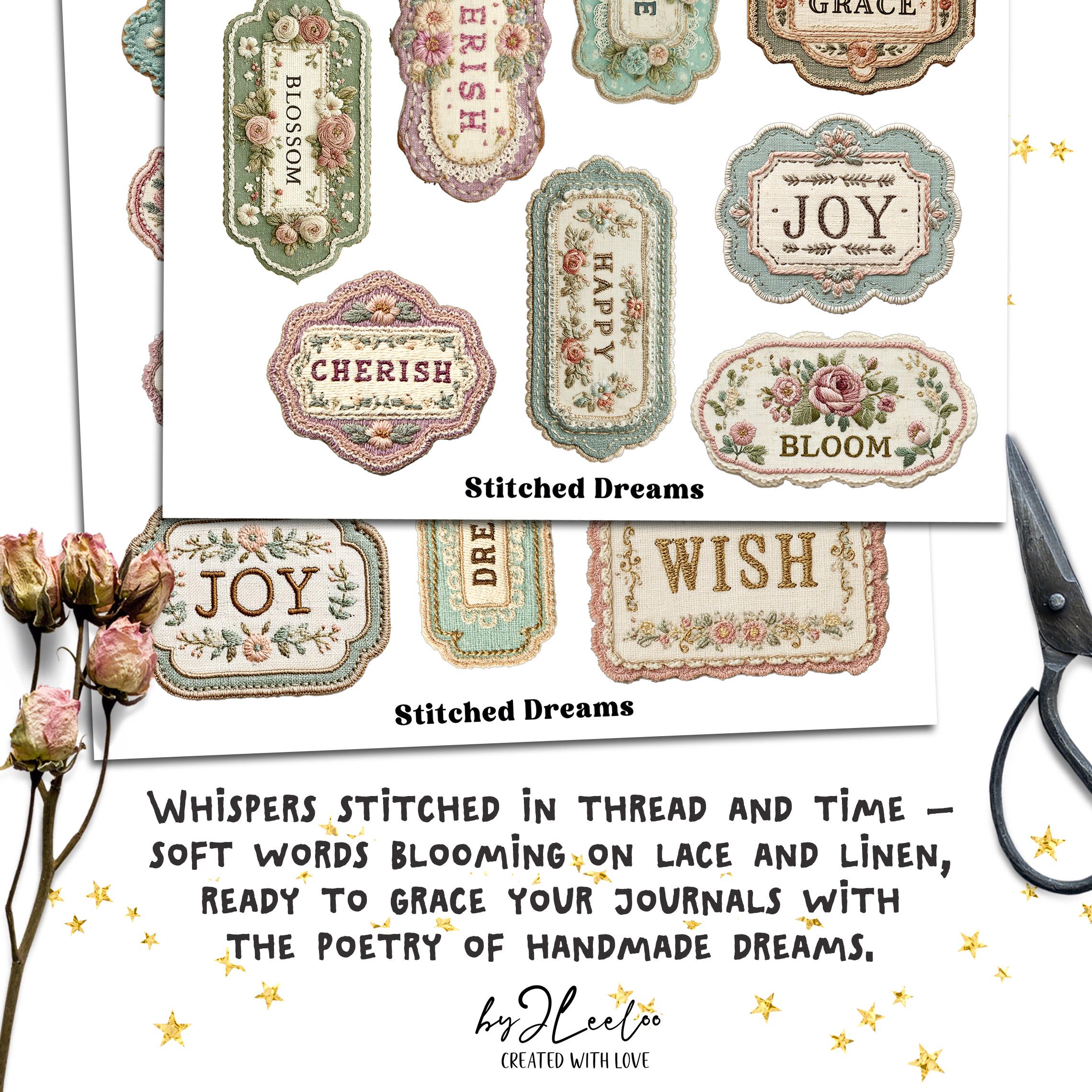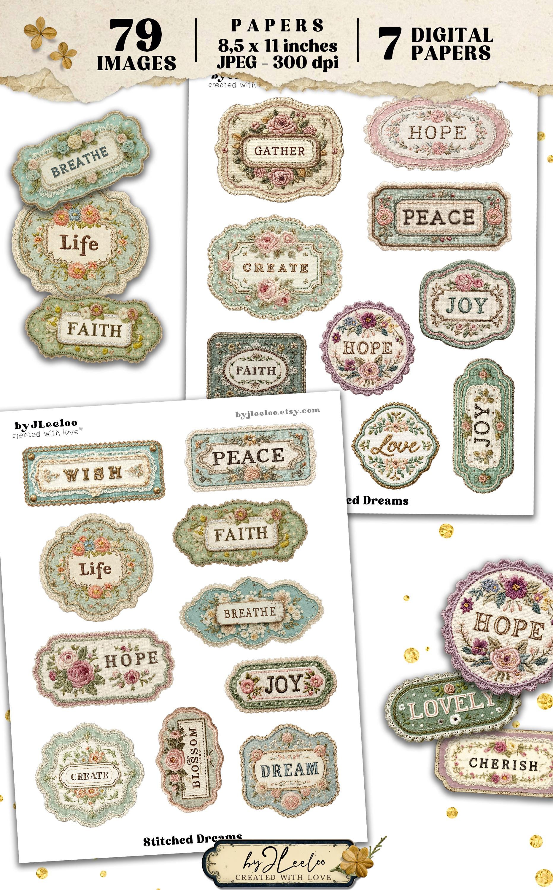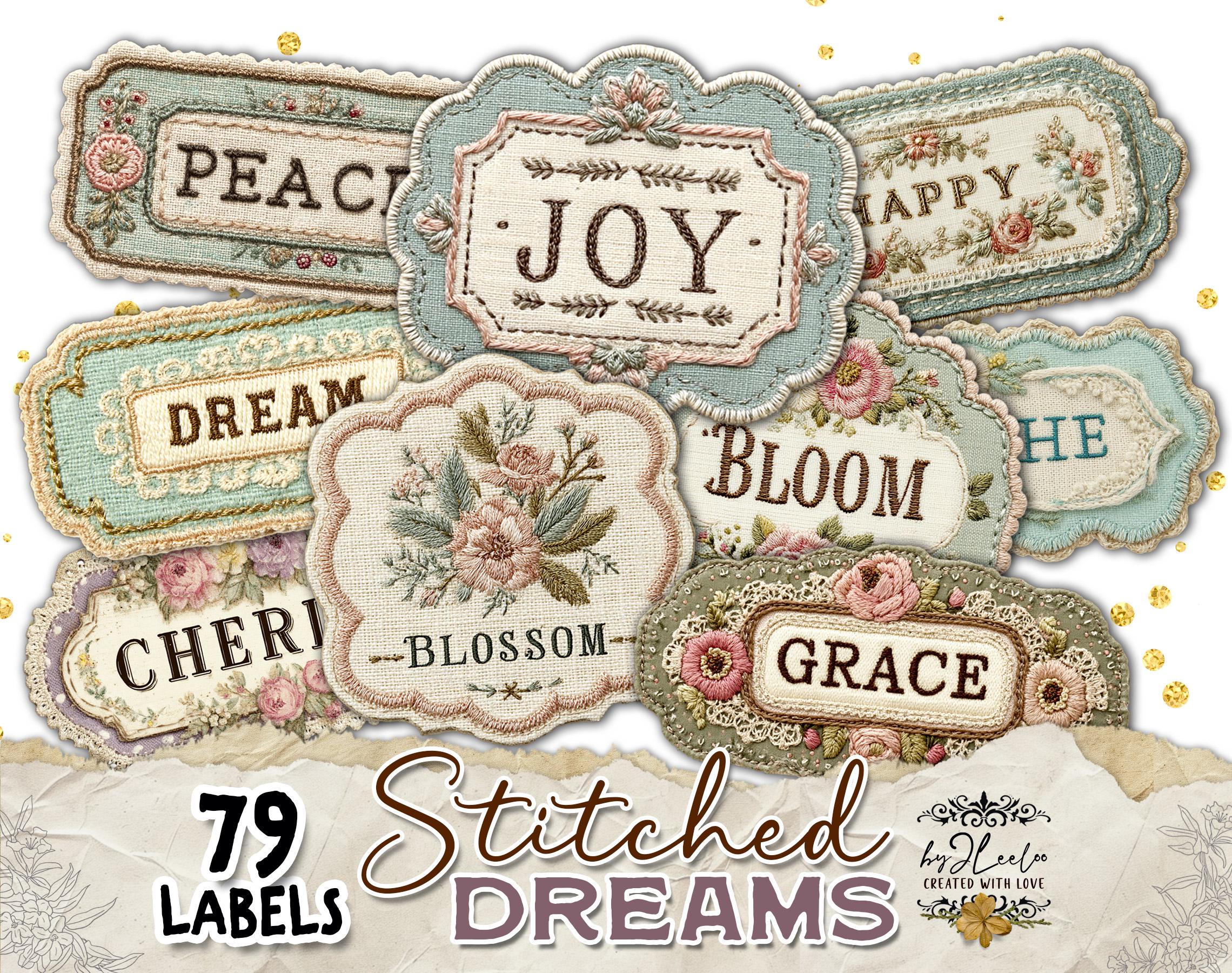 STITCHED DREAMS 79 Embroidered Label PNGs + 7 Digital Sheets | Romantic Vintage Words for Junk Journal Scrapbooking Card-Making | | tl338