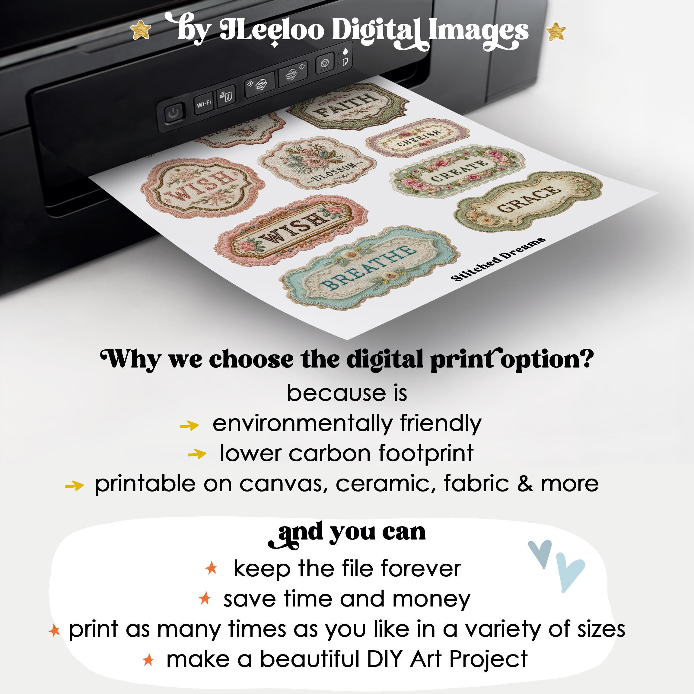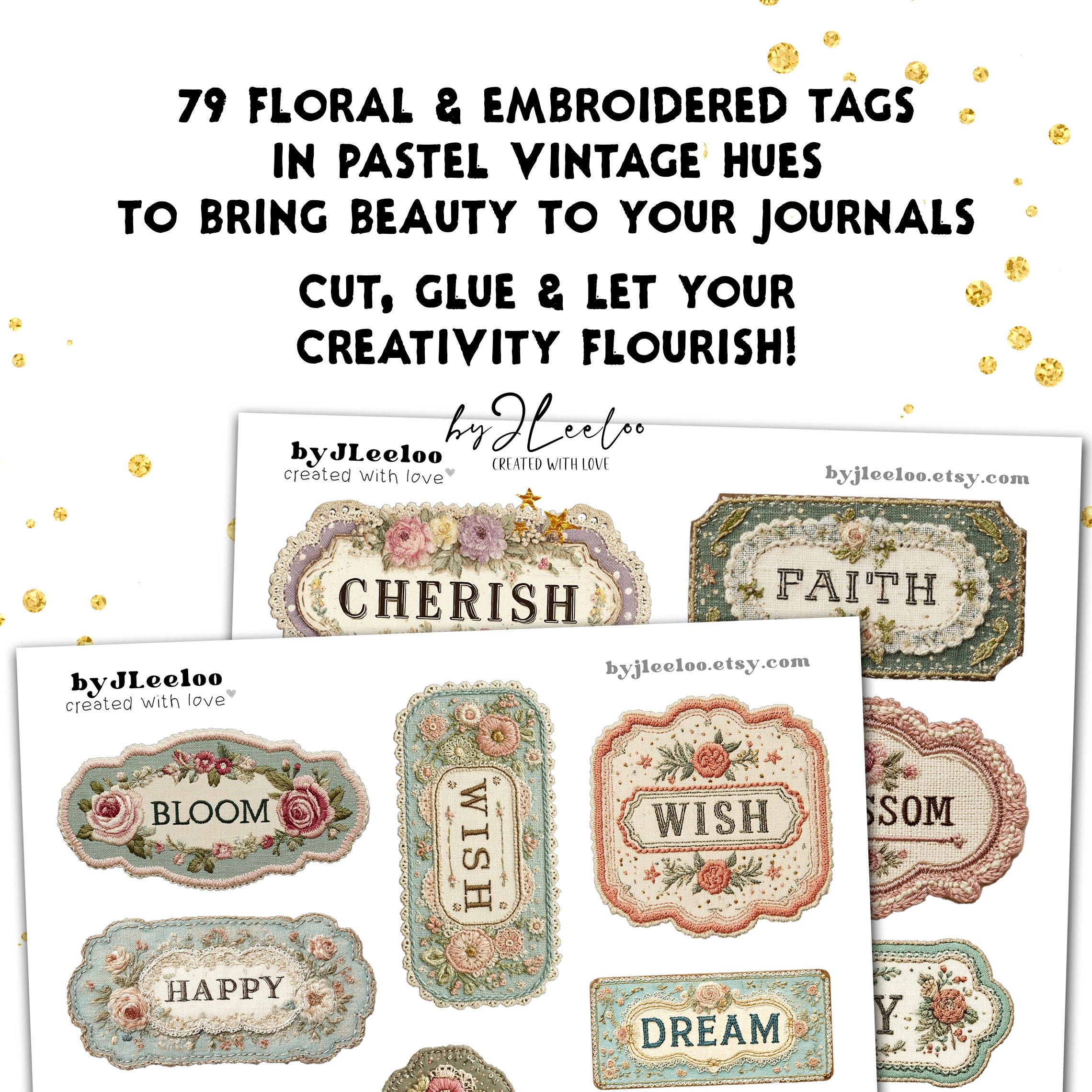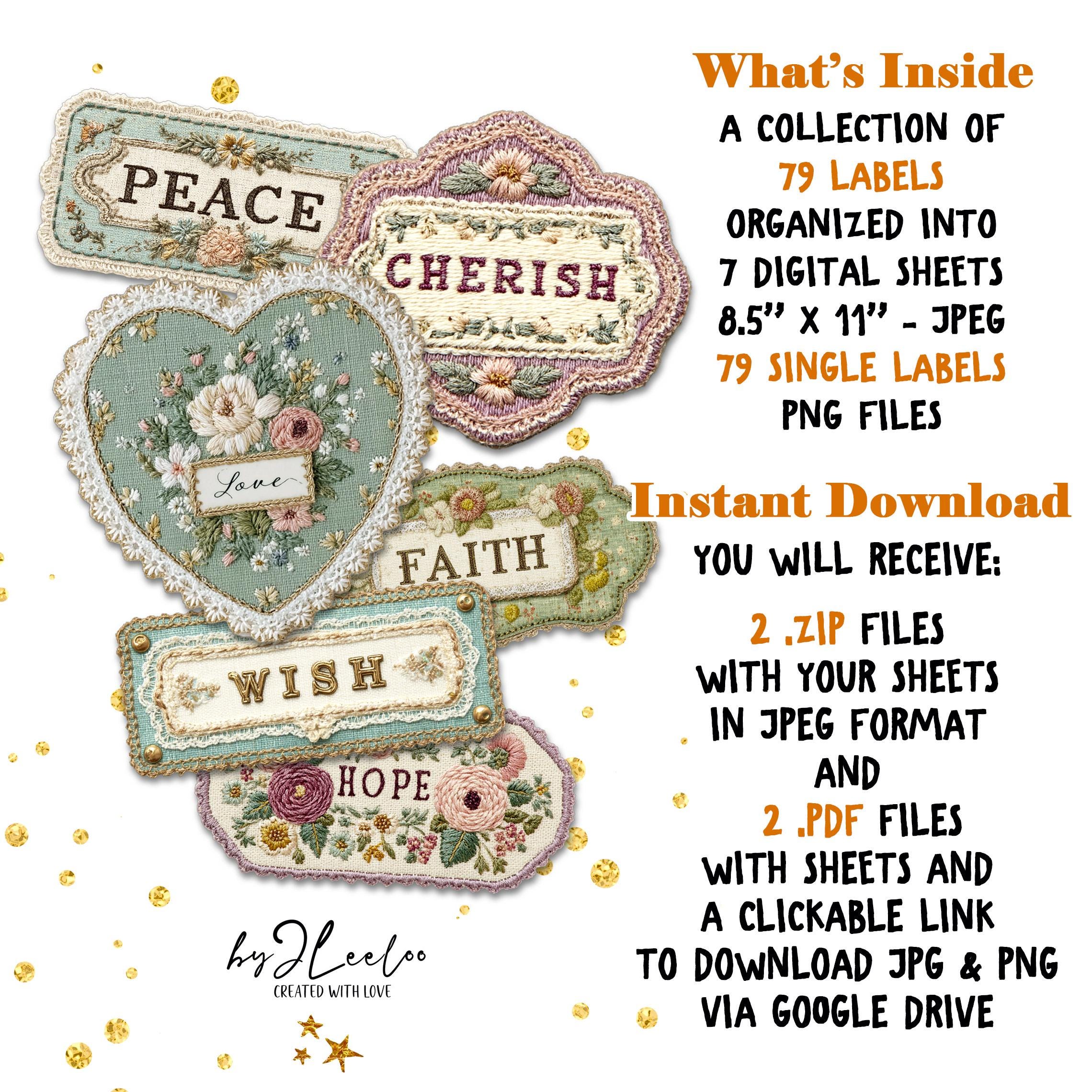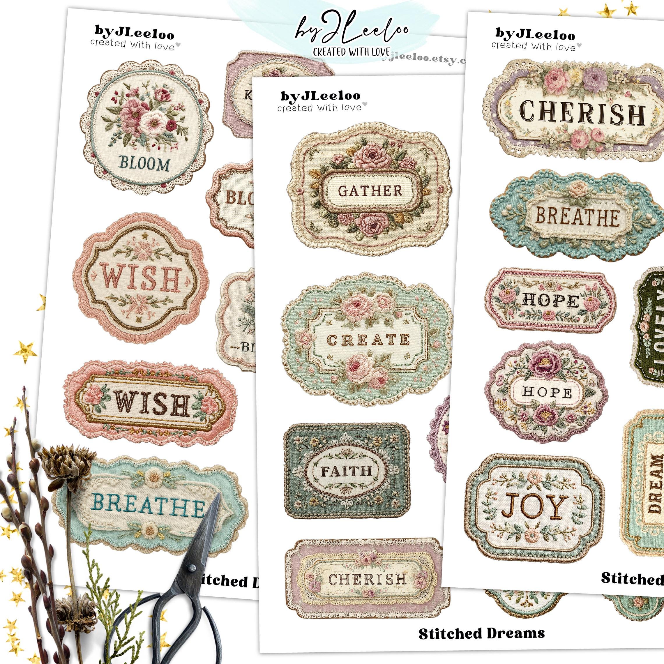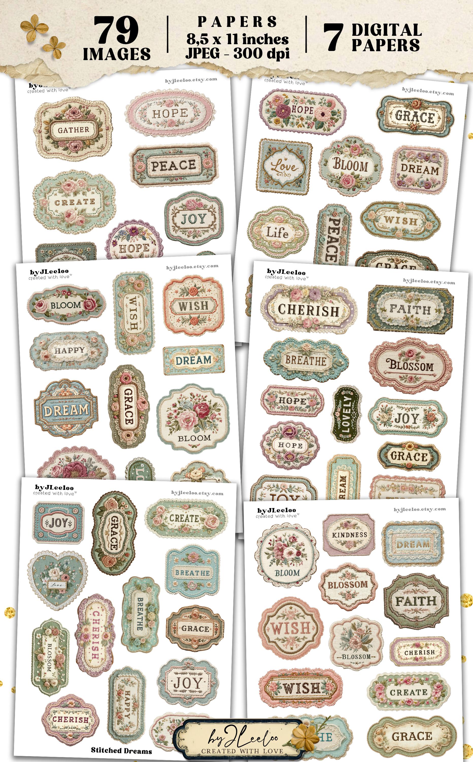 STITCHED DREAMS 79 Embroidered Label PNGs + 7 Digital Sheets | Romantic Vintage Words for Junk Journal Scrapbooking Card-Making | | tl338