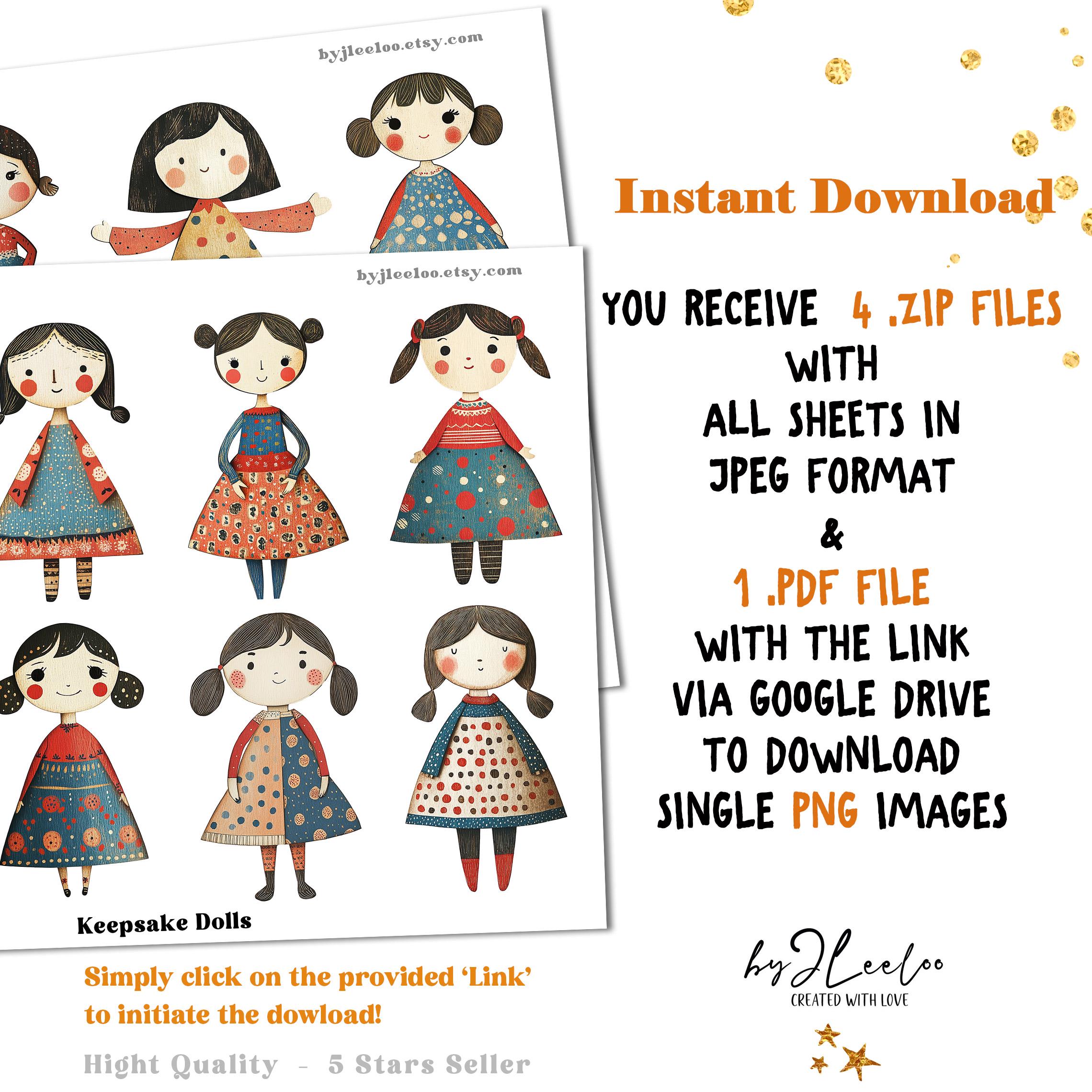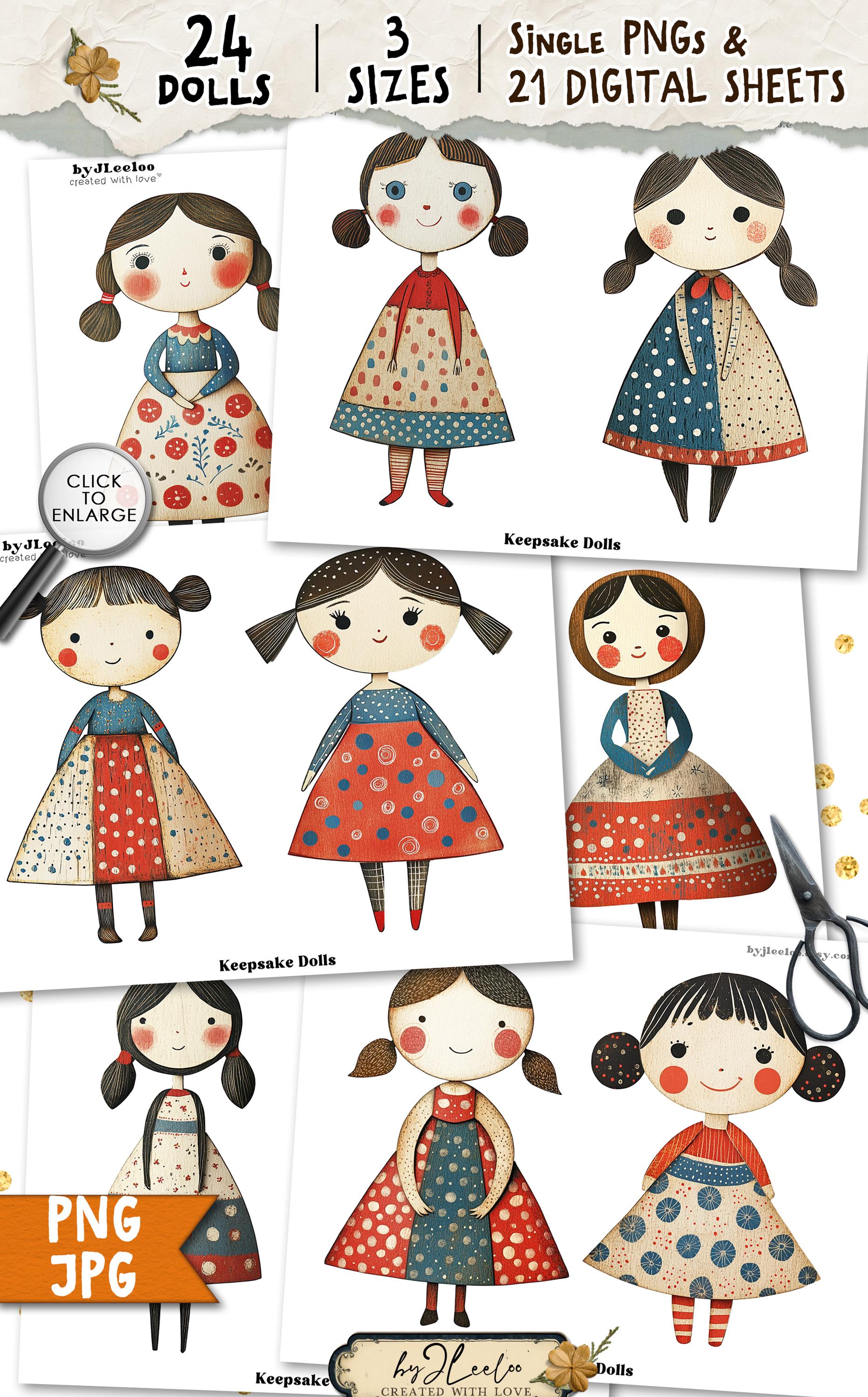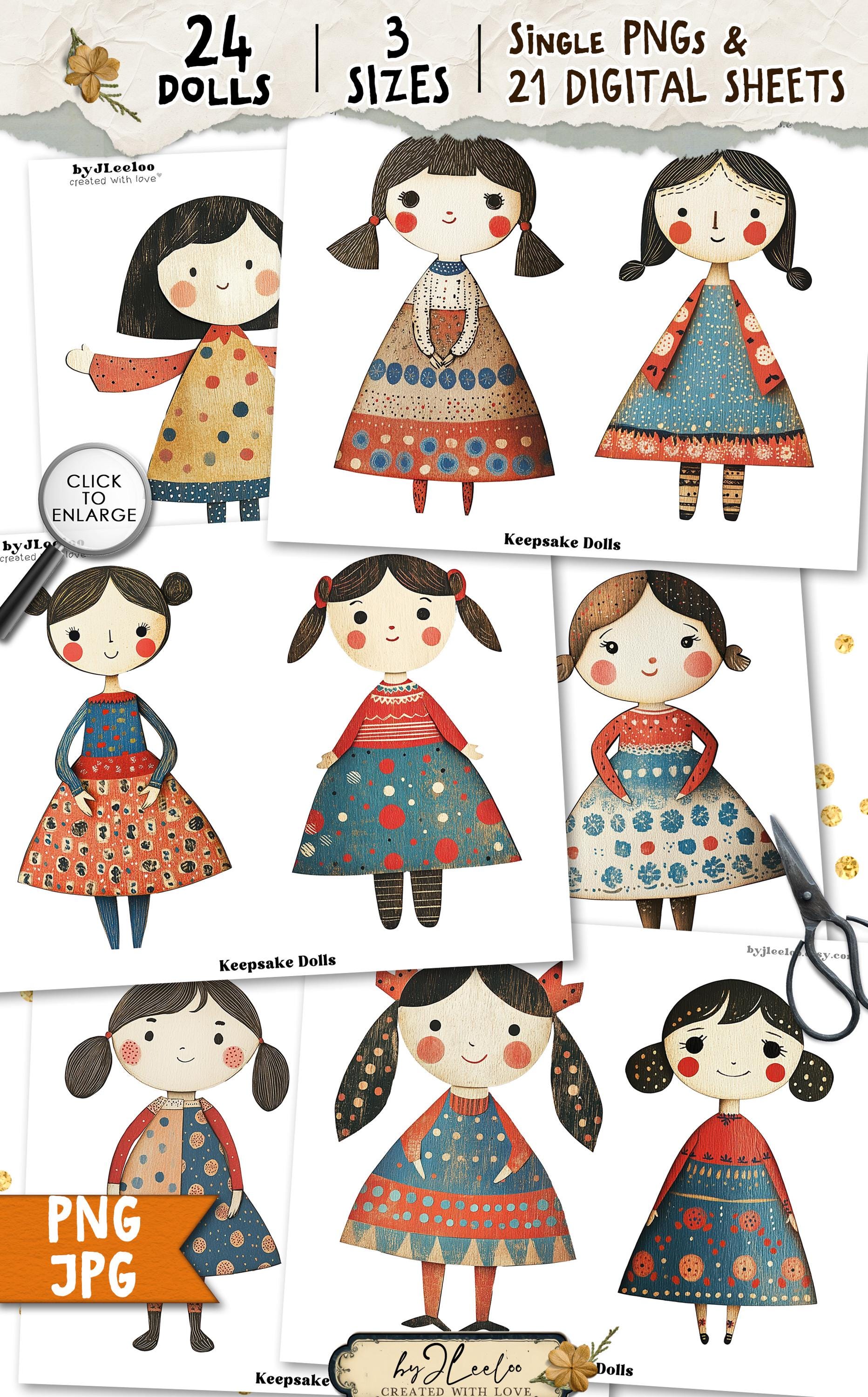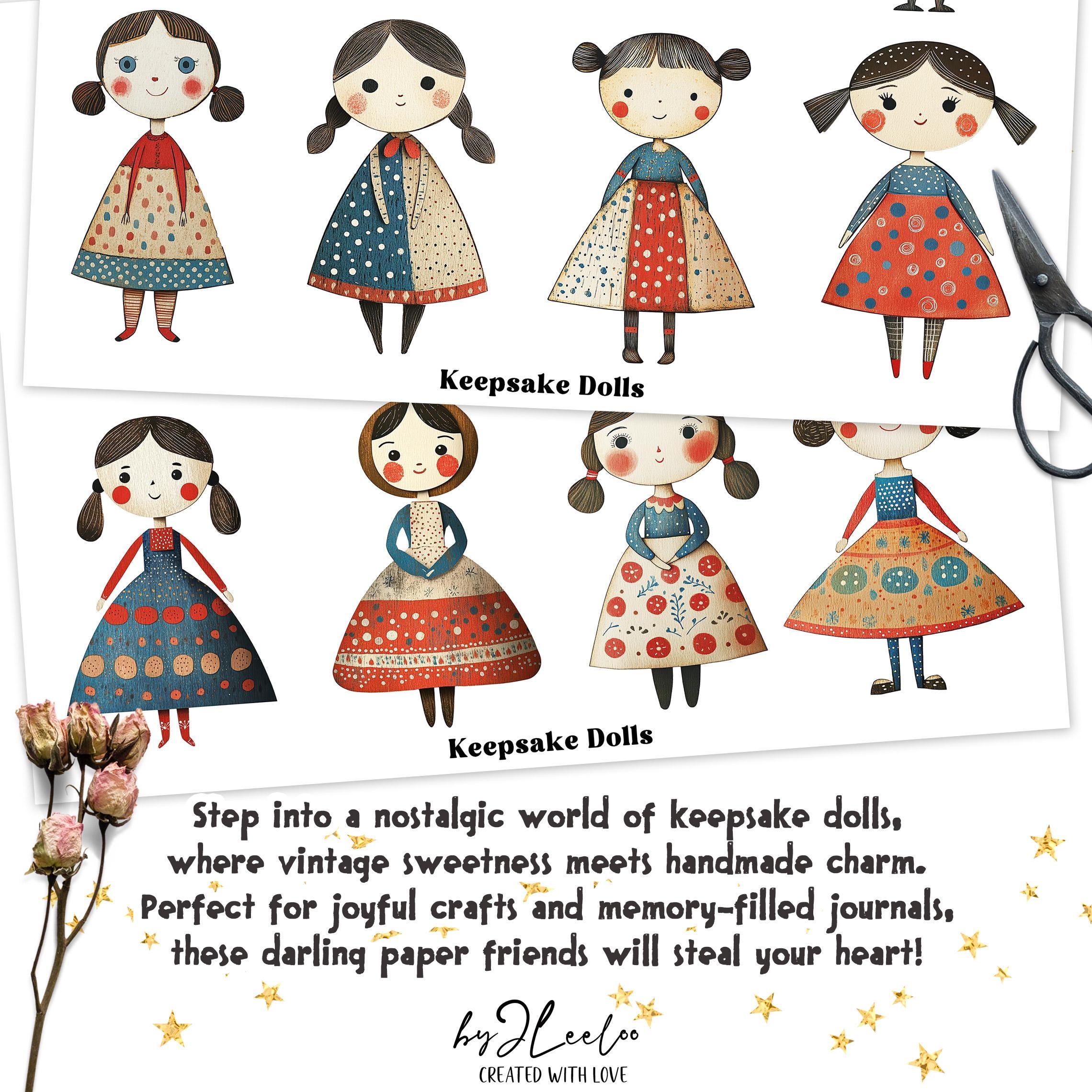 KEEPSAKE DOLLS - 24 Whimsical Paper Dolls in 3 Sizes | Vintage-Style Printable Clipart | Png + Jpg | Junk Journal & Craft Fussy Cut | pp956