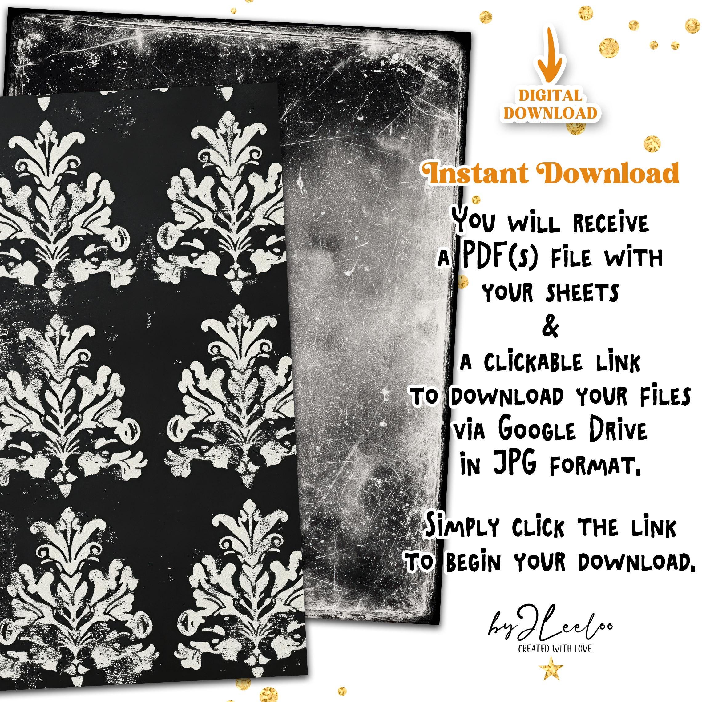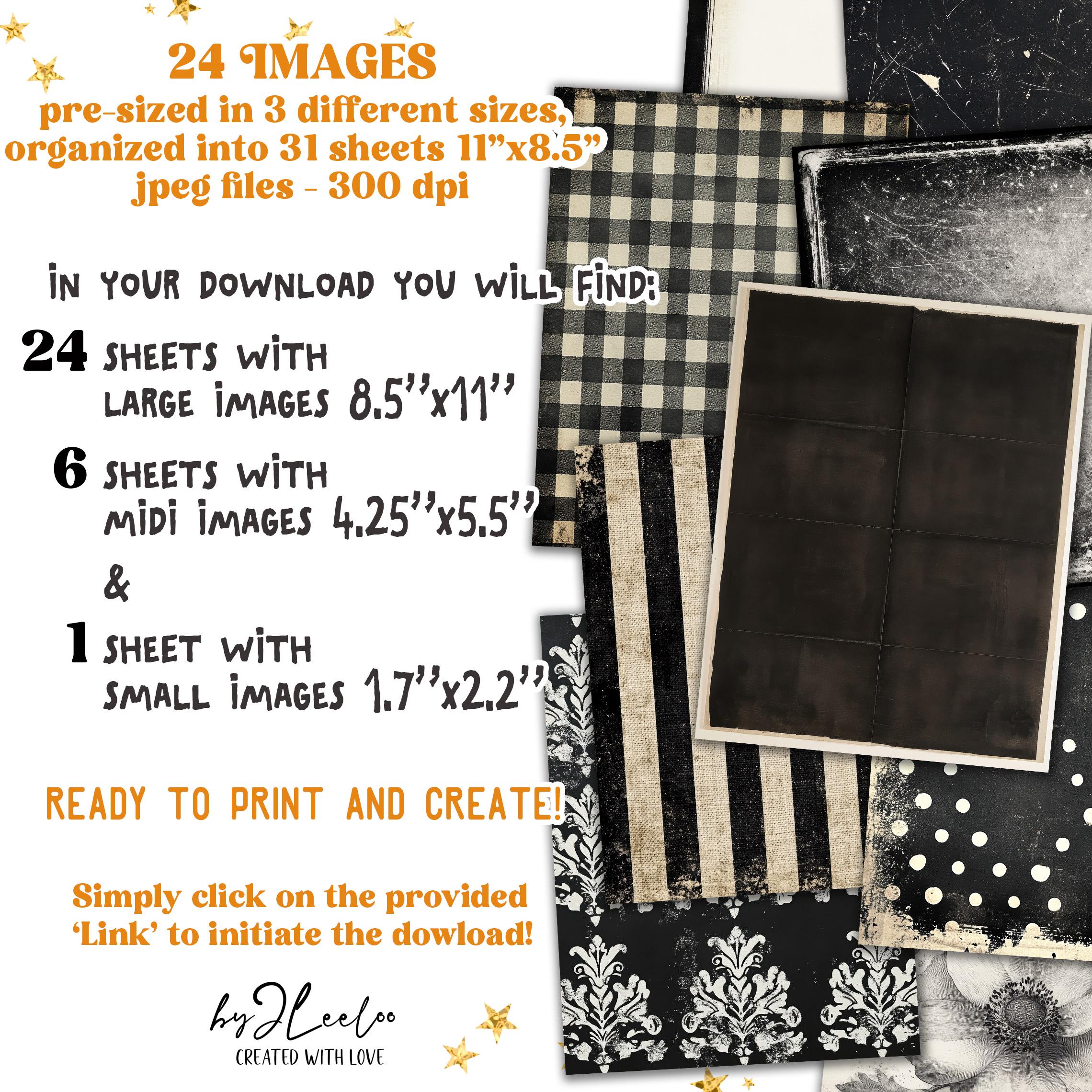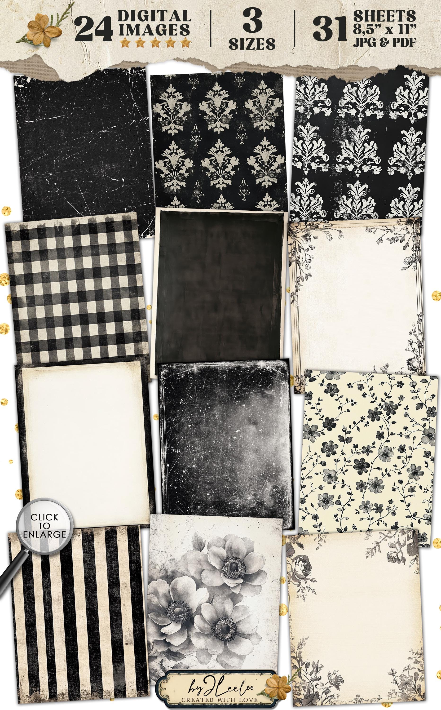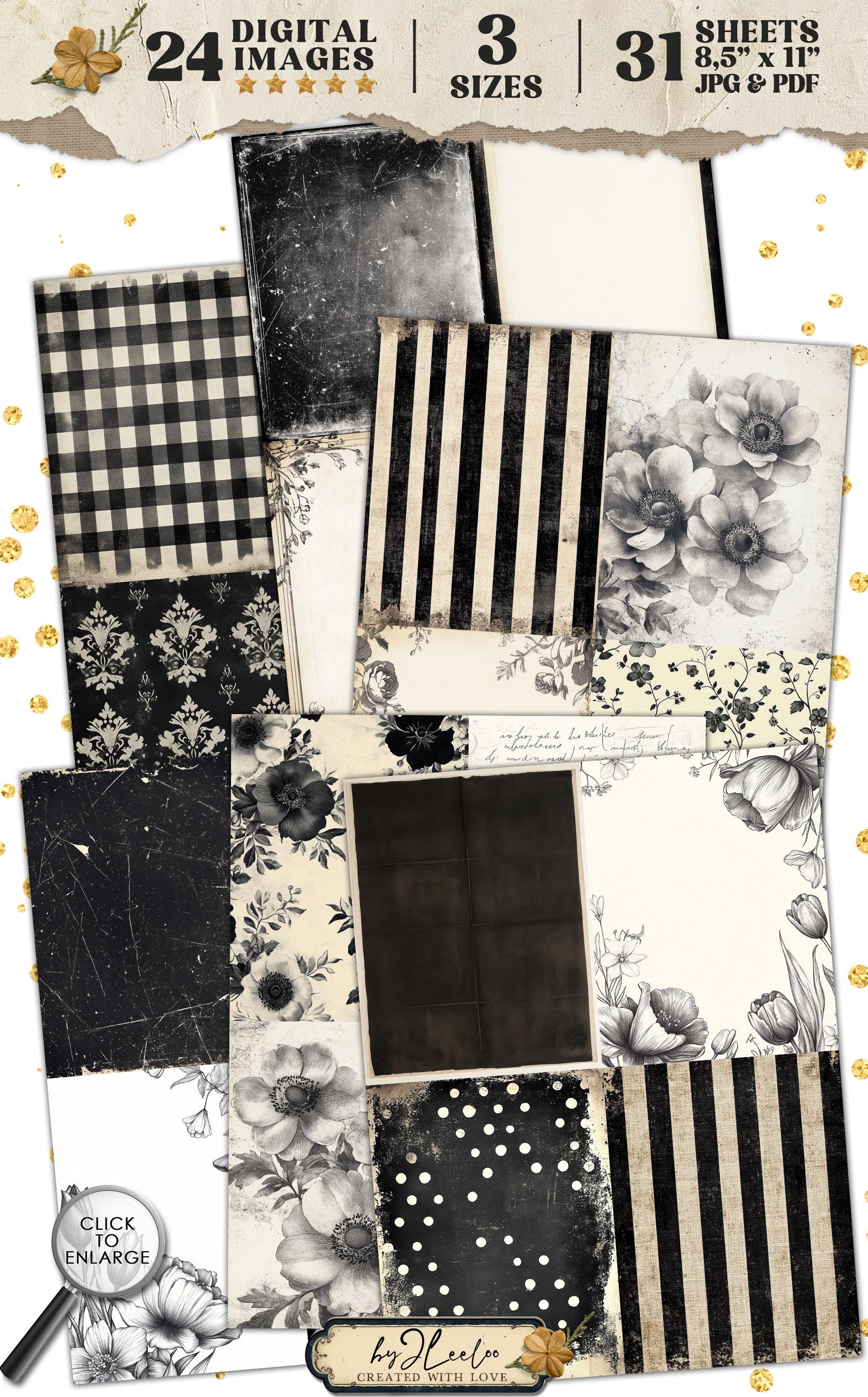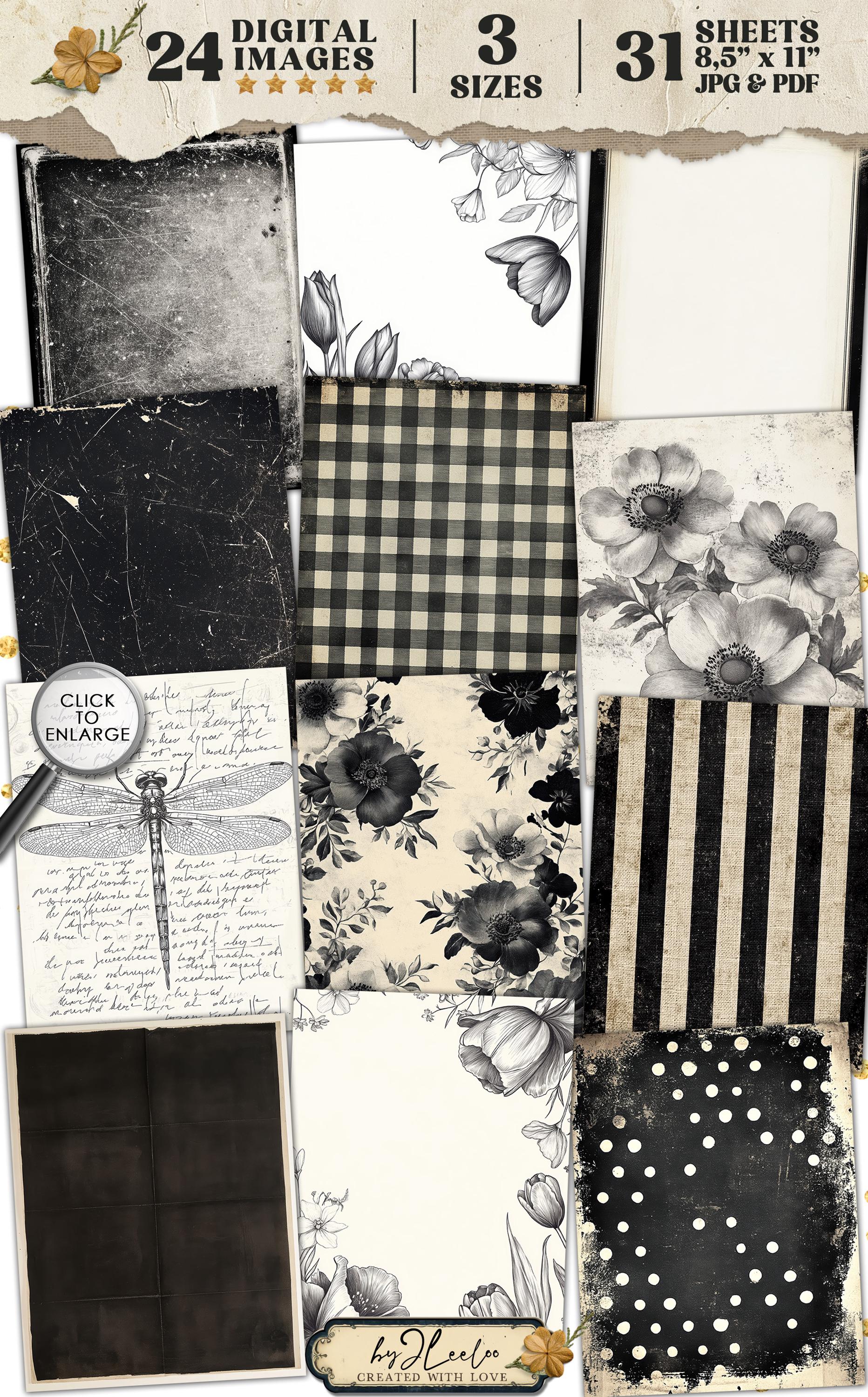 ✨ Discover the charm of timeless neutrals with this versatile collection of vintage-inspired backgrounds. Perfect for junk journals, scrapbooking, card making, and all your creative adventures, these black and white designs blend delicate florals, grungy textures, classic stripes, and cozy gingham patterns. Whether you love a bold statement or a soft antique vibe, this pack is here to bring character and depth to your projects. Let your creativity bloom with every page! ✨