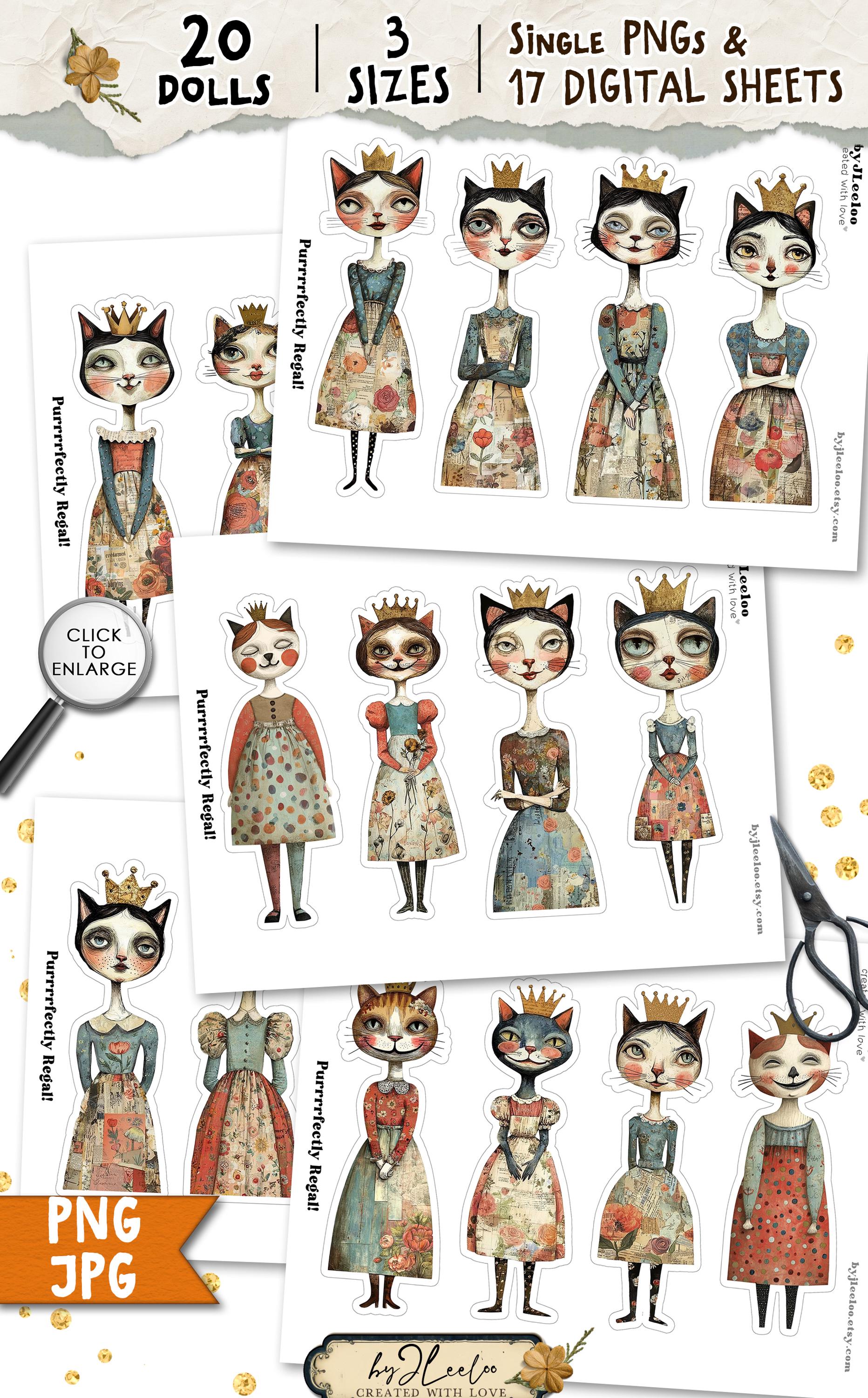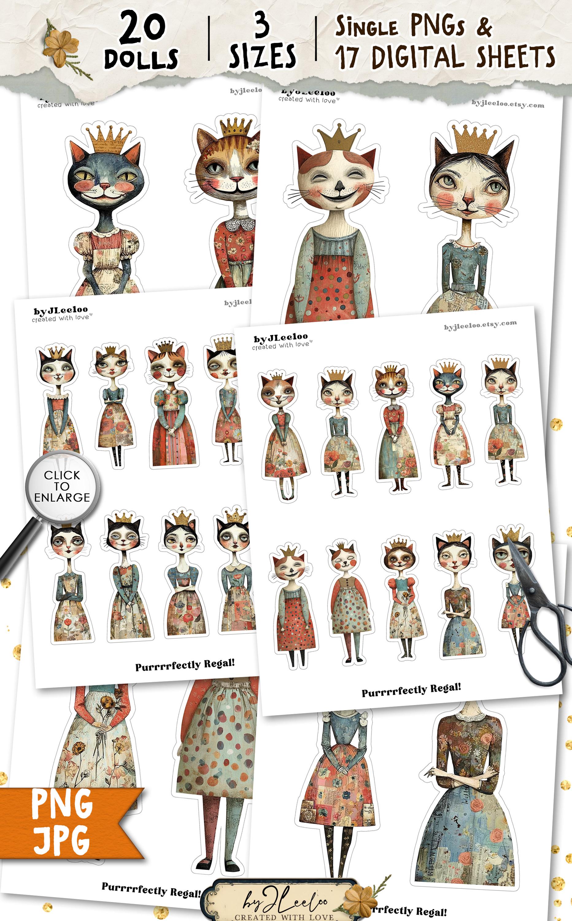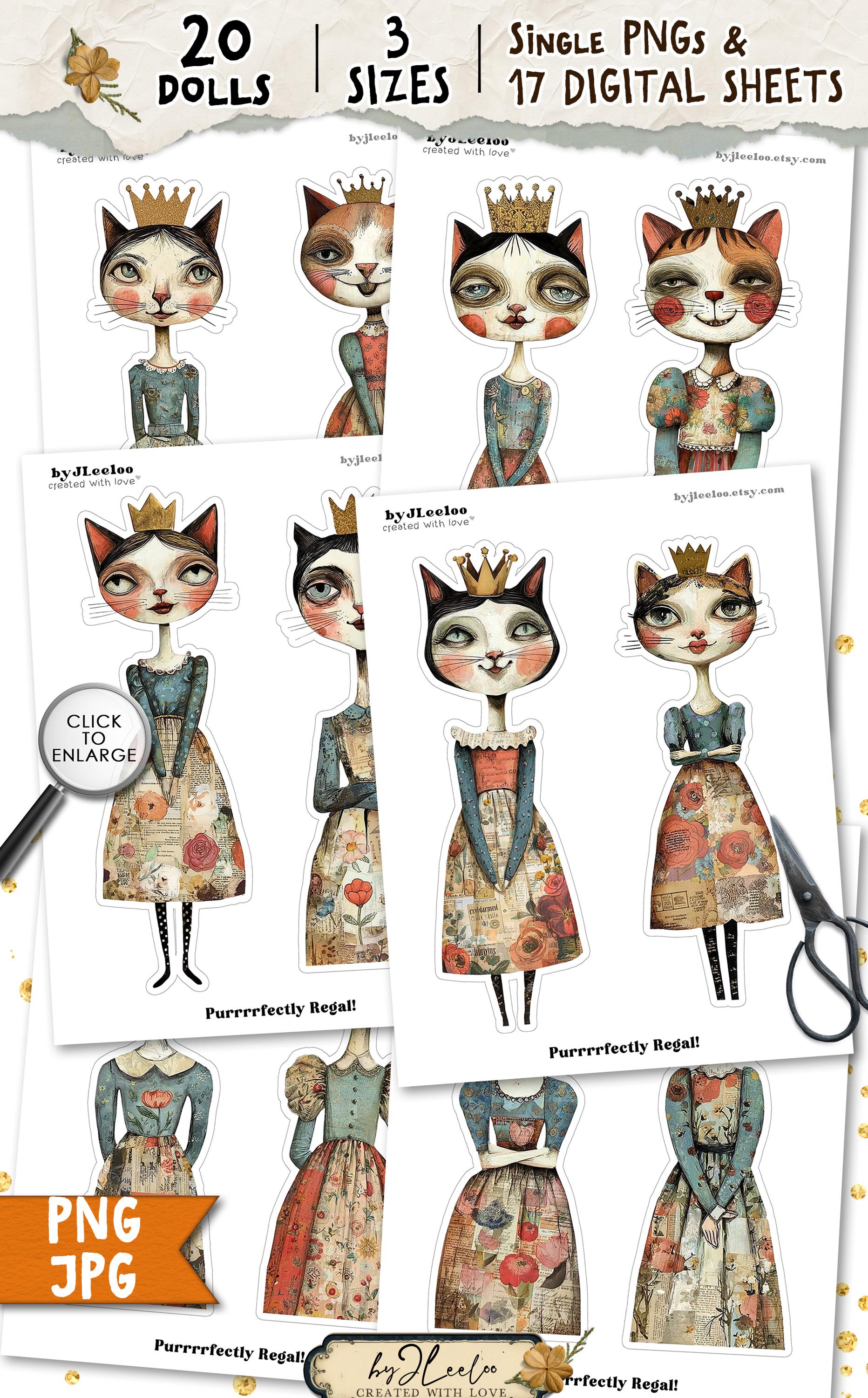 PURRRFECTLY REGAL - Printable PNG Paper Dolls for Junk Journal, Vintage Ephemera Clipart, Digital Scrapbooking, Fussy Cut for Cricut | pp960