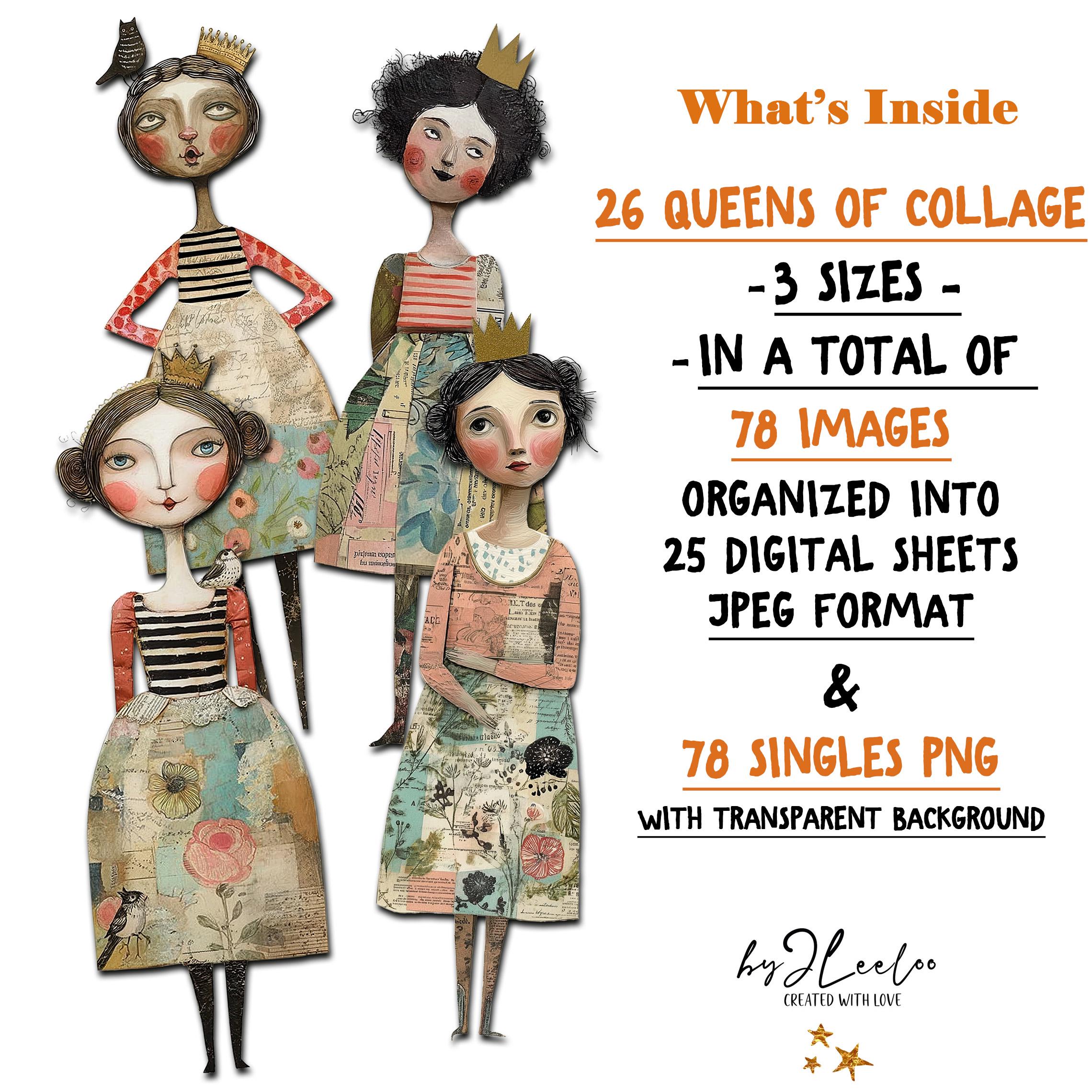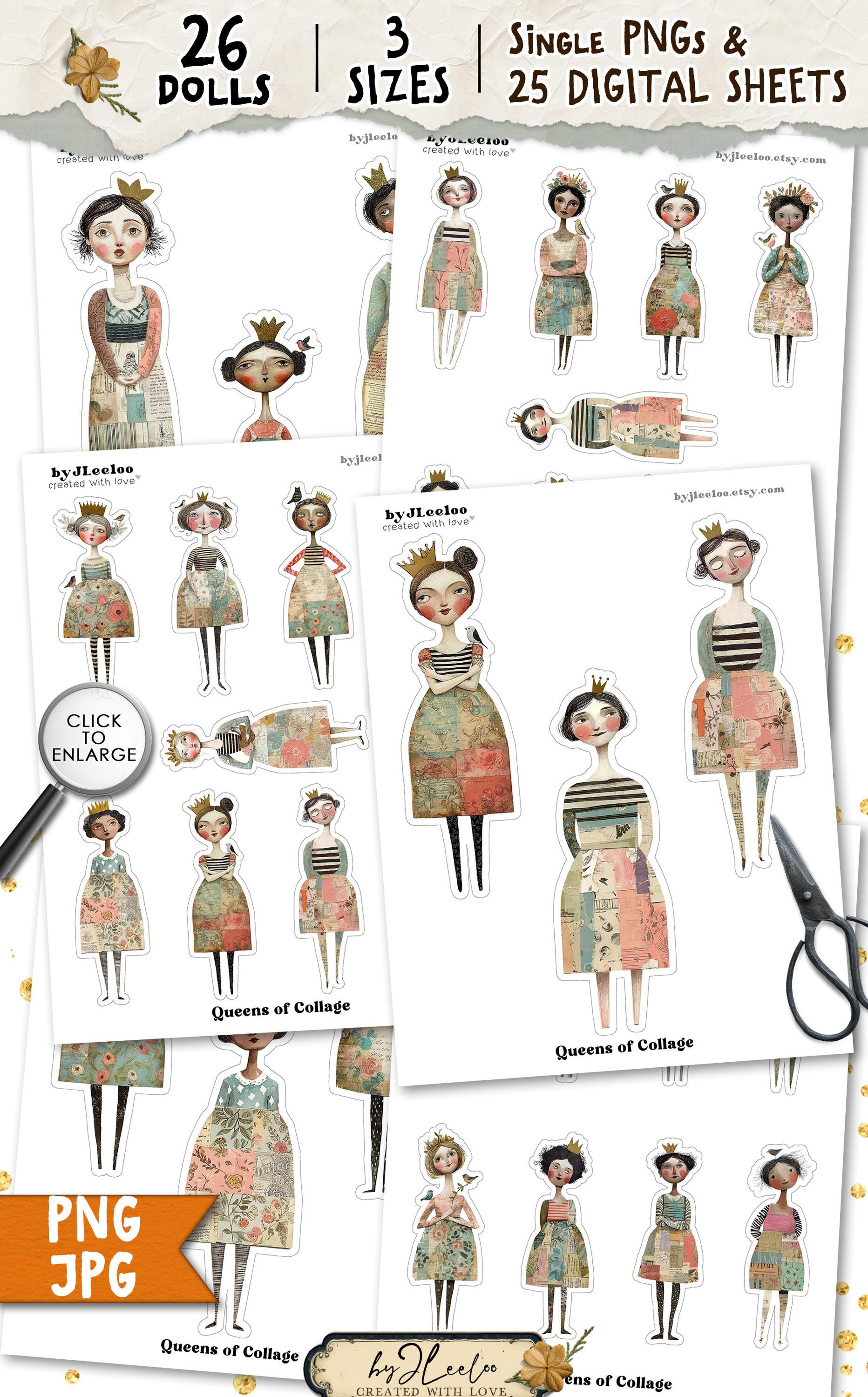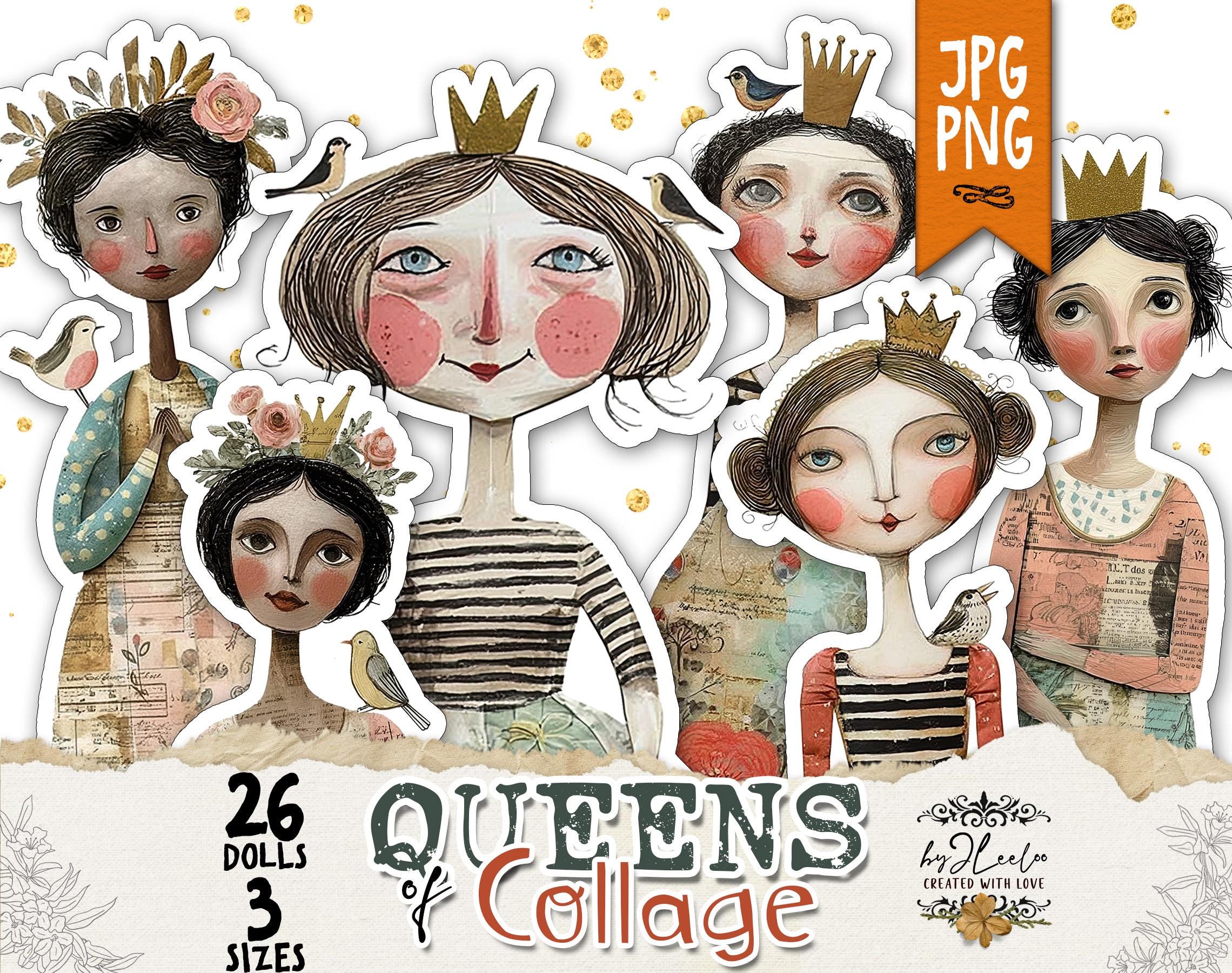 QUEENS of COLLAGE - Vintage Paper Dolls Set | 3 Sizes + PNGs with Transparent Background | Junk Journal Scrapbooking | Clipart Fussy Cut for Cricut CU | pp961