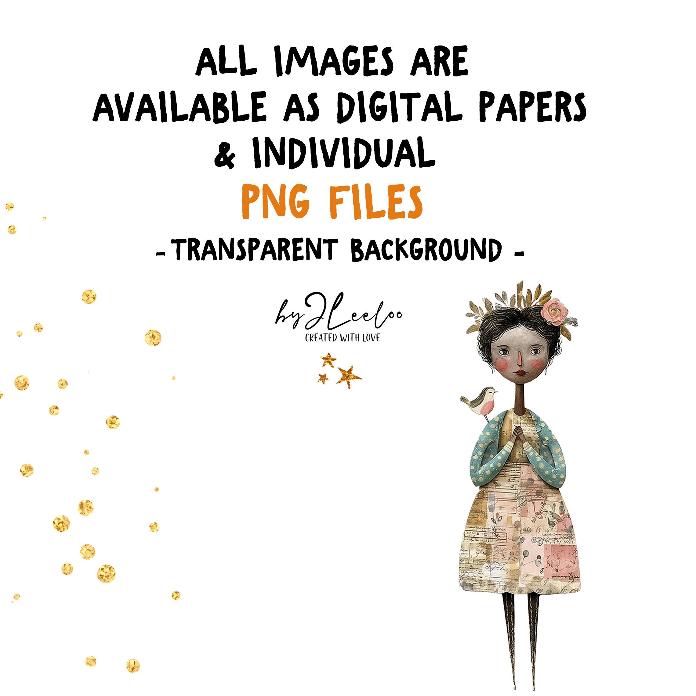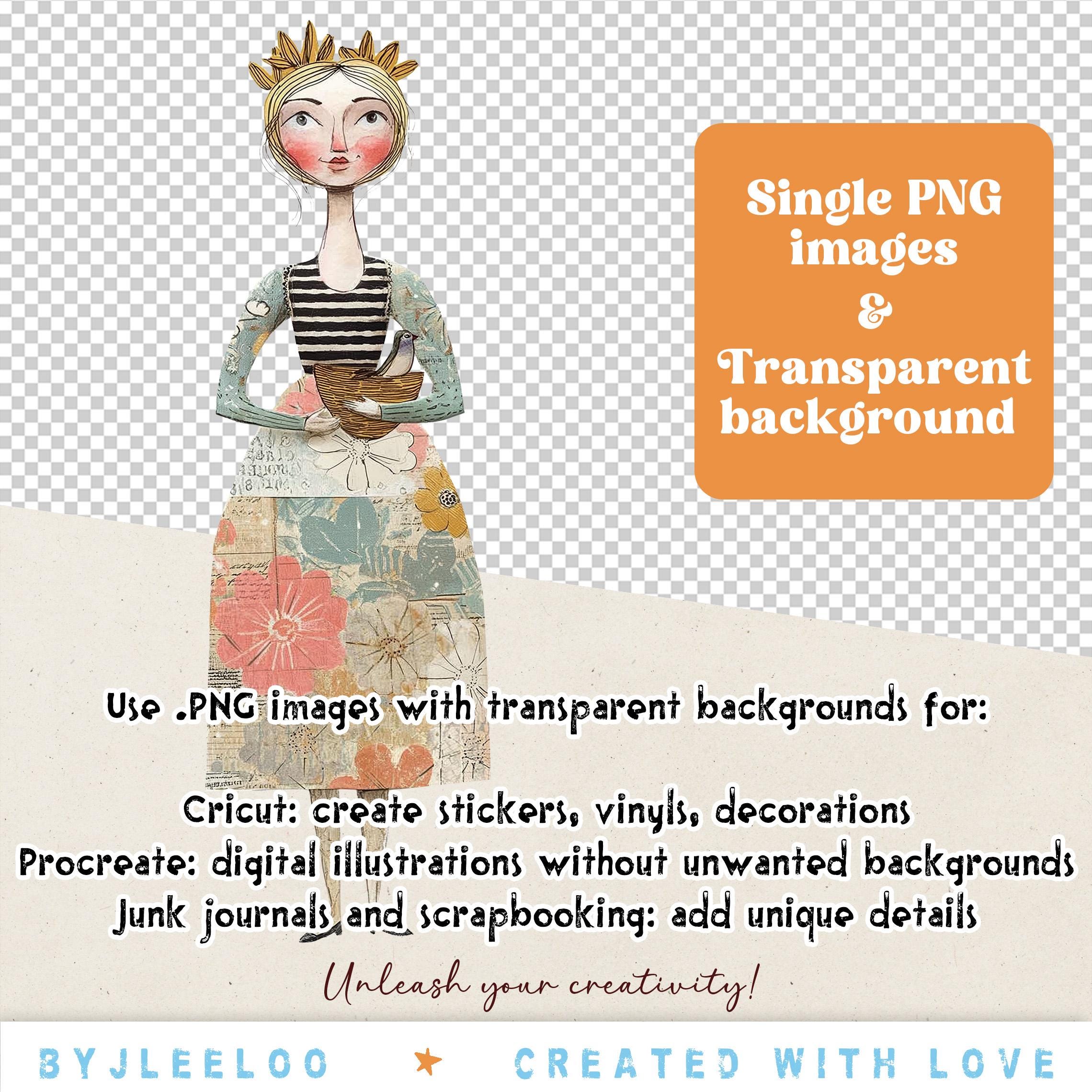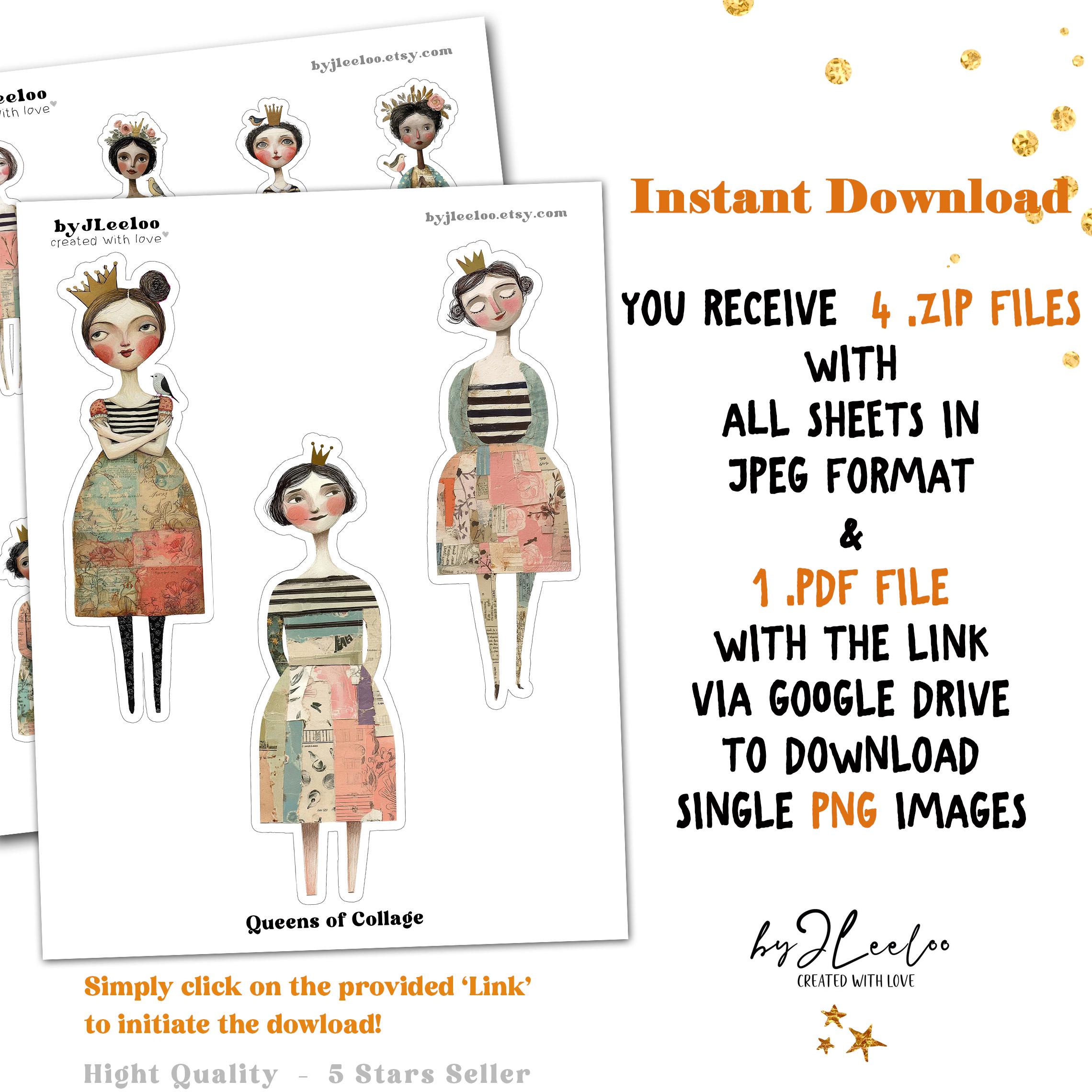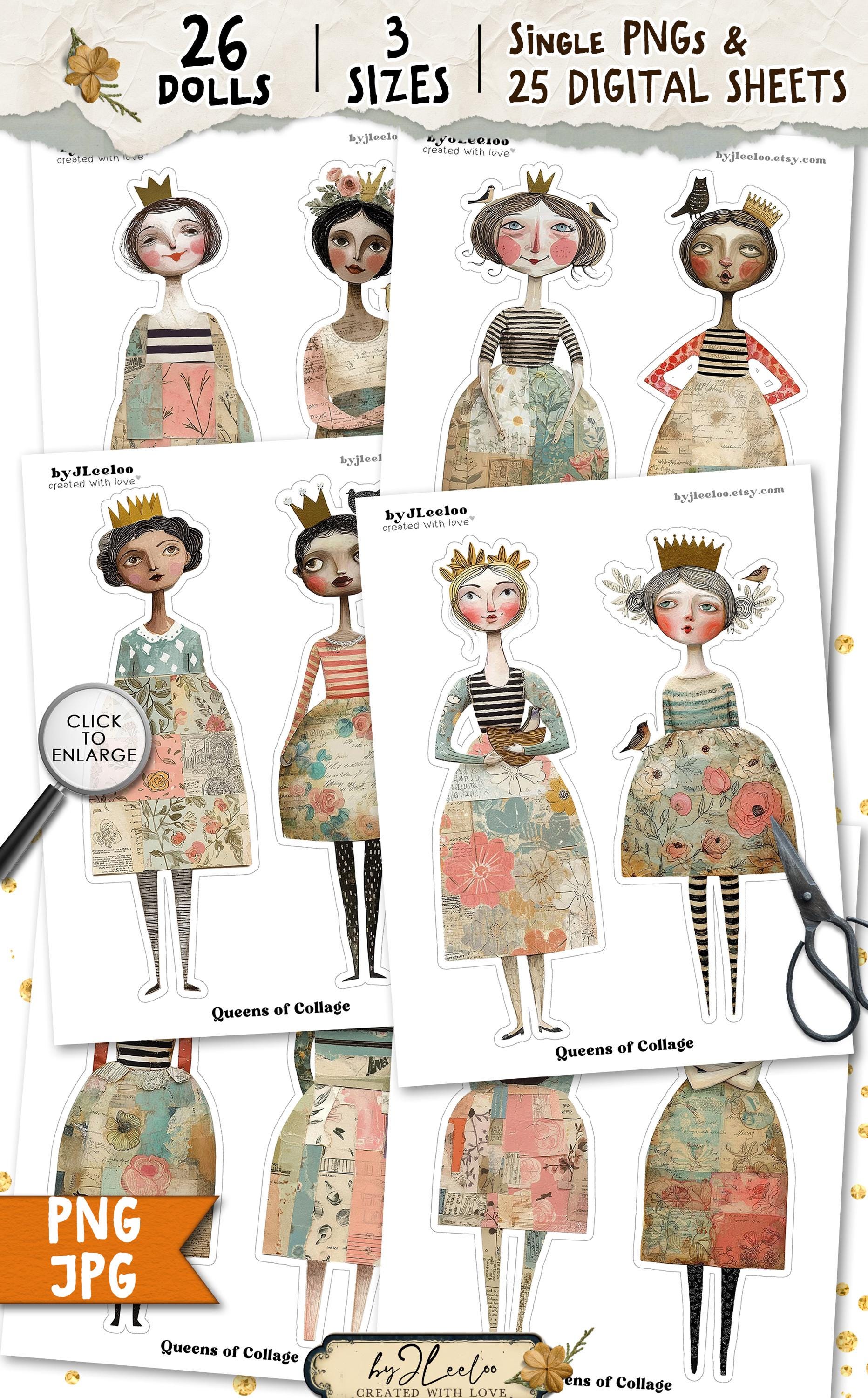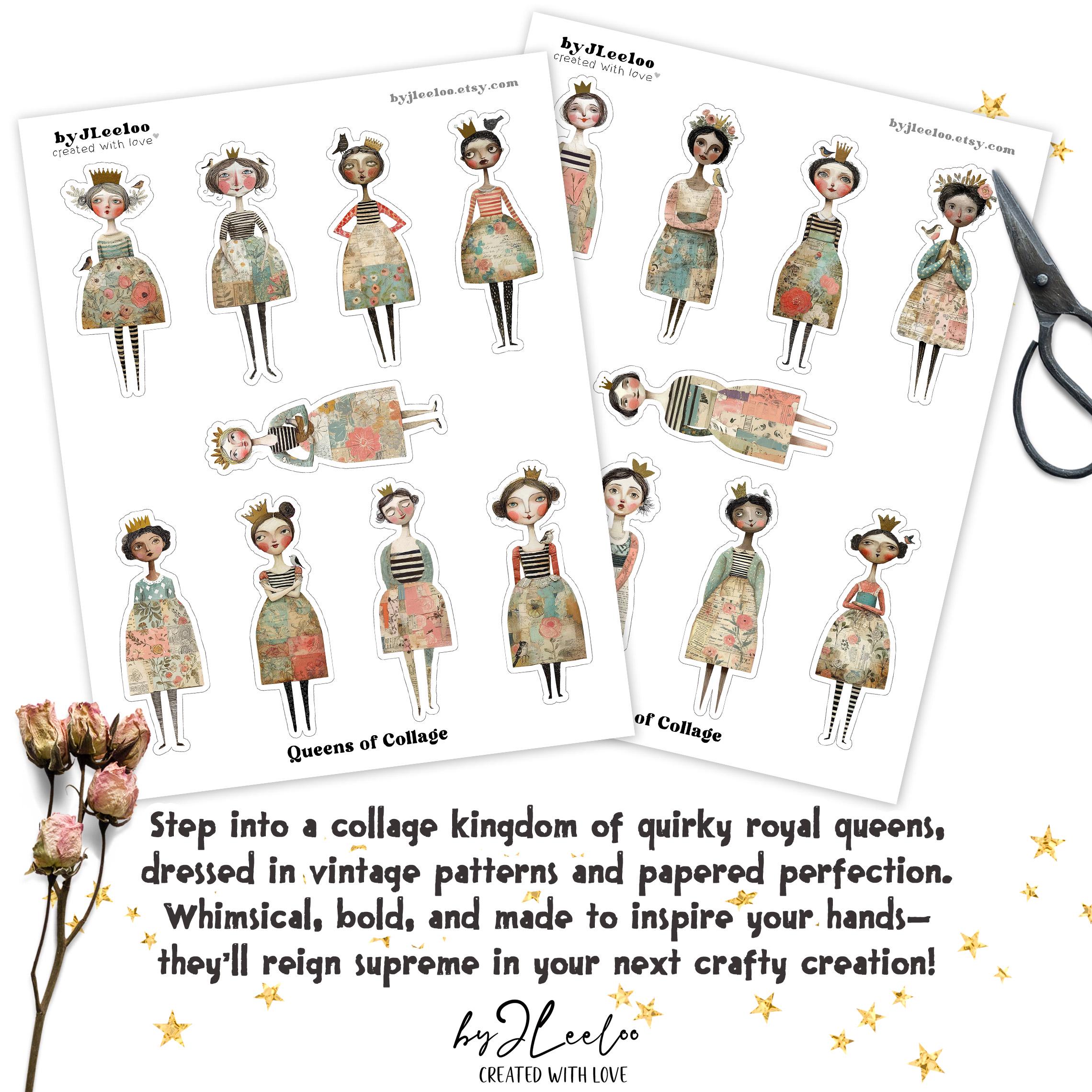 ✨ Say hello to the Queens of Collage! These whimsical paper dolls are here to sprinkle charm and creativity into your crafting world. With their delightful collage outfits, vintage flair, and a touch of royal fun, they’re perfect for junk journals, scrapbooks, planners, and all your artsy adventures. You’ll get them in different sizes, ready to print or use as transparent PNGs—because who doesn’t love options? Let these lovely queens inspire your next handmade masterpiece! ✨