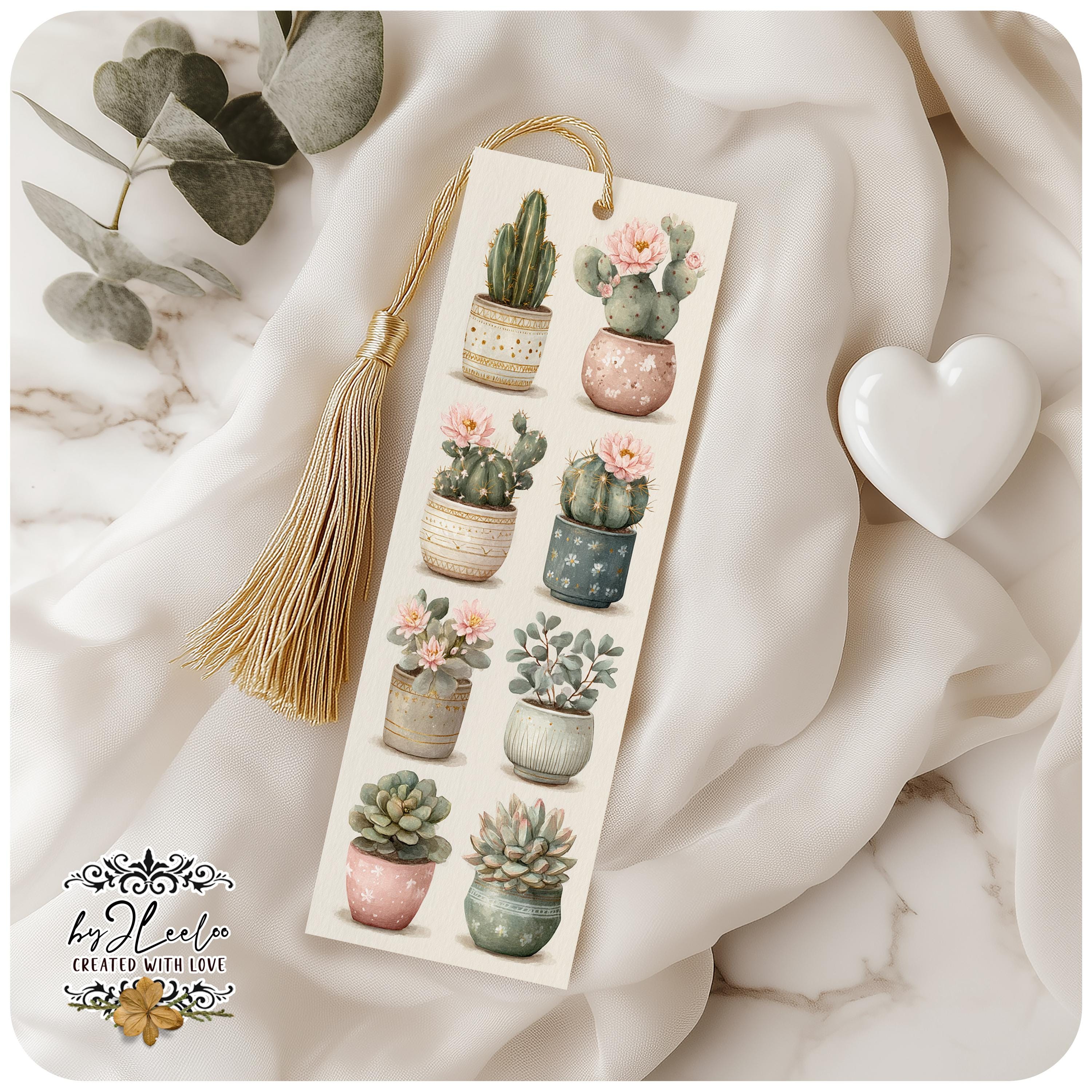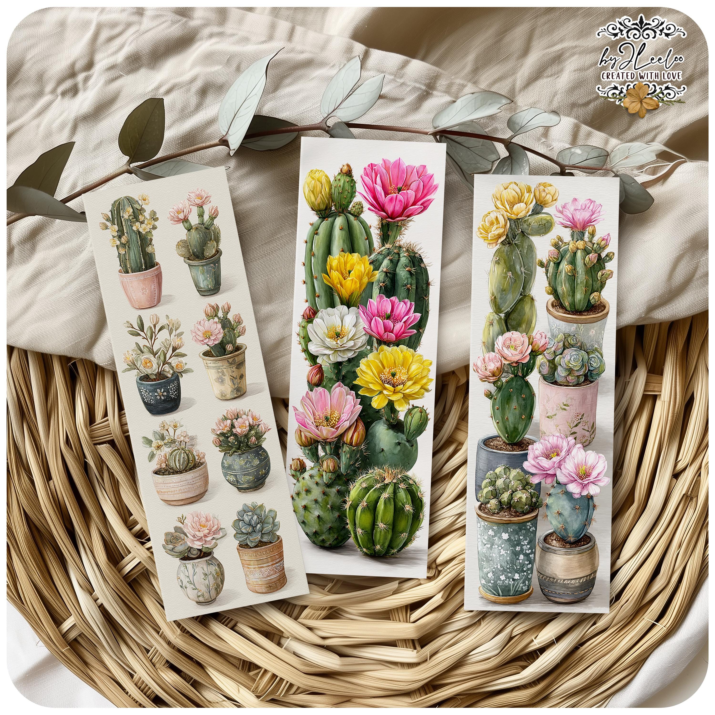 Desert Bloom is a vibrant collection of printable botanical bookmarks featuring blooming cacti, succulents in painted pots, and soft watercolor textures.