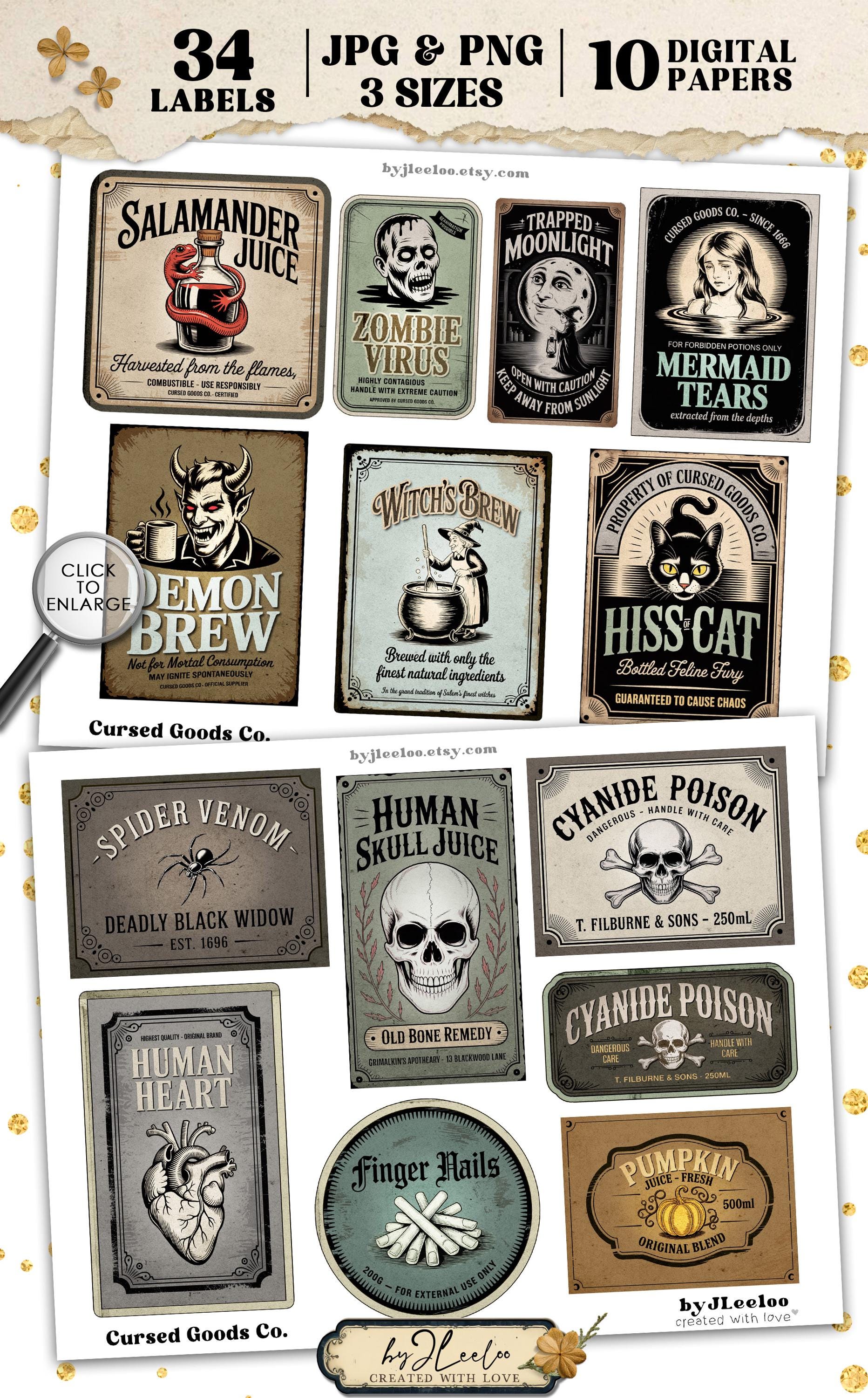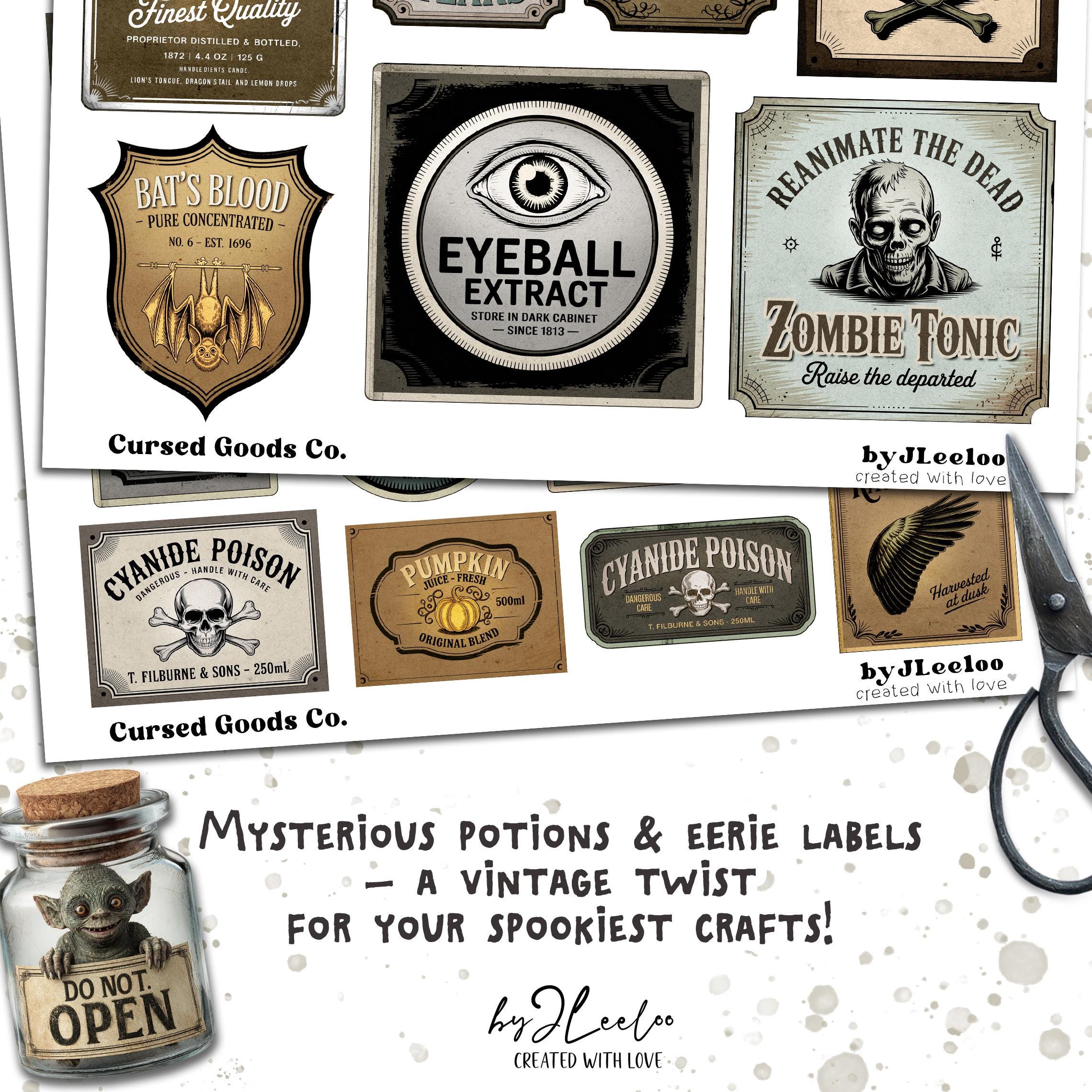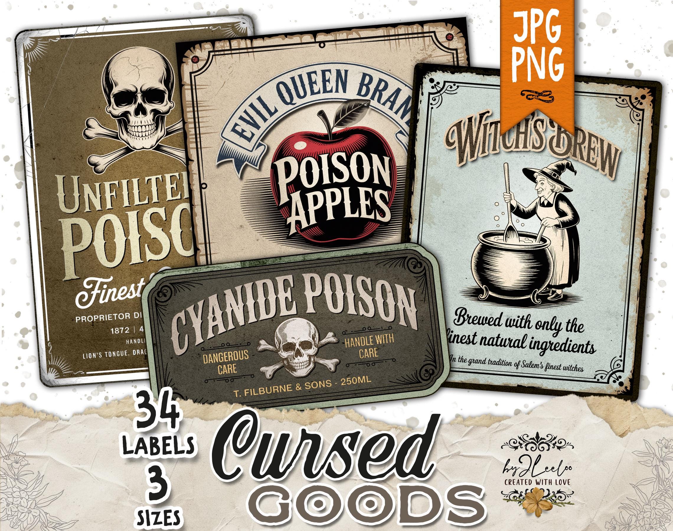 CURSED GOODS Co 34 Vintage Poison & Potion Labels | Halloween Apothecary Party Tags in 3 Sizes | Printable Ephemera Jpg + PNG | tl324