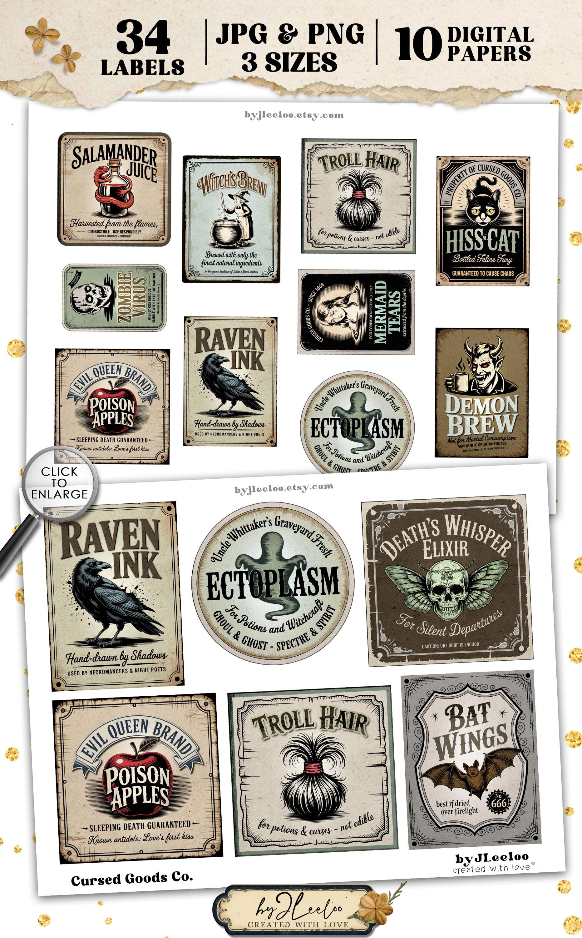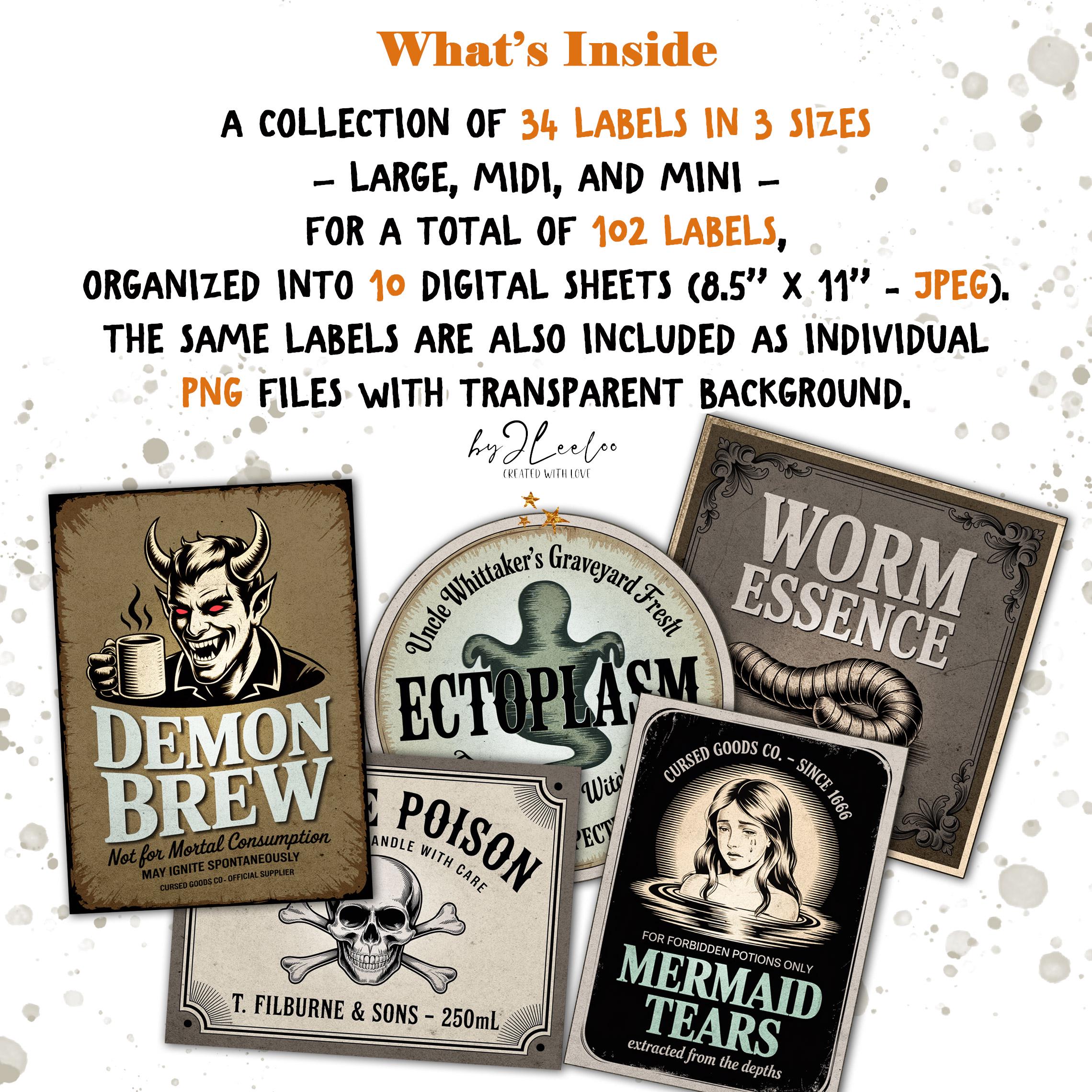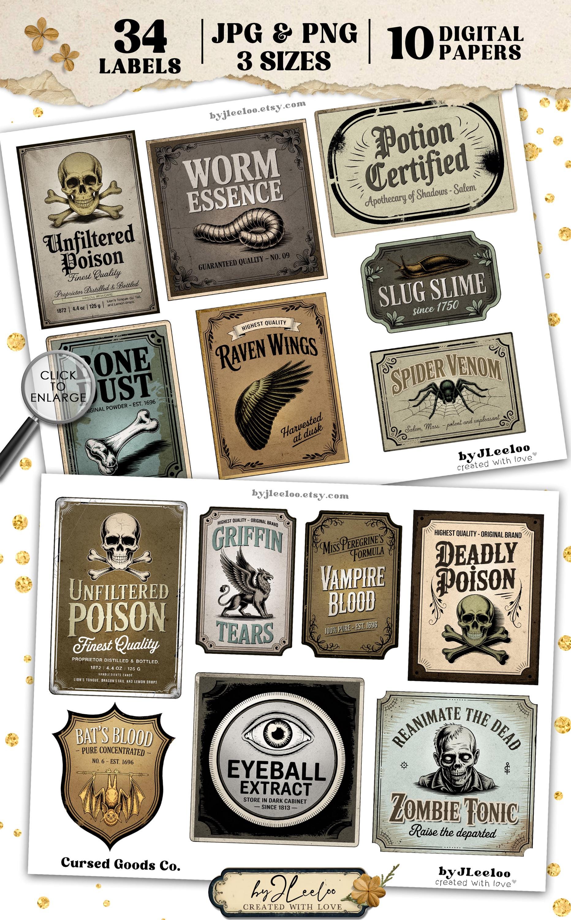 CURSED GOODS Co 34 Vintage Poison & Potion Labels | Halloween Apothecary Party Tags in 3 Sizes | Printable Ephemera Jpg + PNG | tl324