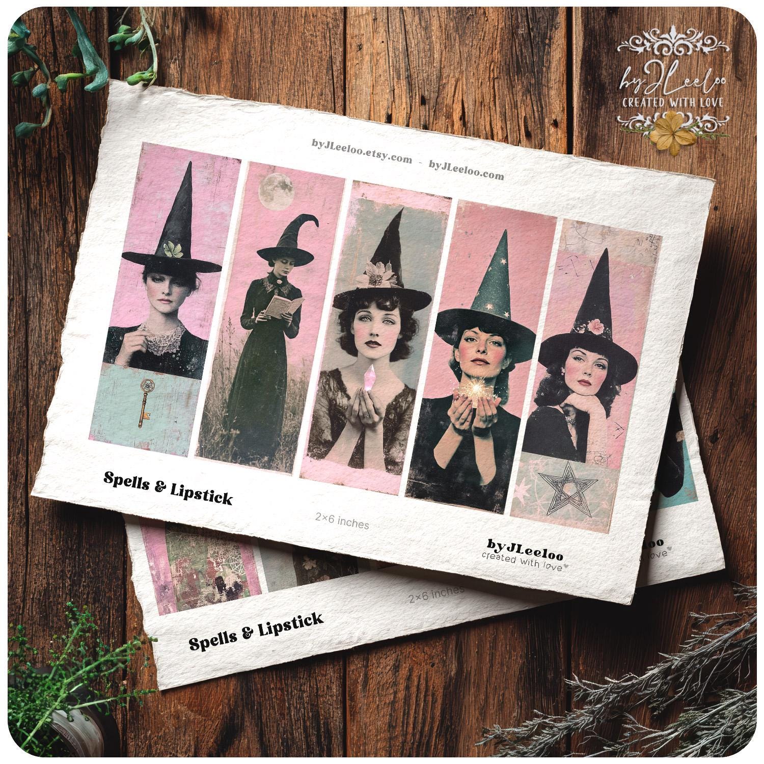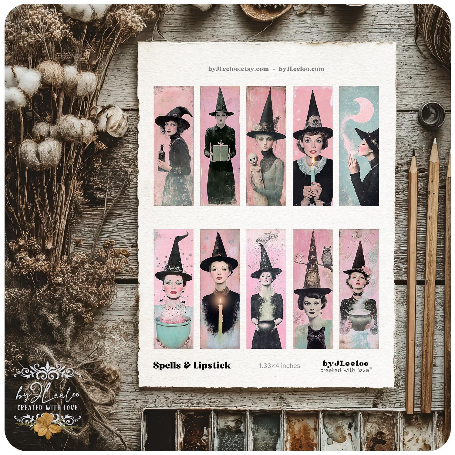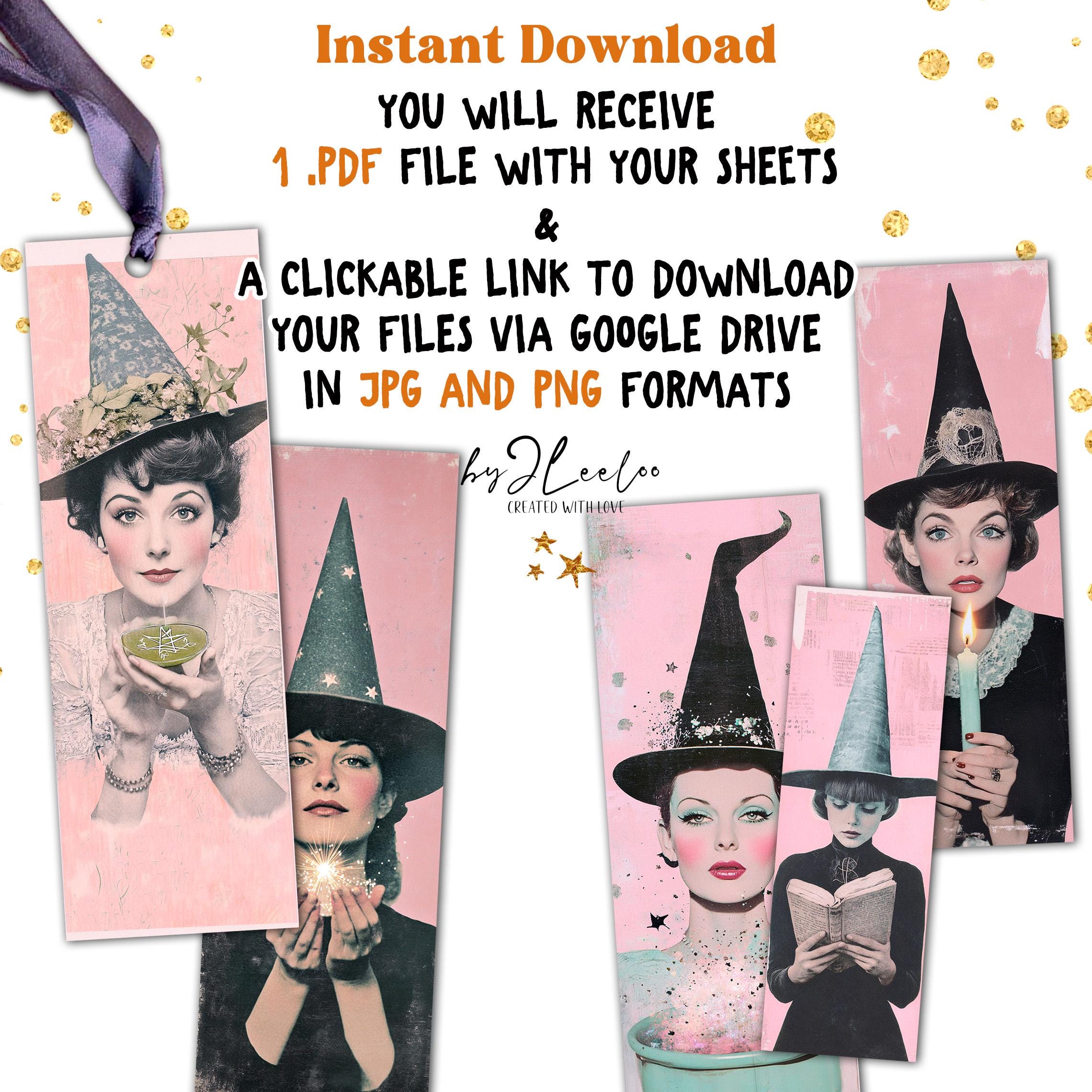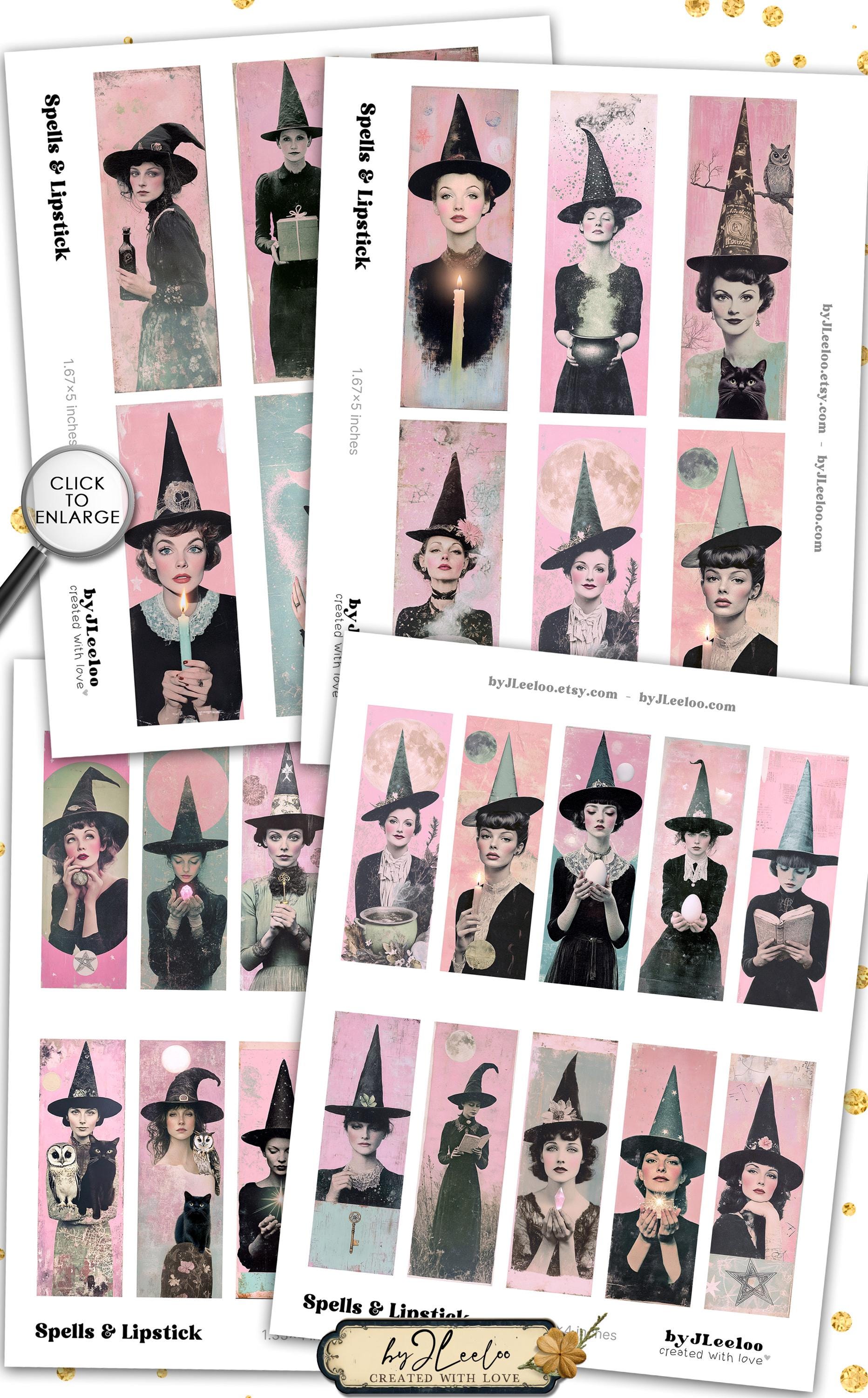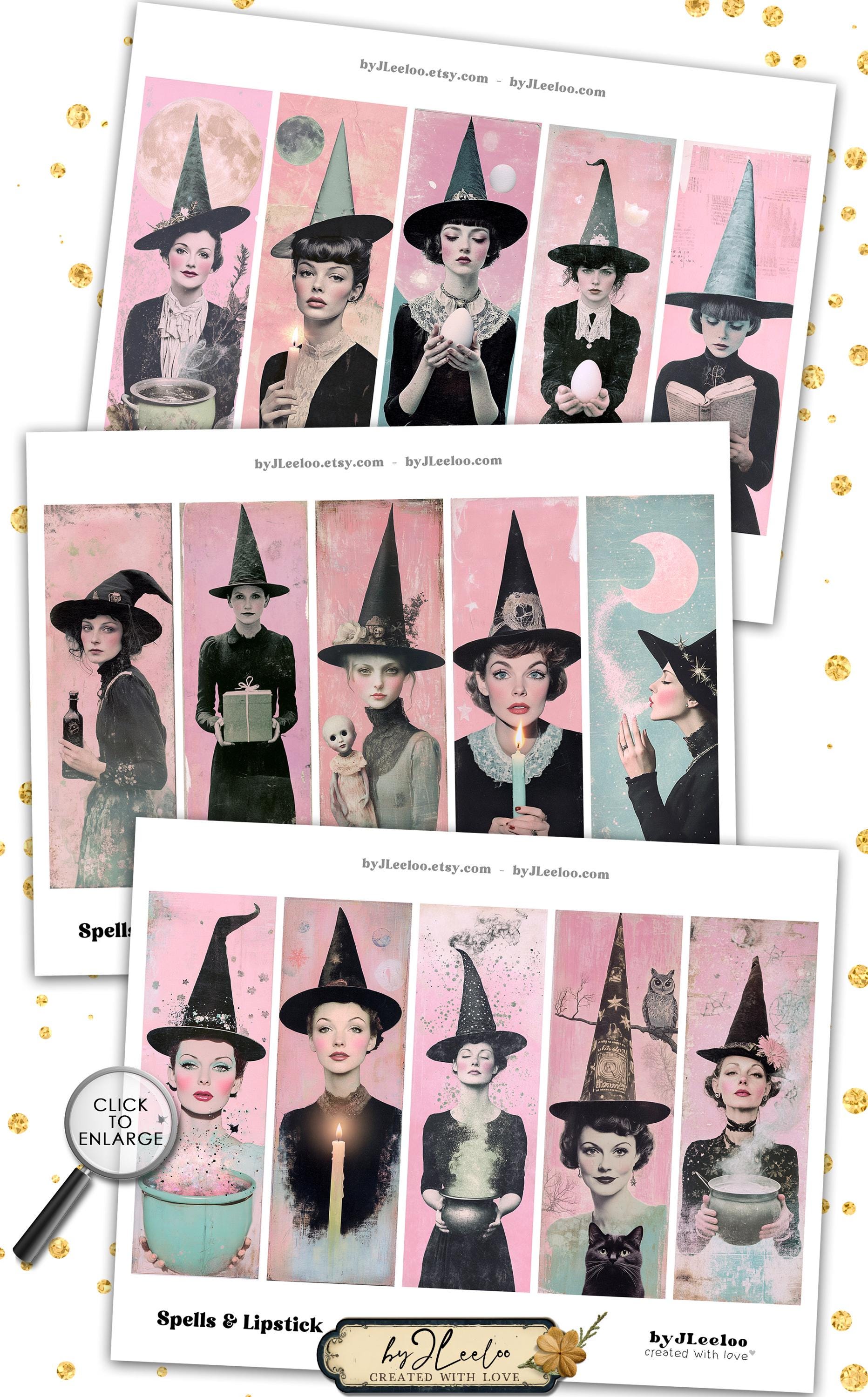 SPELLS and LIPSTICK Printable Witch Bookmarks 3 Sizes | Retro Halloween Witches Pink Gothic Ephemera for Junk Journal & Scrapbooking | bm133