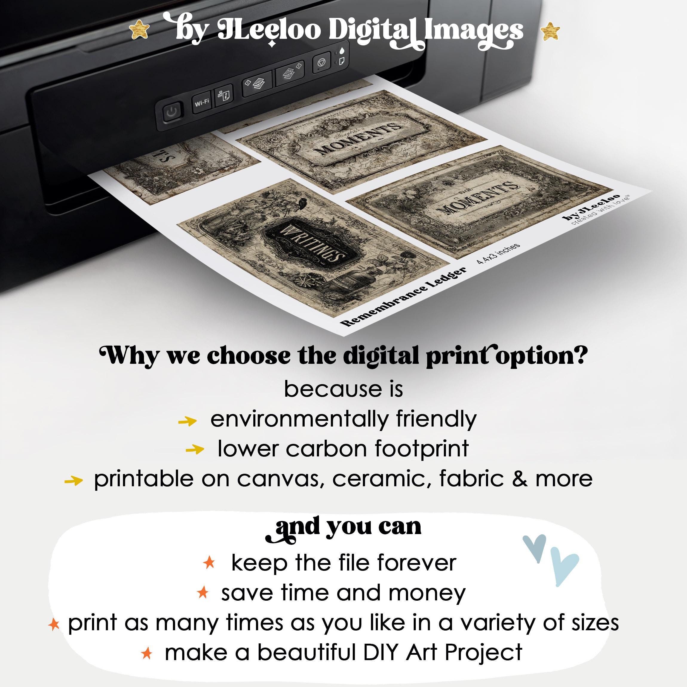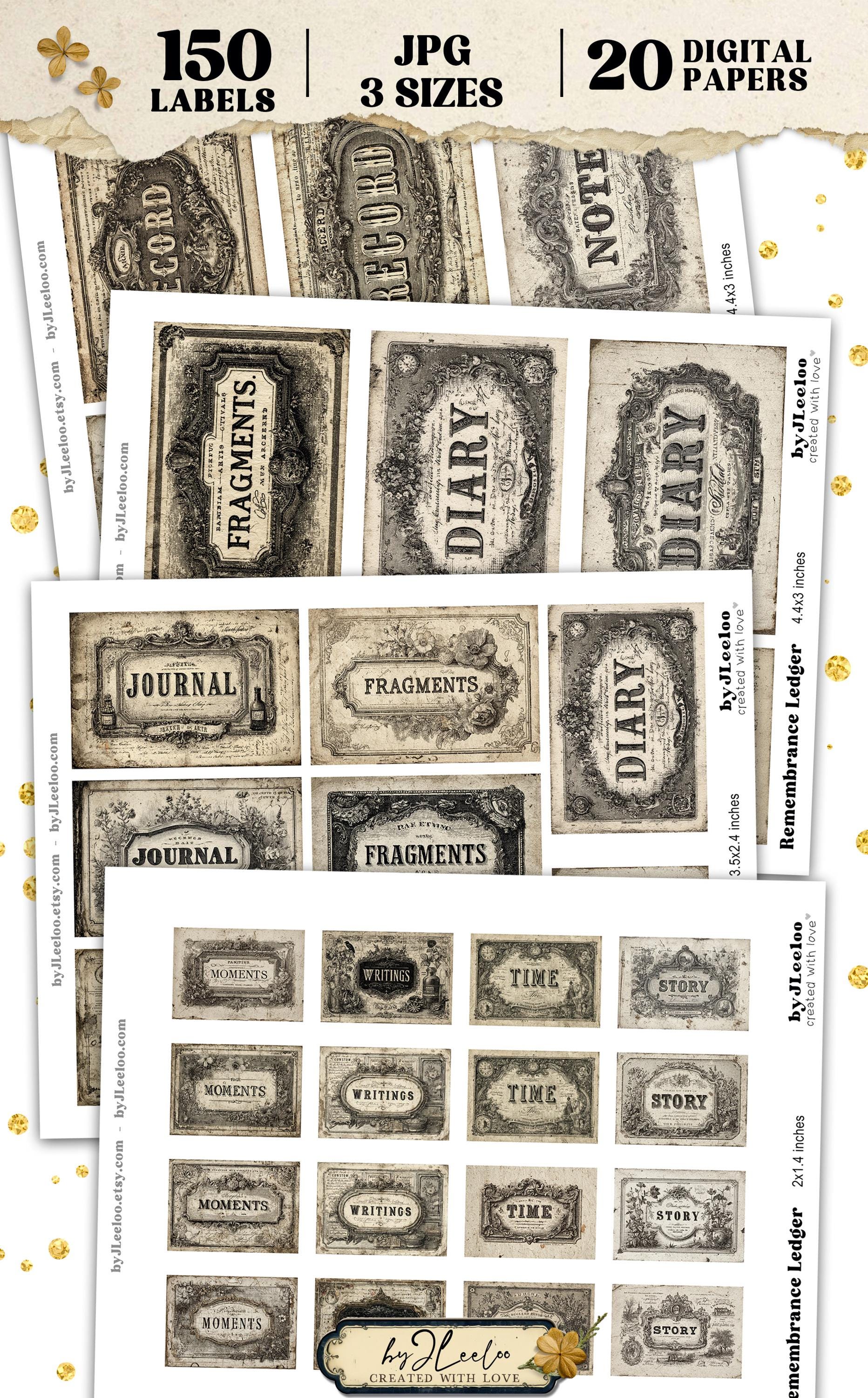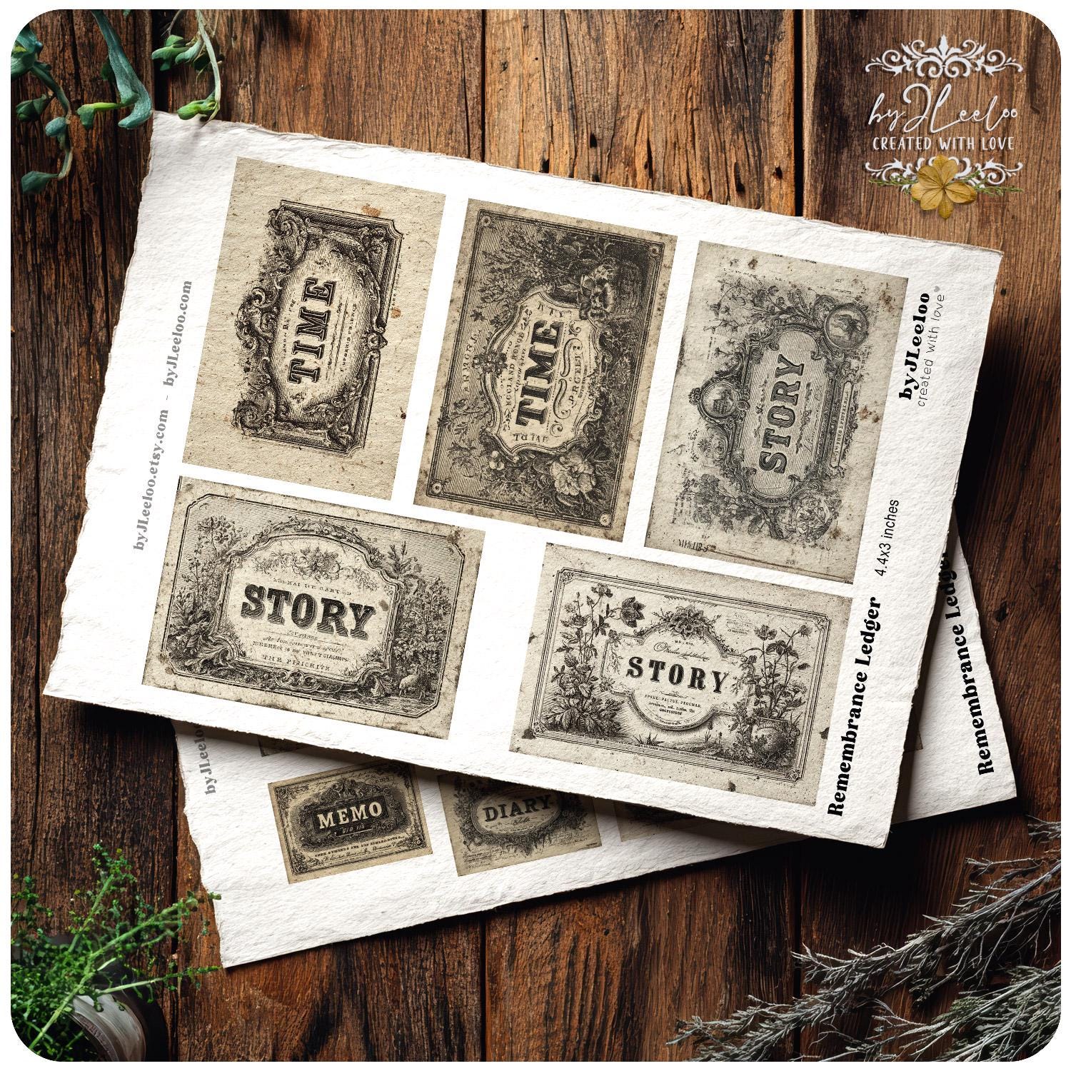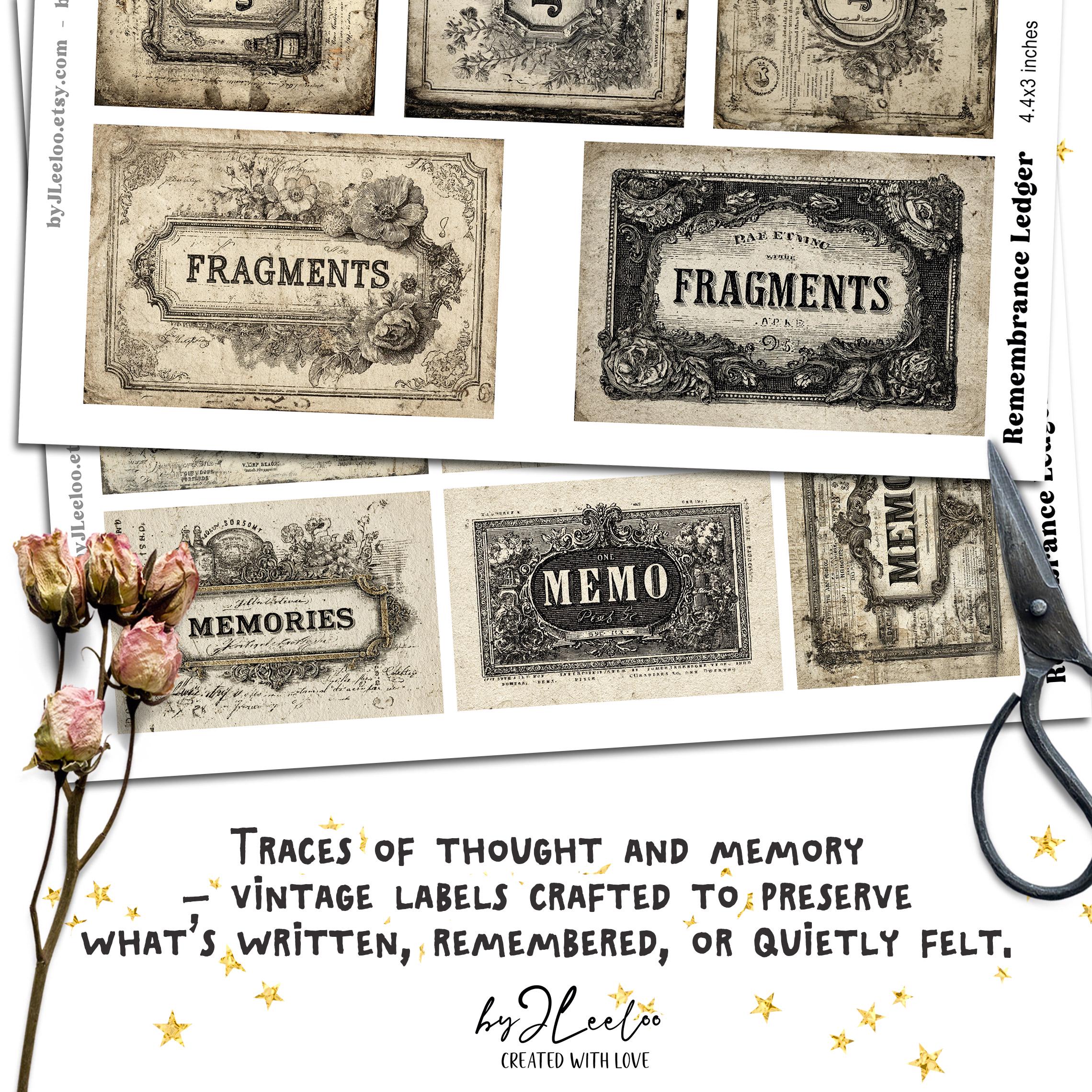 Remembrance Ledger is a curated collection of 150 printable vintage labels, each inscribed with evocative words like Note, Journal, Record, Writings, Memo, Time, and Memories.