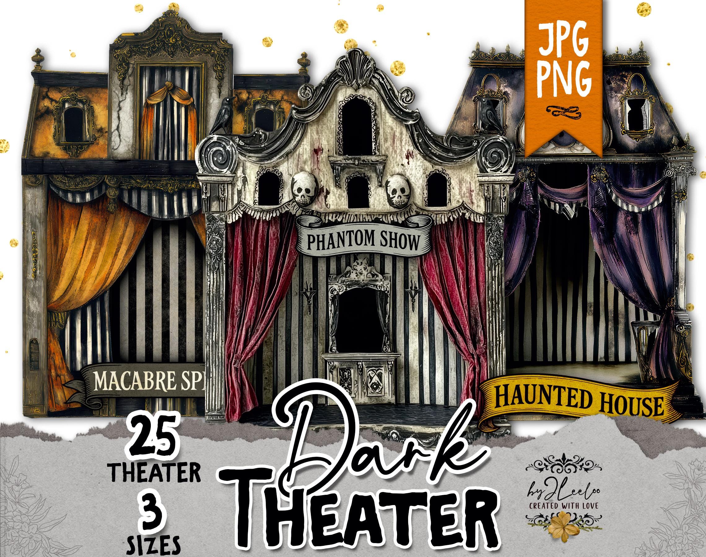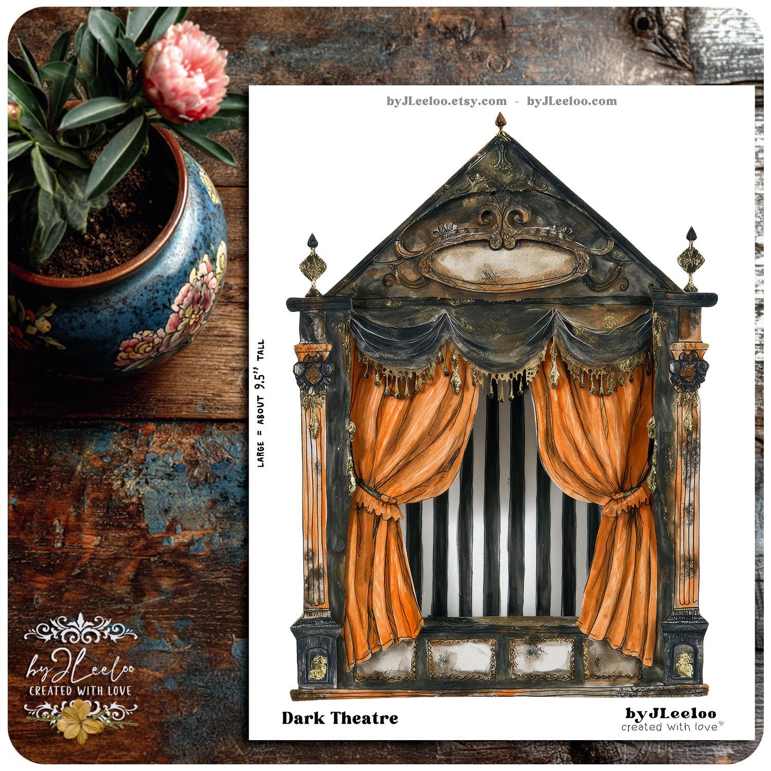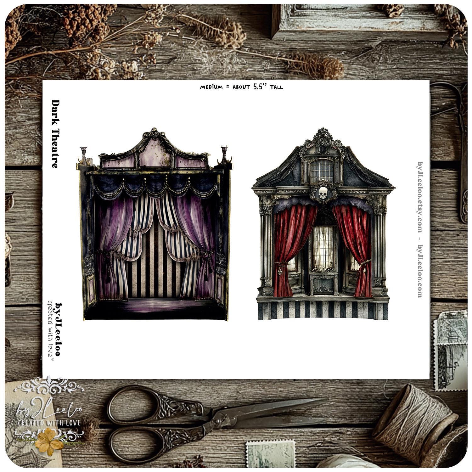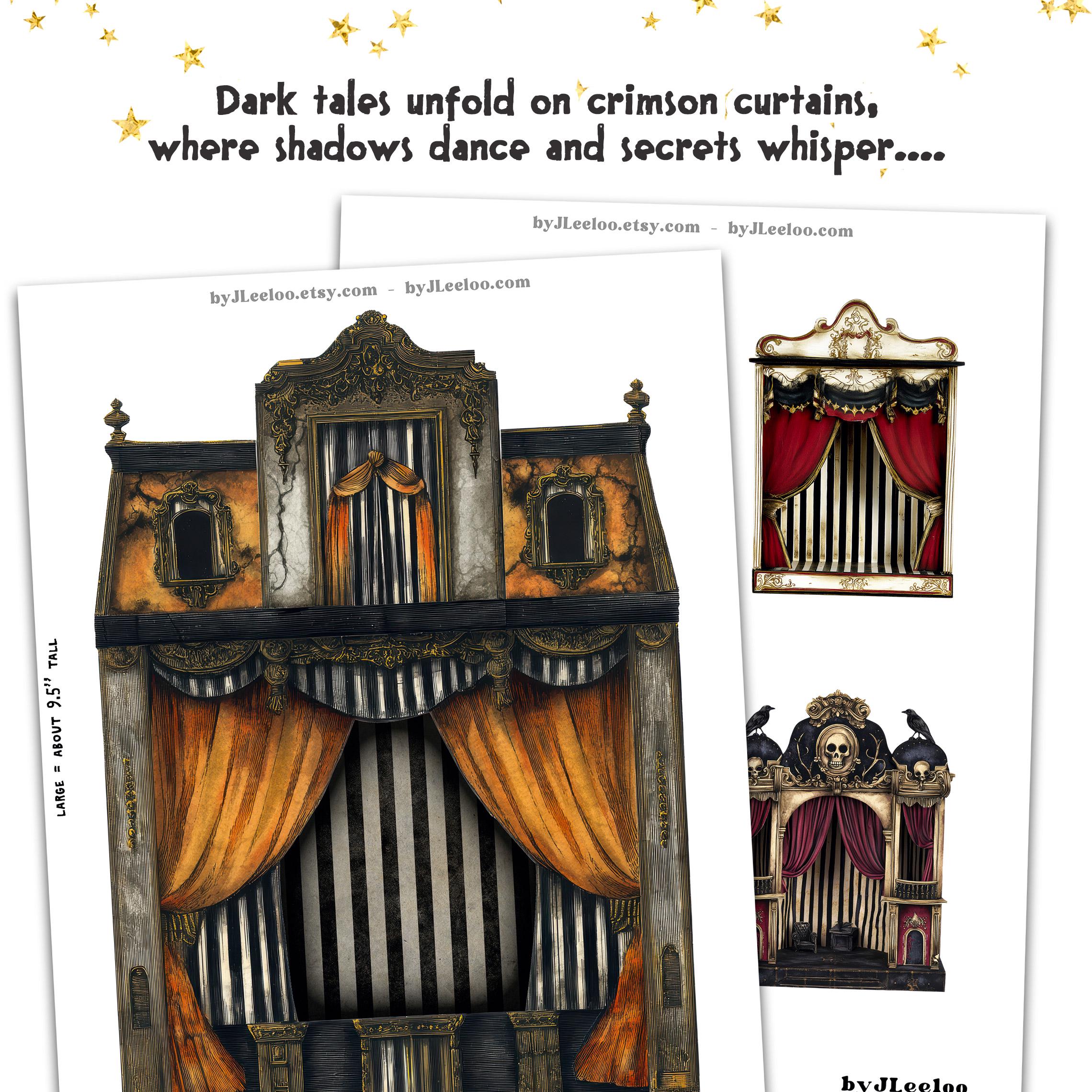 "Dark Theatre" is a collection of printable haunted theaters and gothic banners, perfect for crafting shadowy paper scenes, mysterious journals, or spooky dollhouse displays.