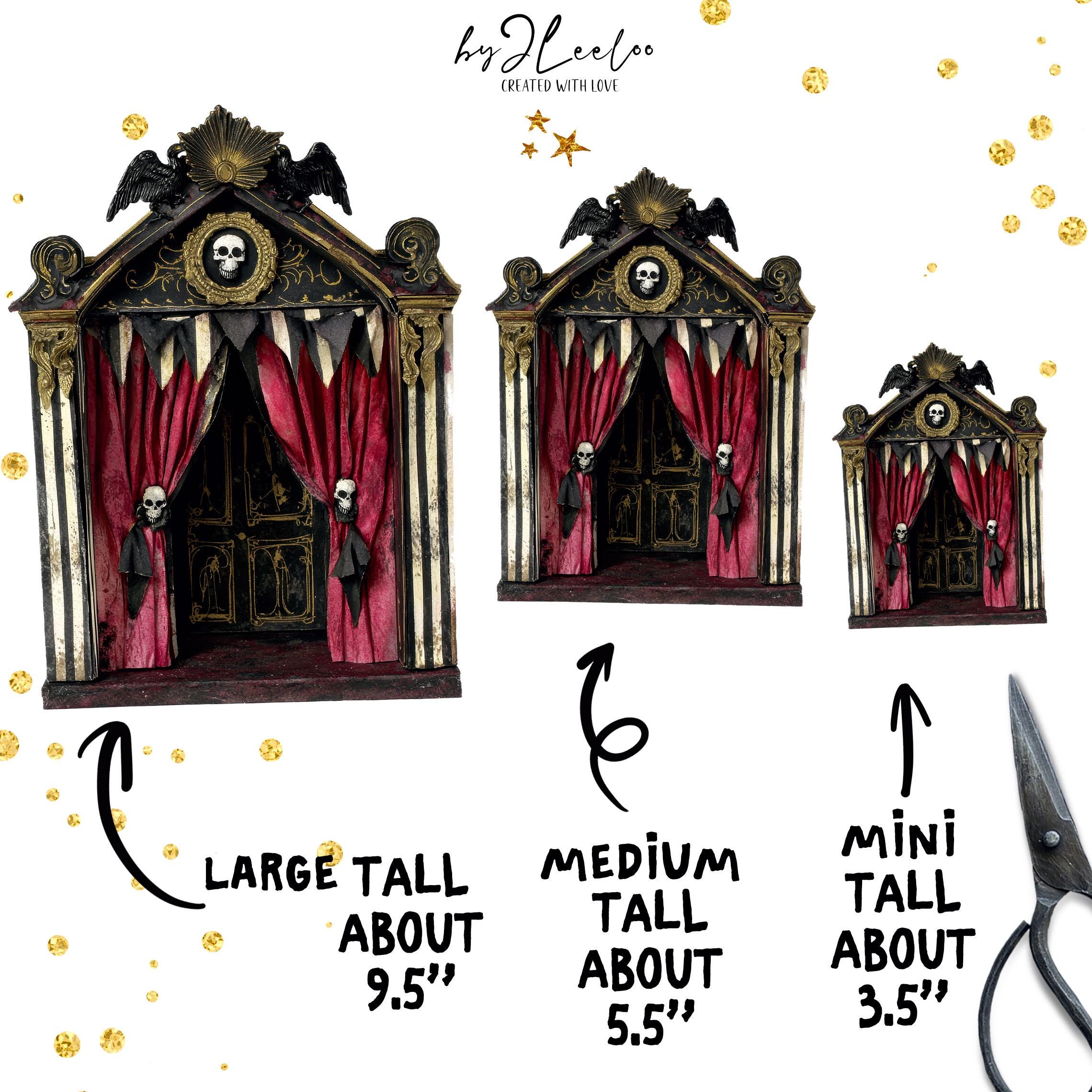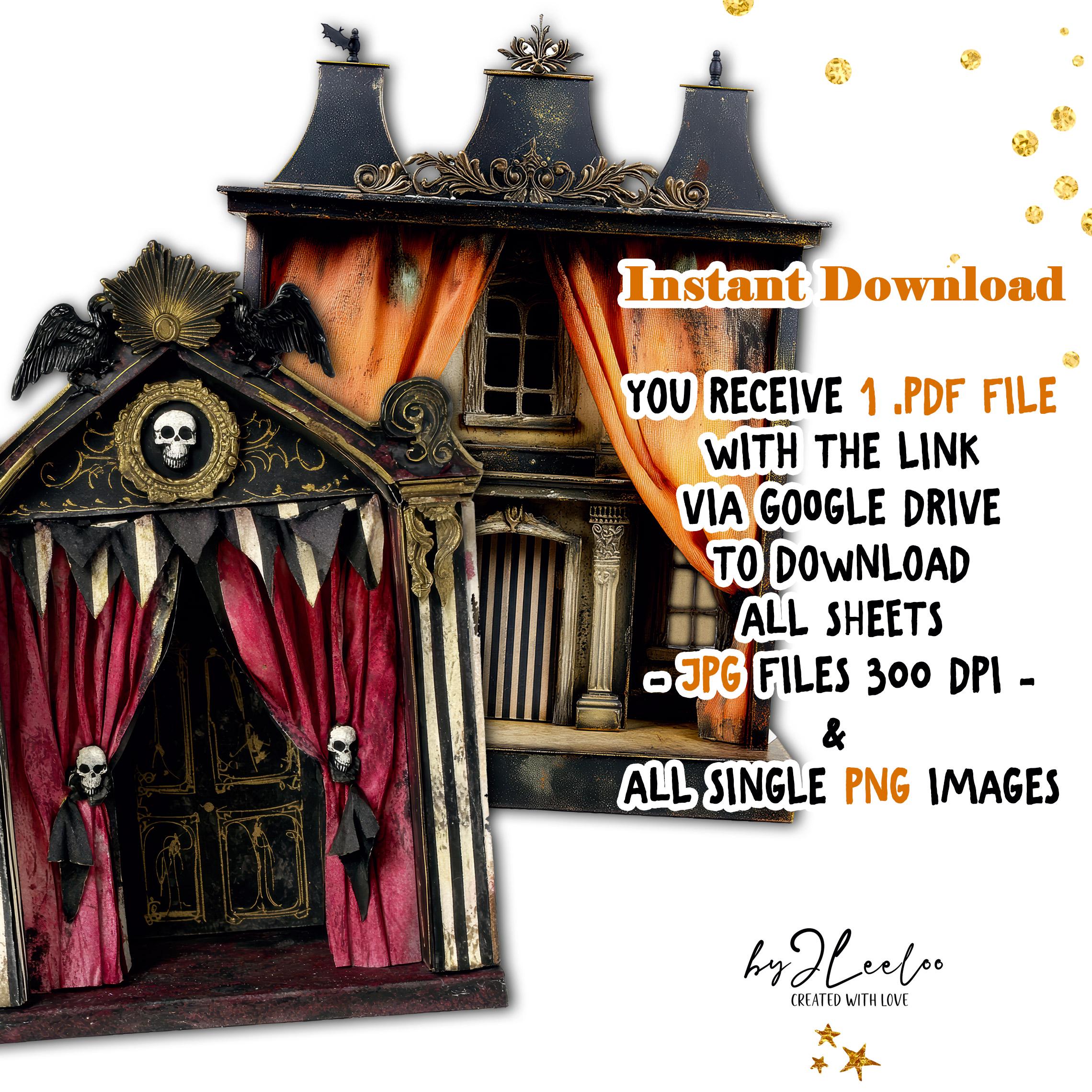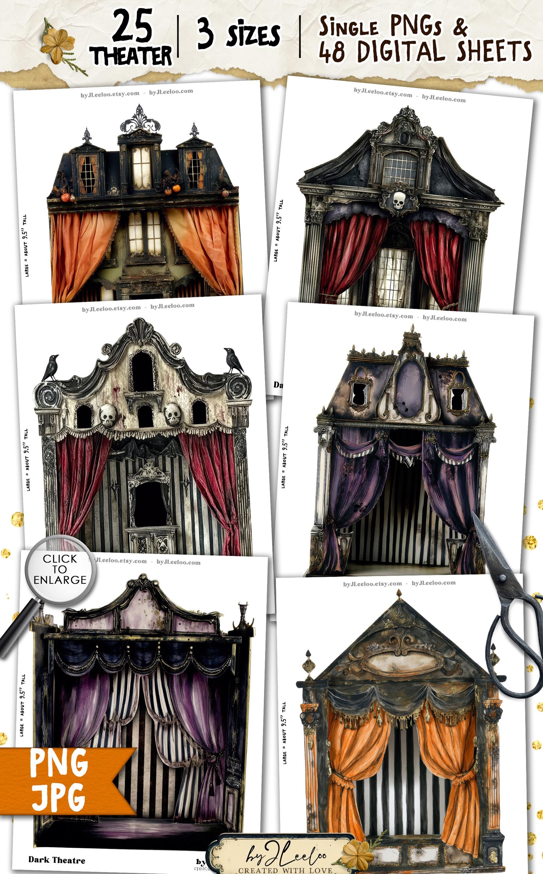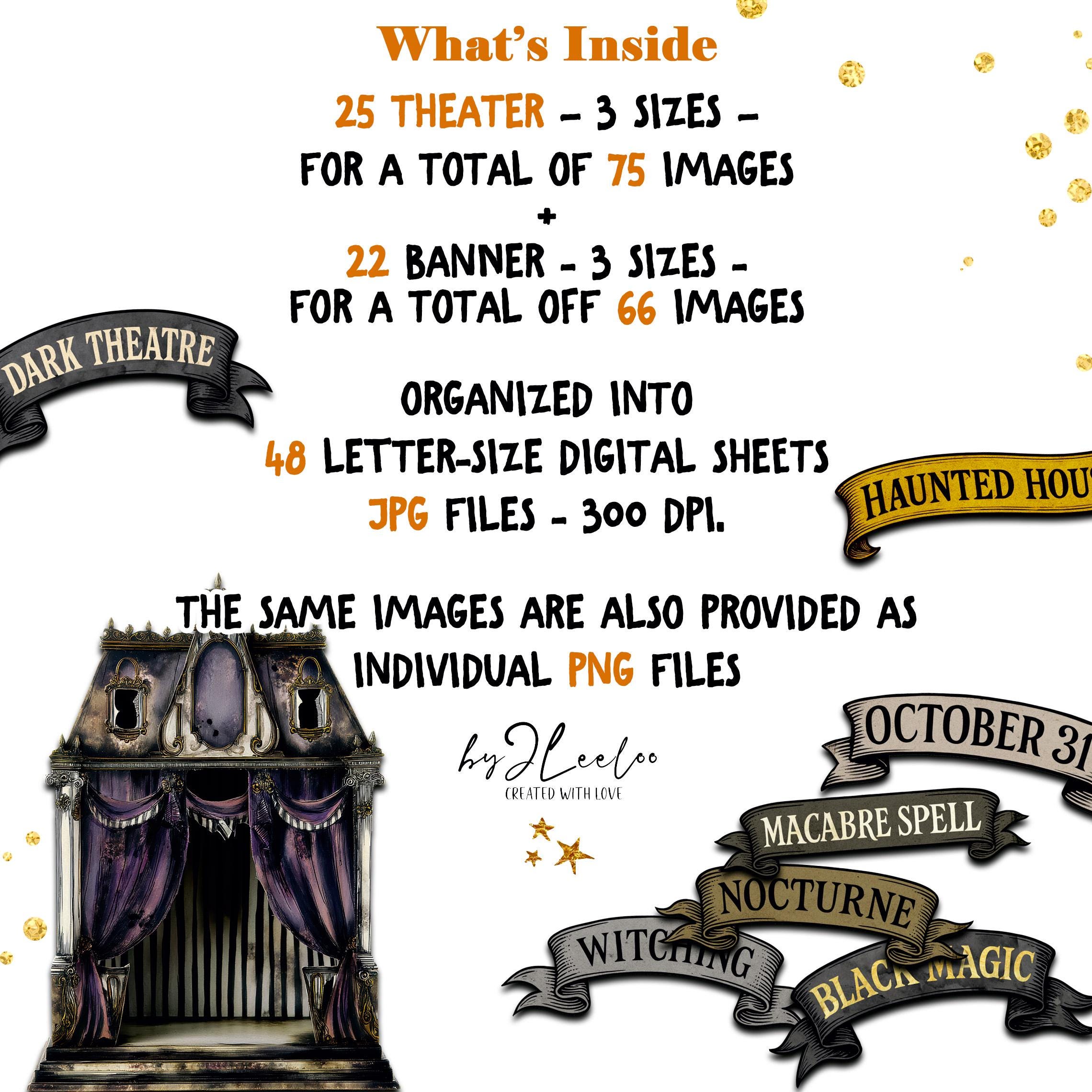 "Dark Theatre" is a collection of printable haunted theaters and gothic banners, perfect for crafting shadowy paper scenes, mysterious journals, or spooky dollhouse displays.