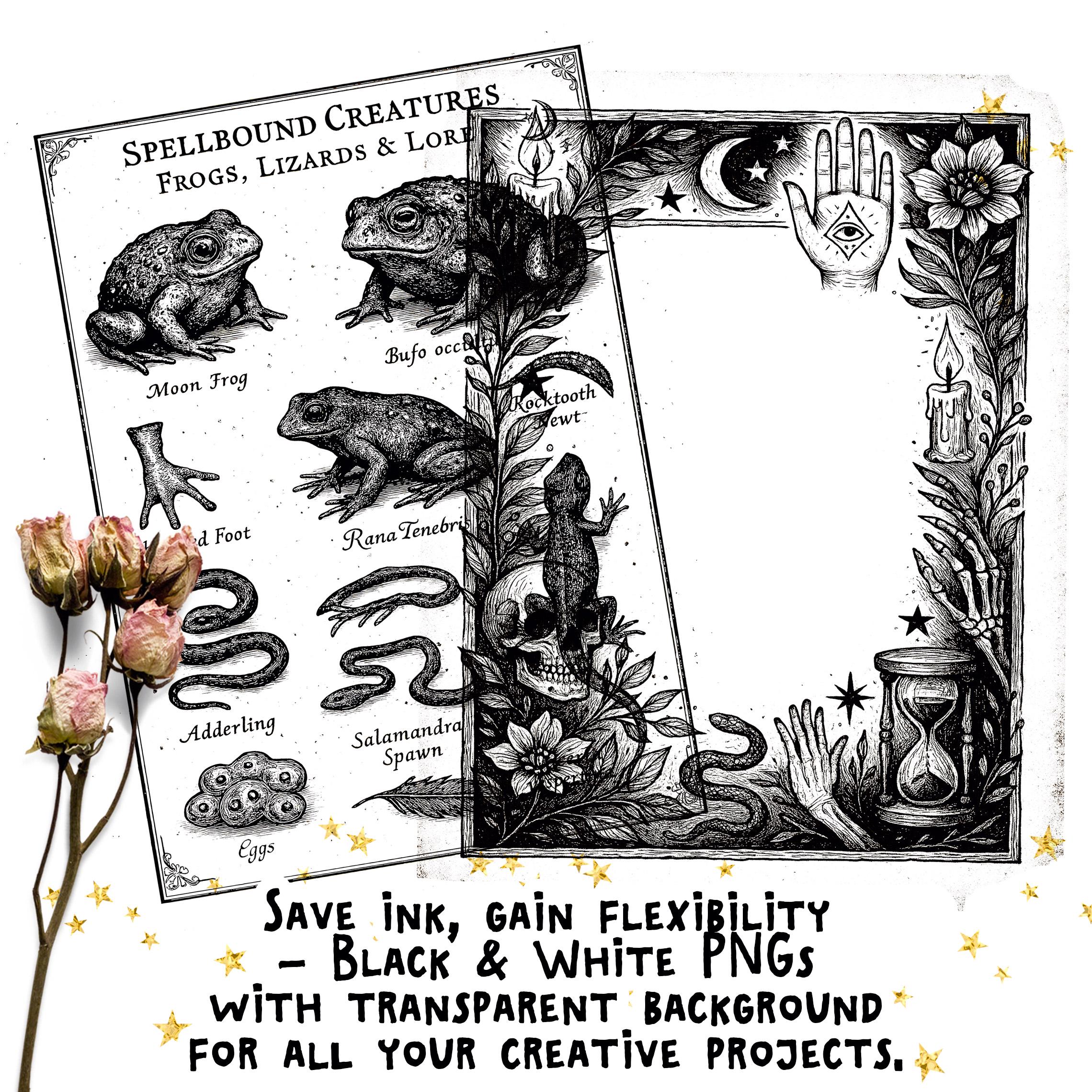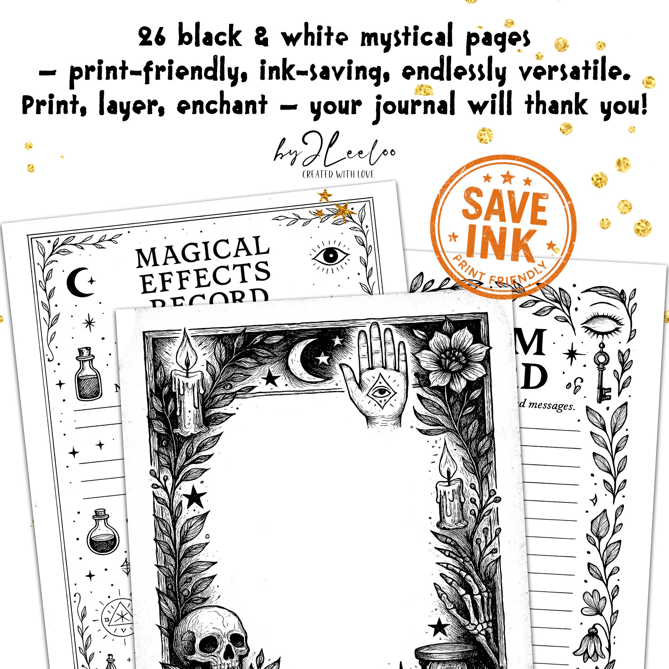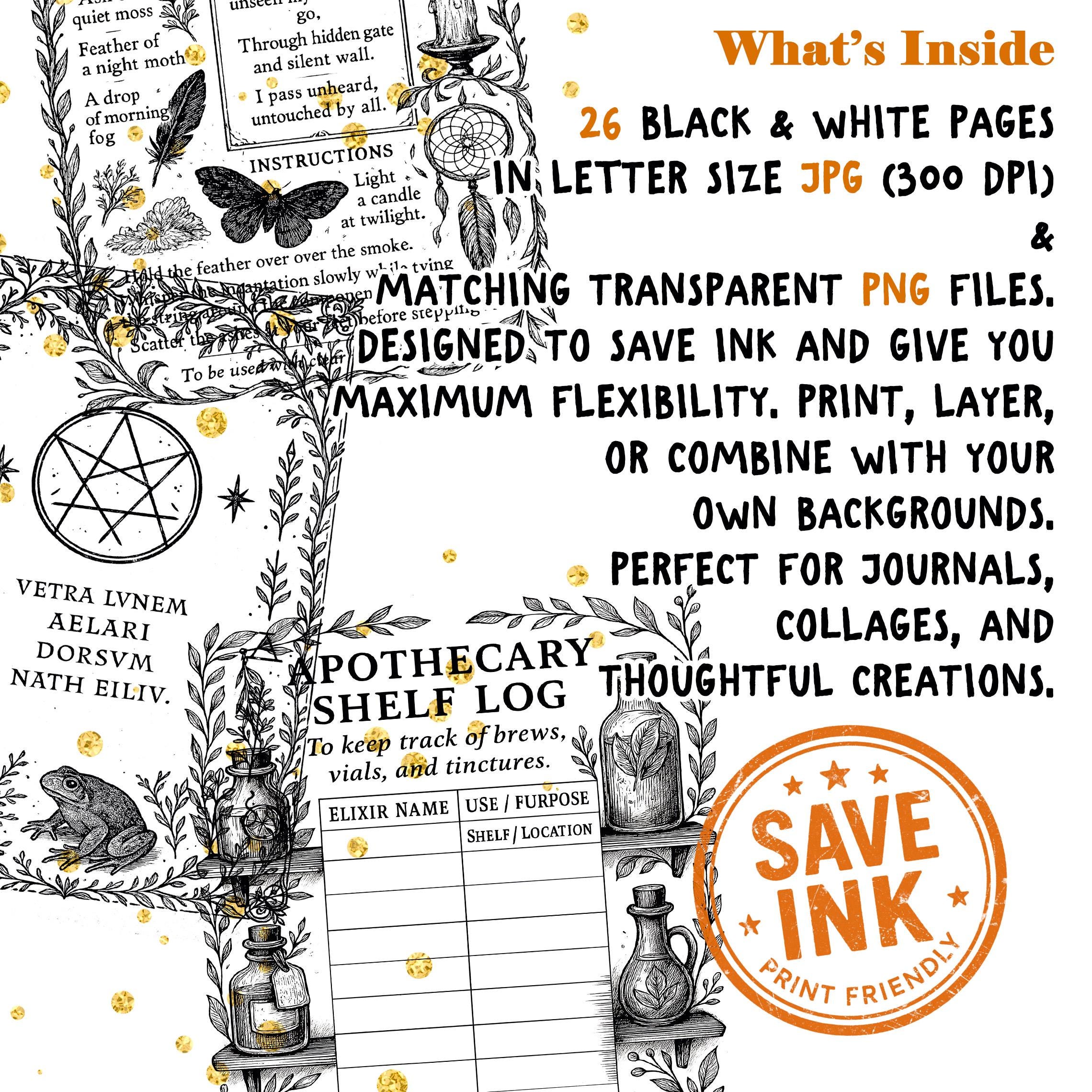 GRIMORIE β Black & White Journal Pages | 26 Mystical Sheets + Transparent PNGs | Ink-Saving Stamp Vintage Witchcraft Ephemera | pp972