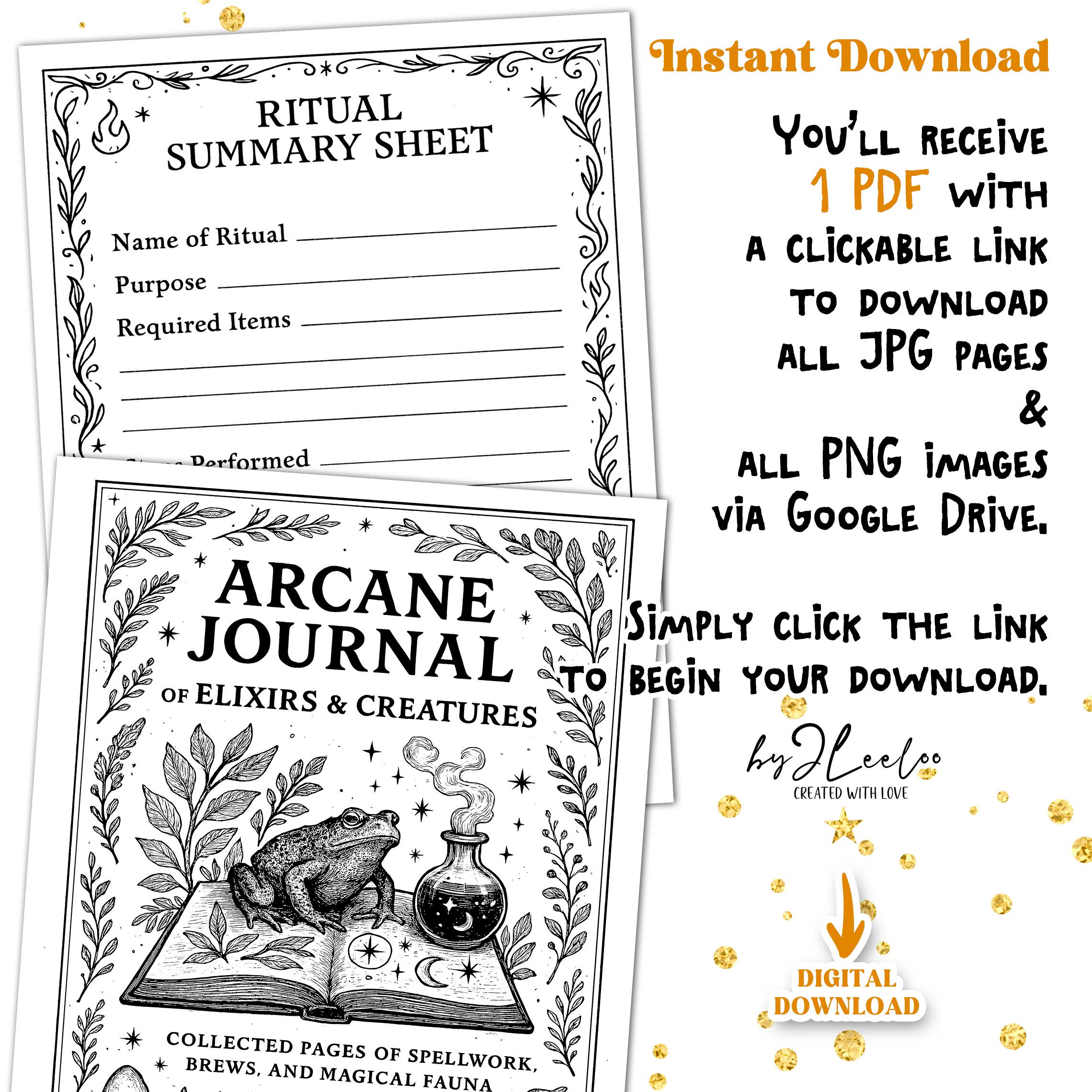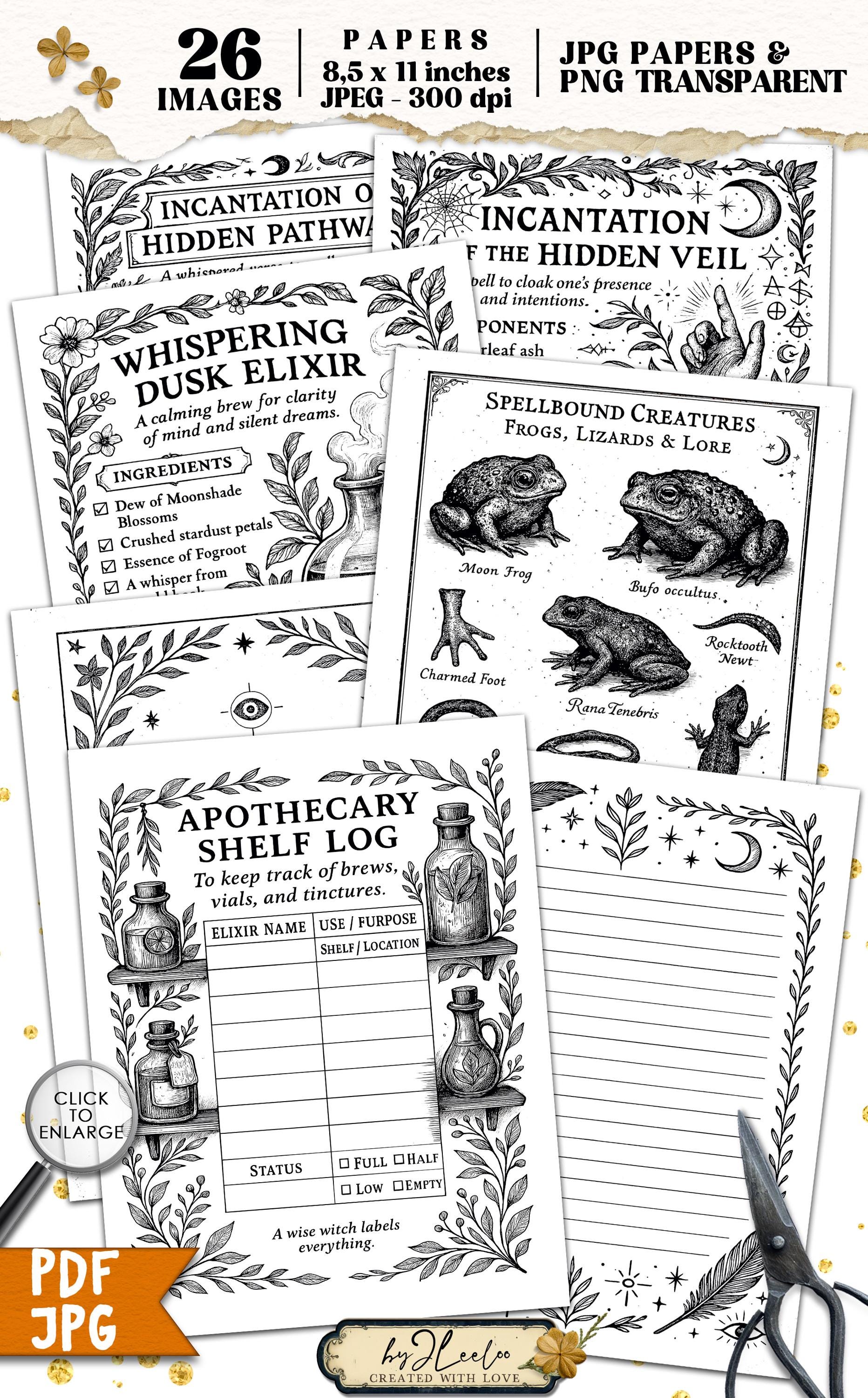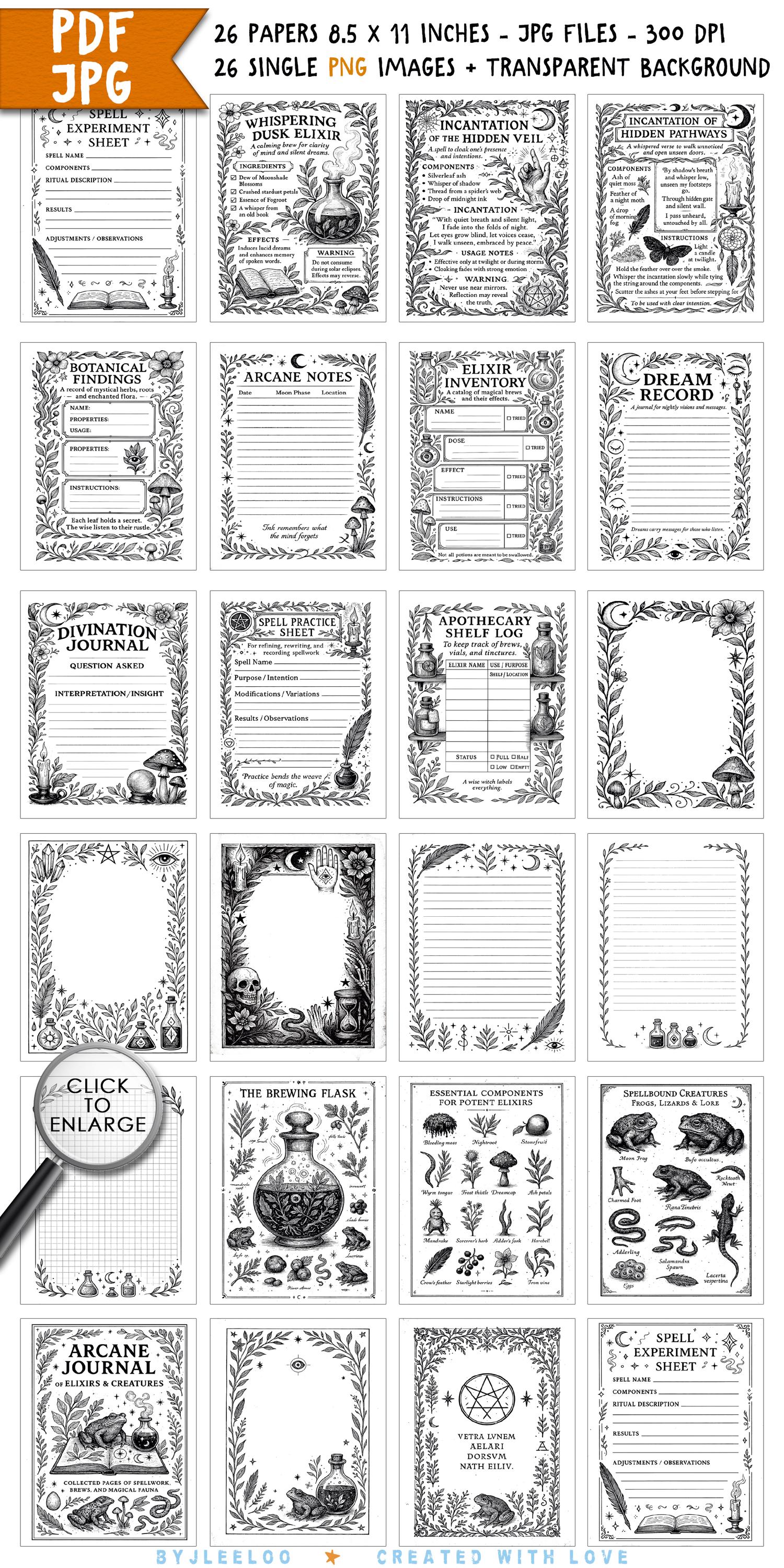 GRIMORIE β Black & White Journal Pages | 26 Mystical Sheets + Transparent PNGs | Ink-Saving Stamp Vintage Witchcraft Ephemera | pp972