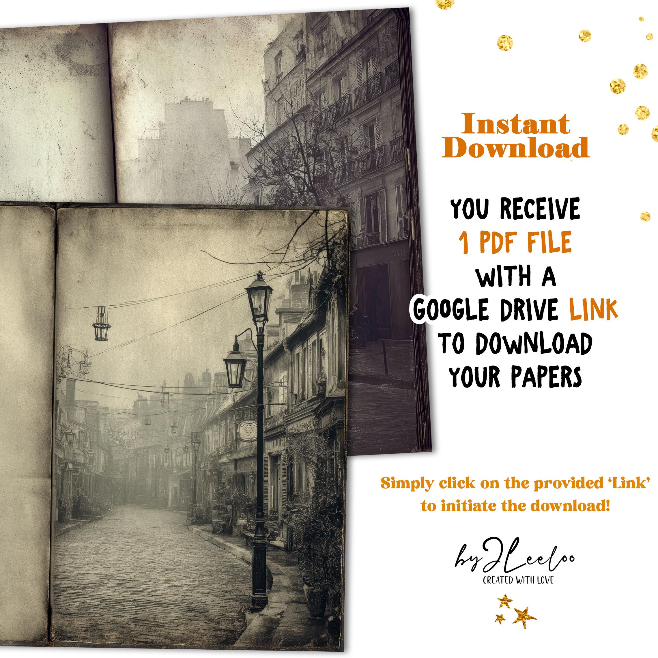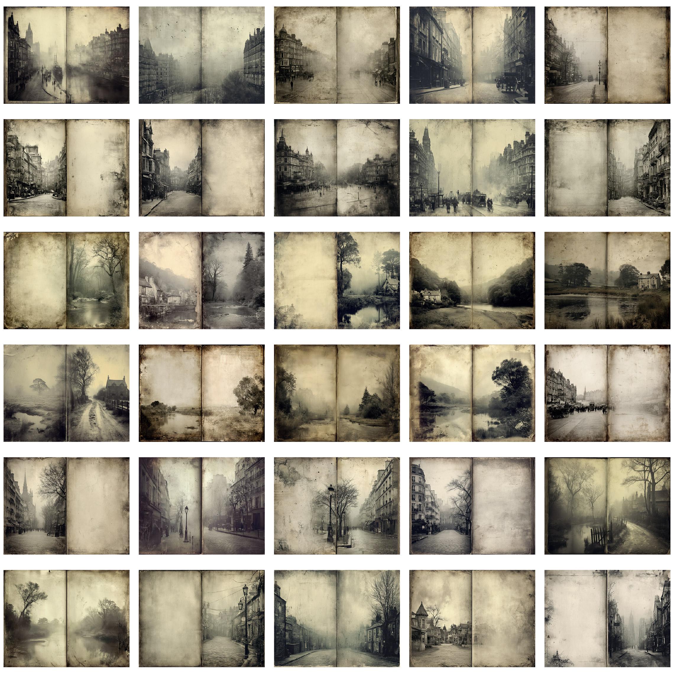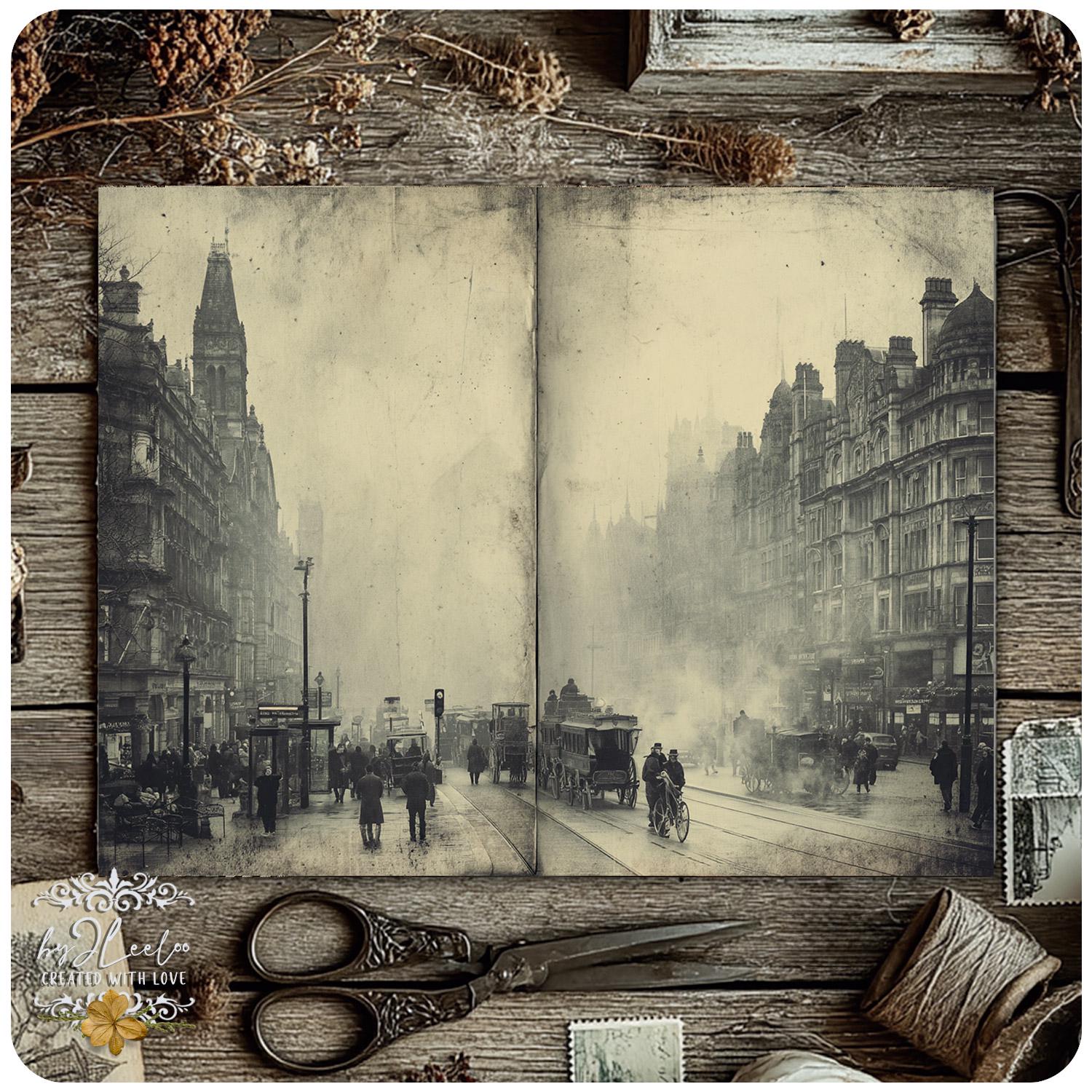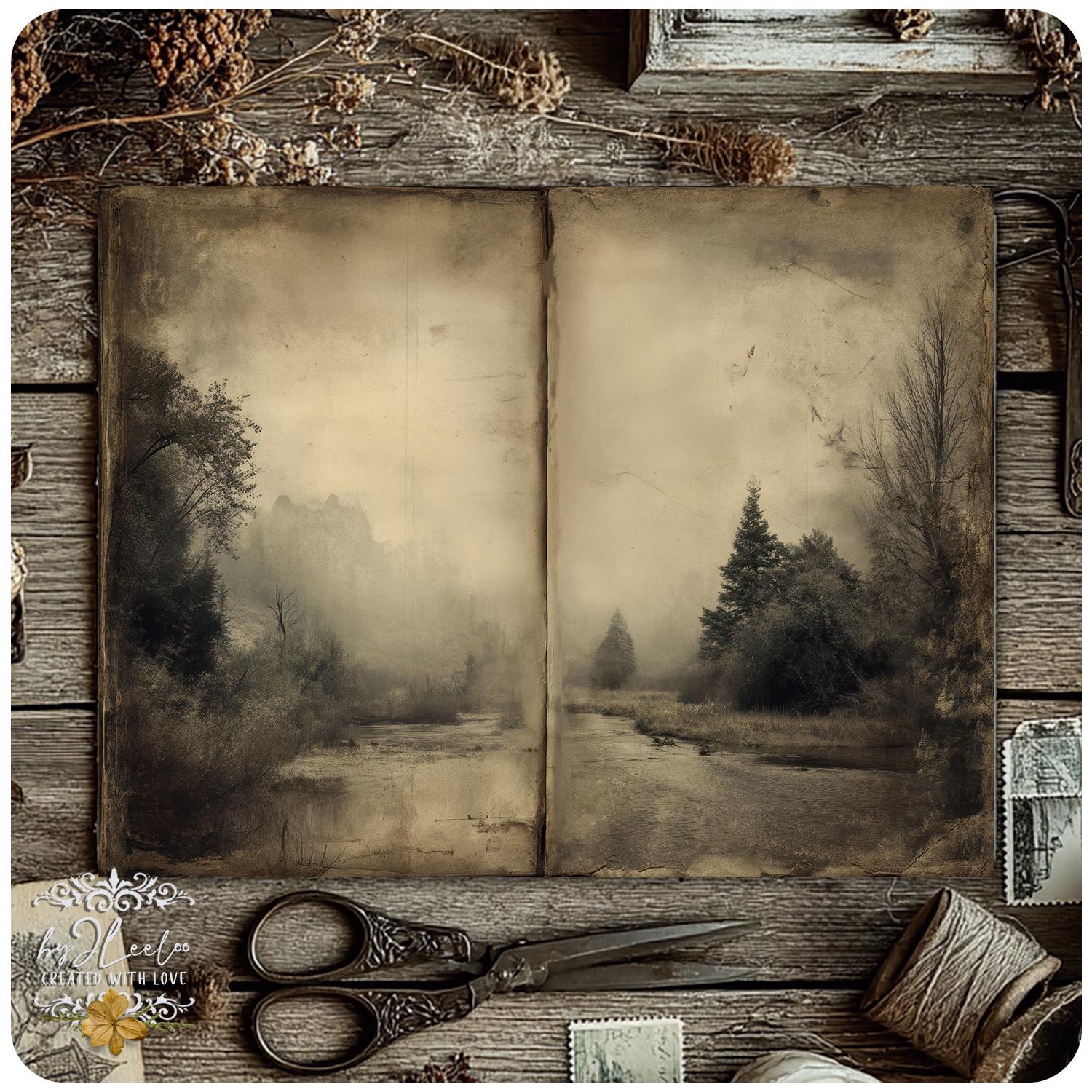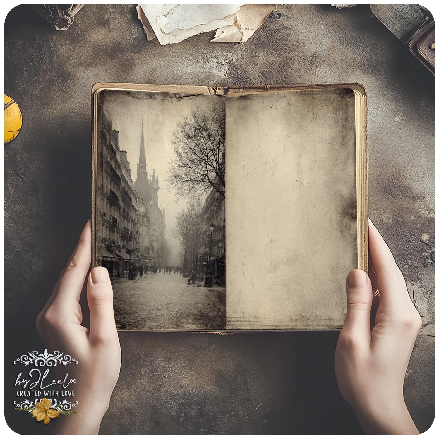 The Fogbound Chronicles unfold like a forgotten diary — 30 vintage double-page spreads where timeworn streets and hazy silhouettes linger as echoes of memory. Perfect for junk journals, scrapbooks, or any project that longs for a touch of mystery and nostalgia.