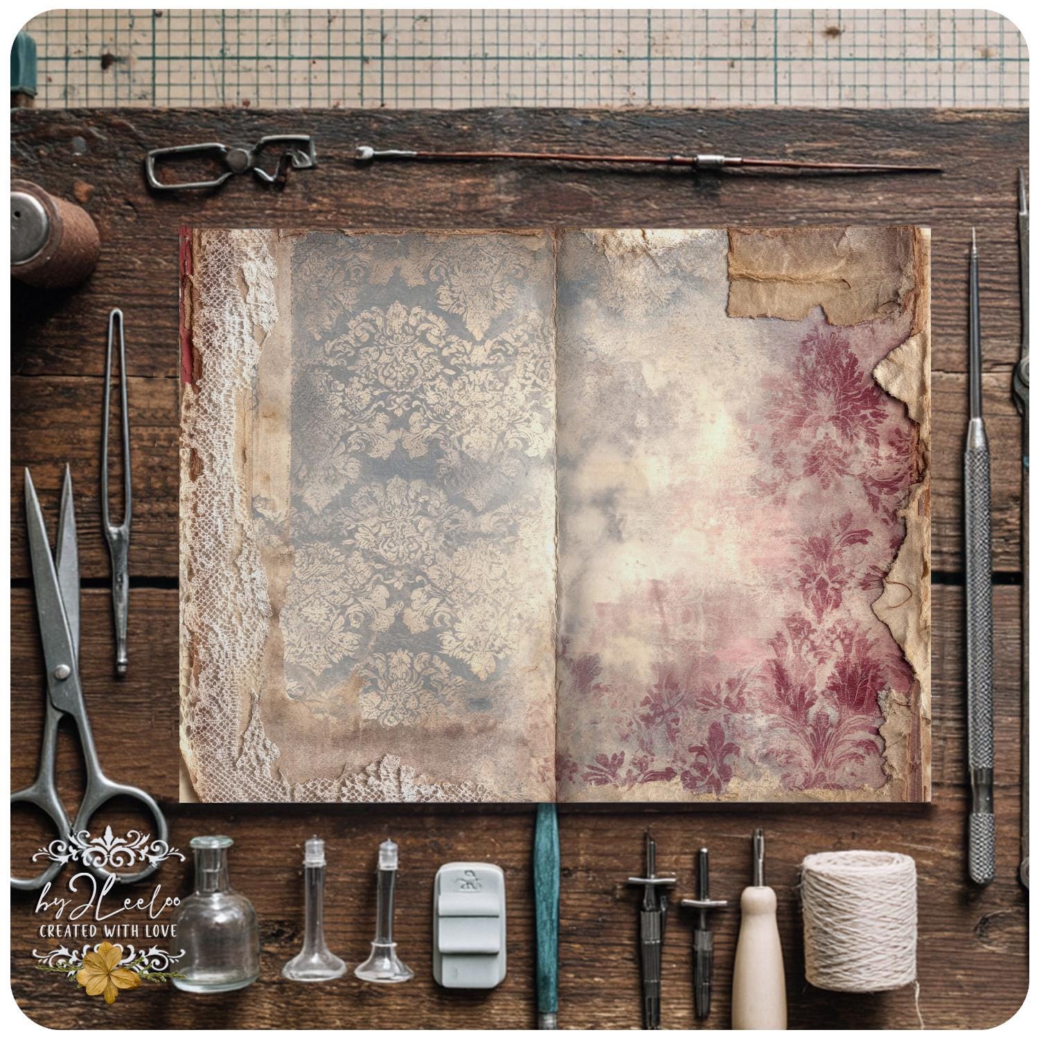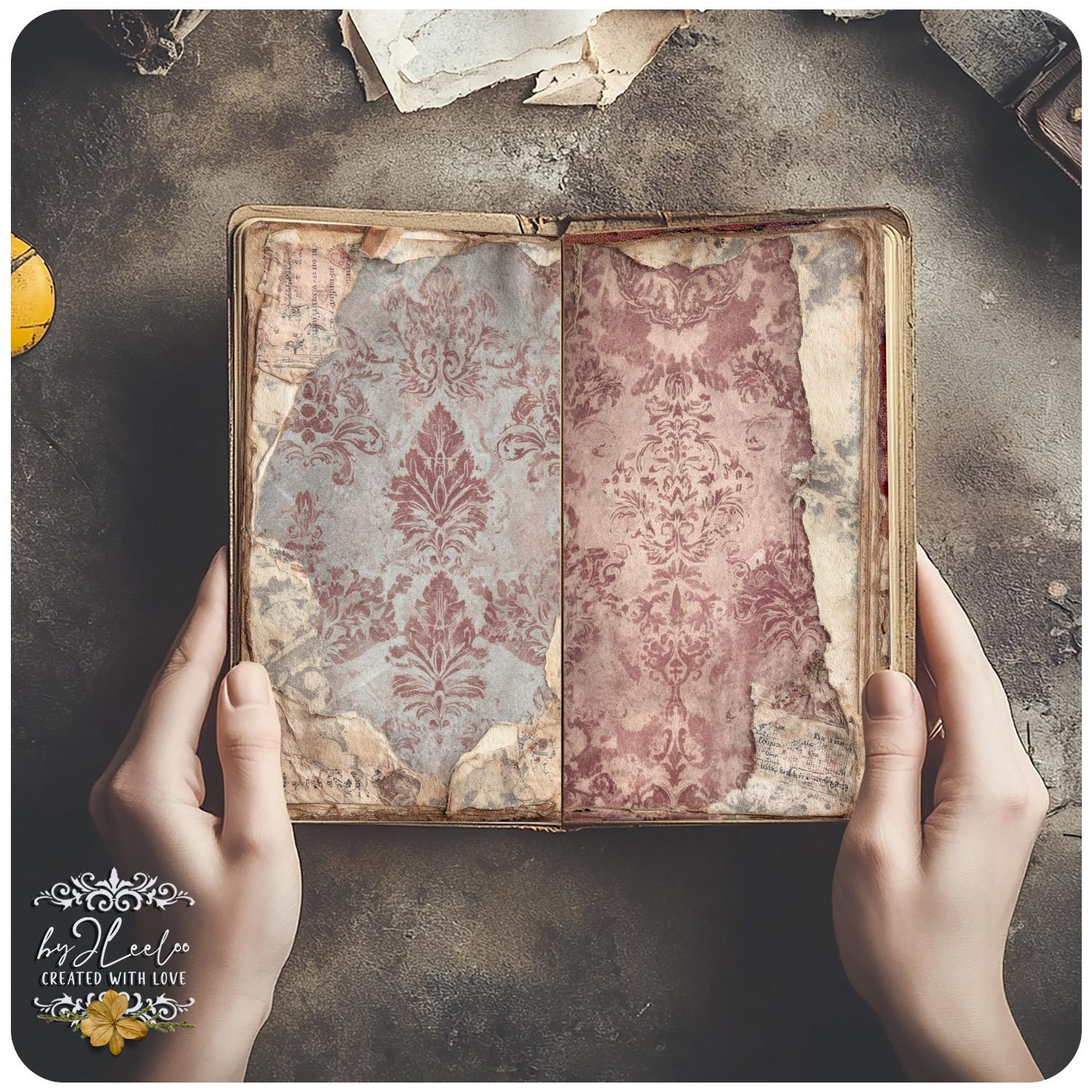 These softly decayed textures combine elegance and mystery, blending torn damask patterns, worn fabric, and the quiet glow of aged paper.