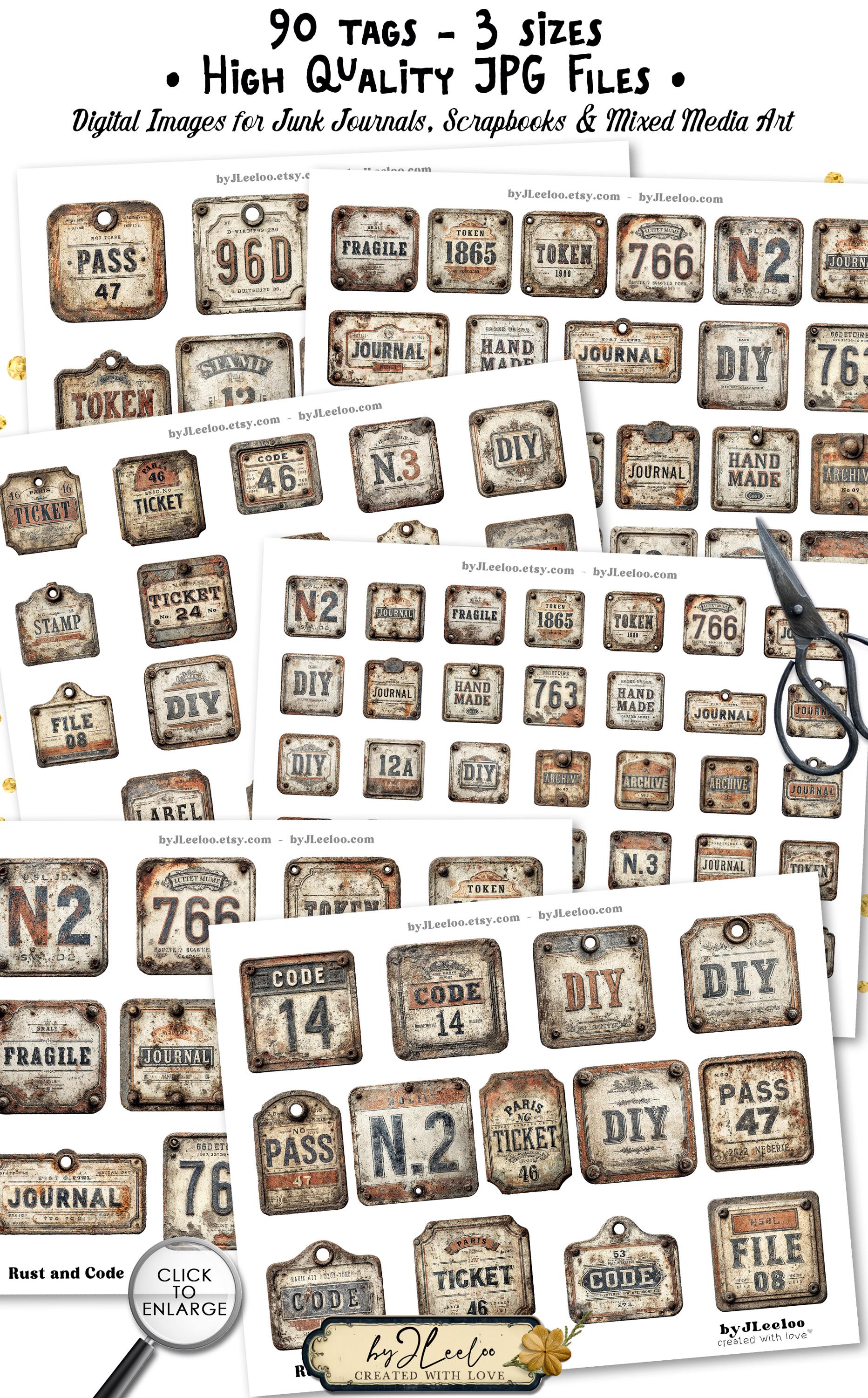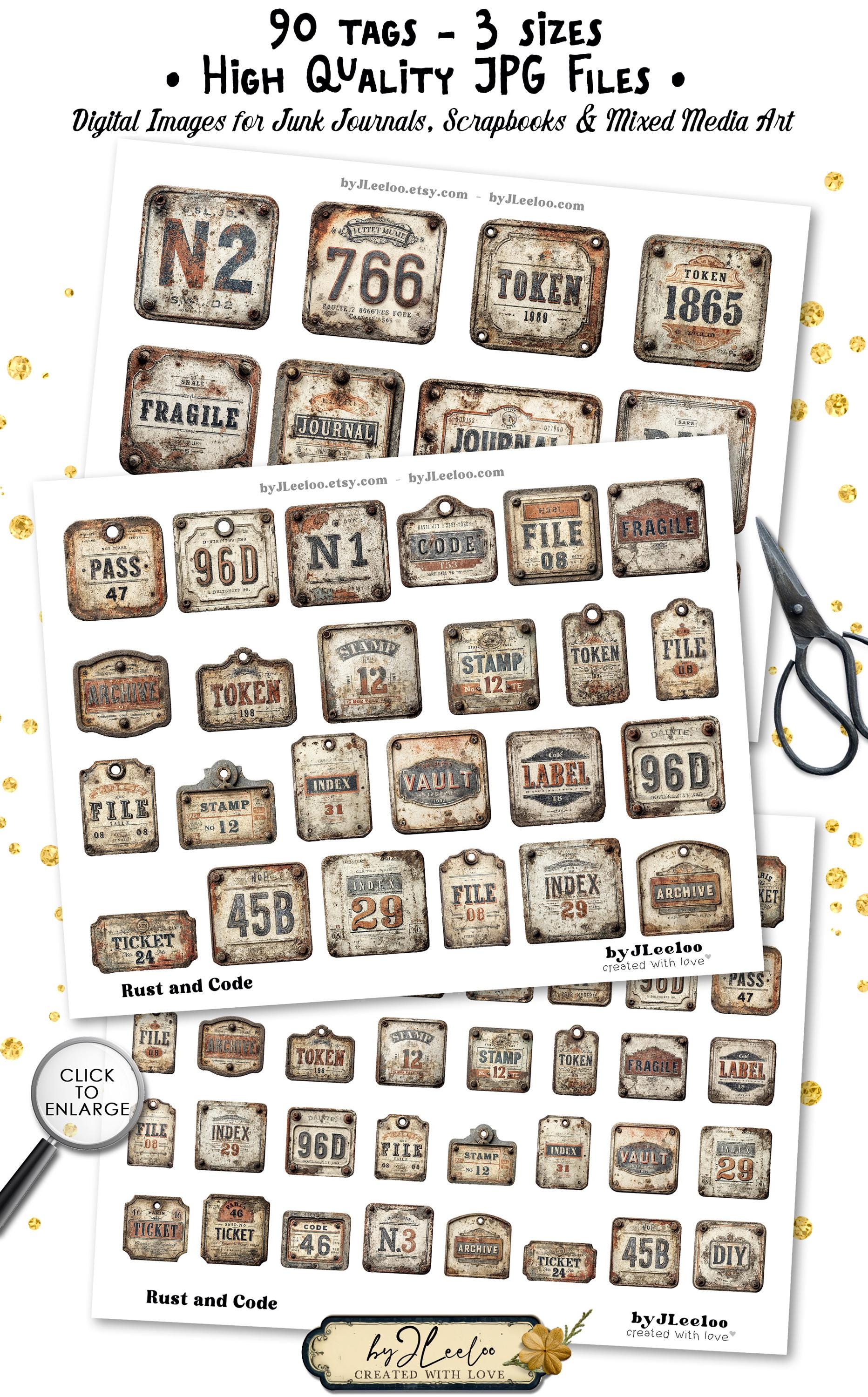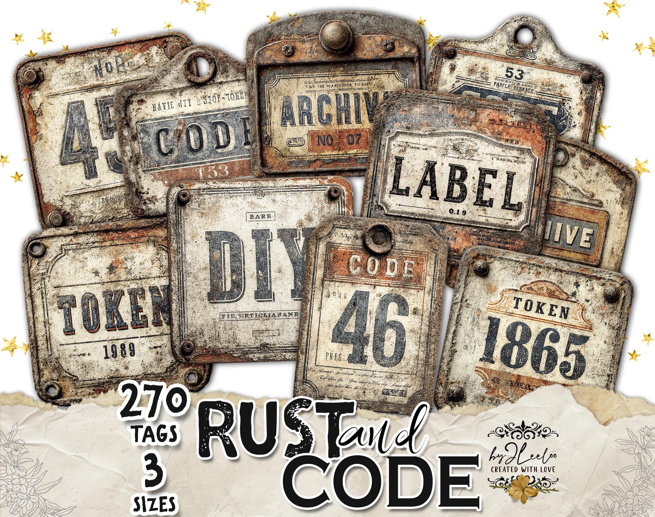 RUST and CODE – 90 Industrial Vintage Tags | Printable Metal Labels & Typographic Plates for Junk Journals, Scrapbooks & Crafts CU | tl356