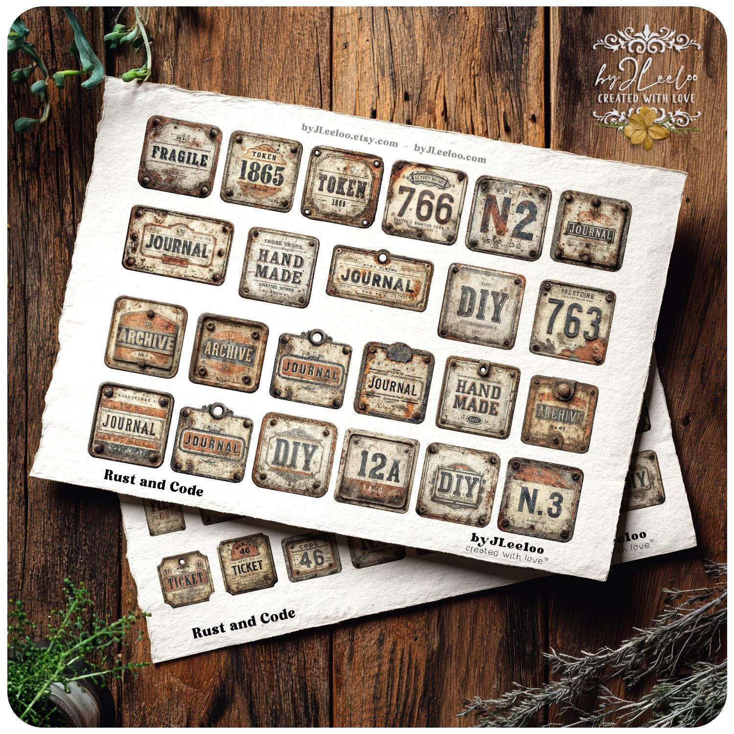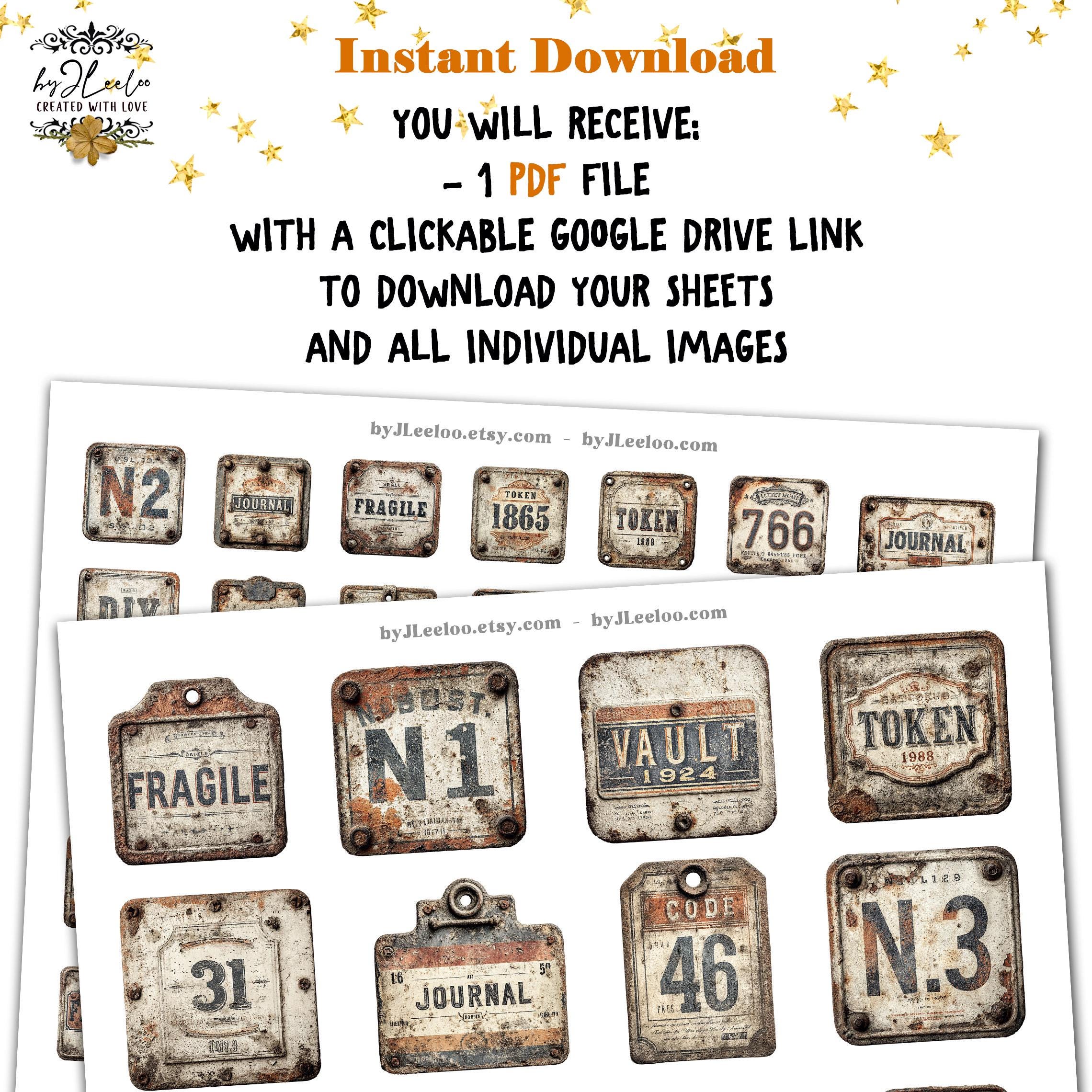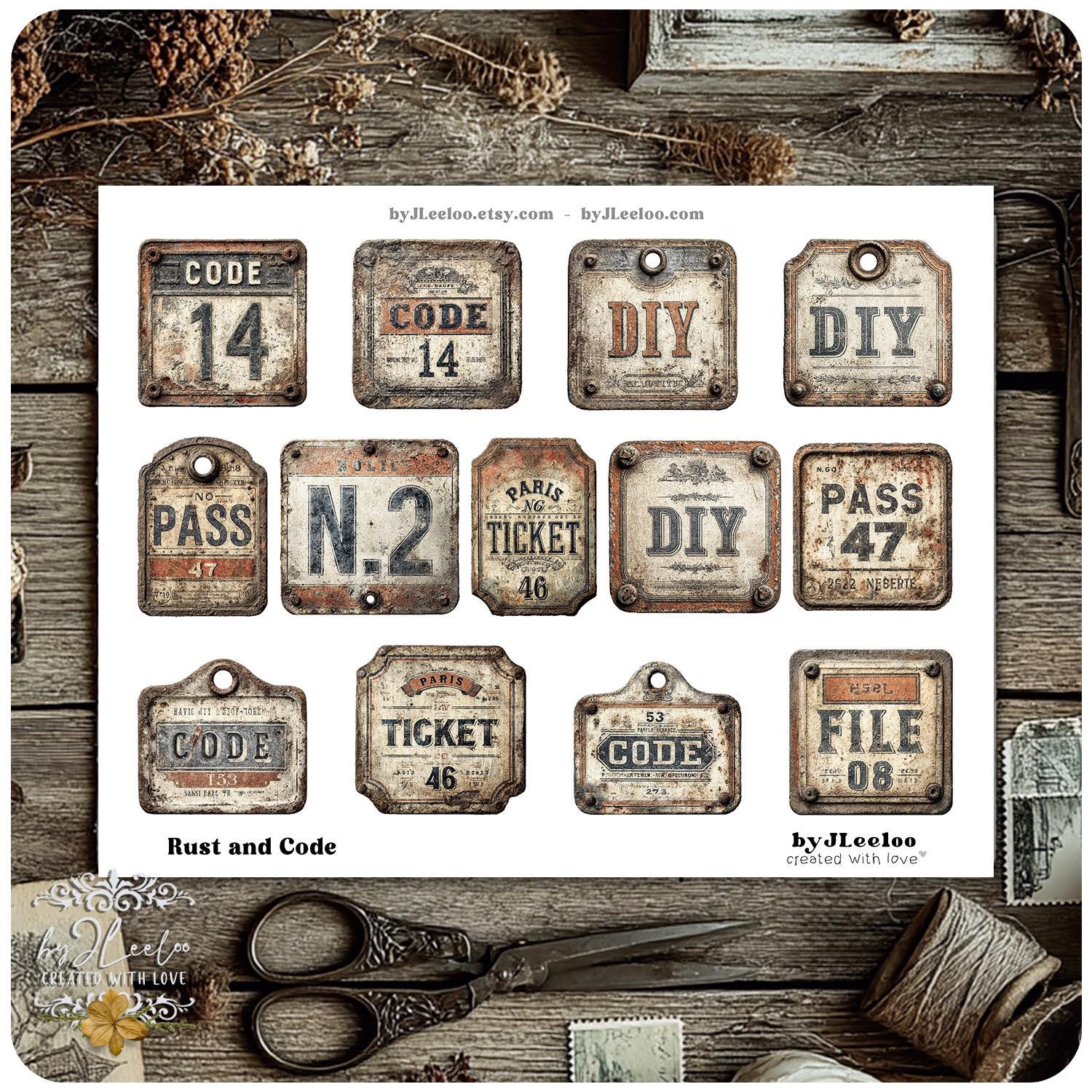 RUST and CODE – 90 Industrial Vintage Tags | Printable Metal Labels & Typographic Plates for Junk Journals, Scrapbooks & Crafts CU | tl356